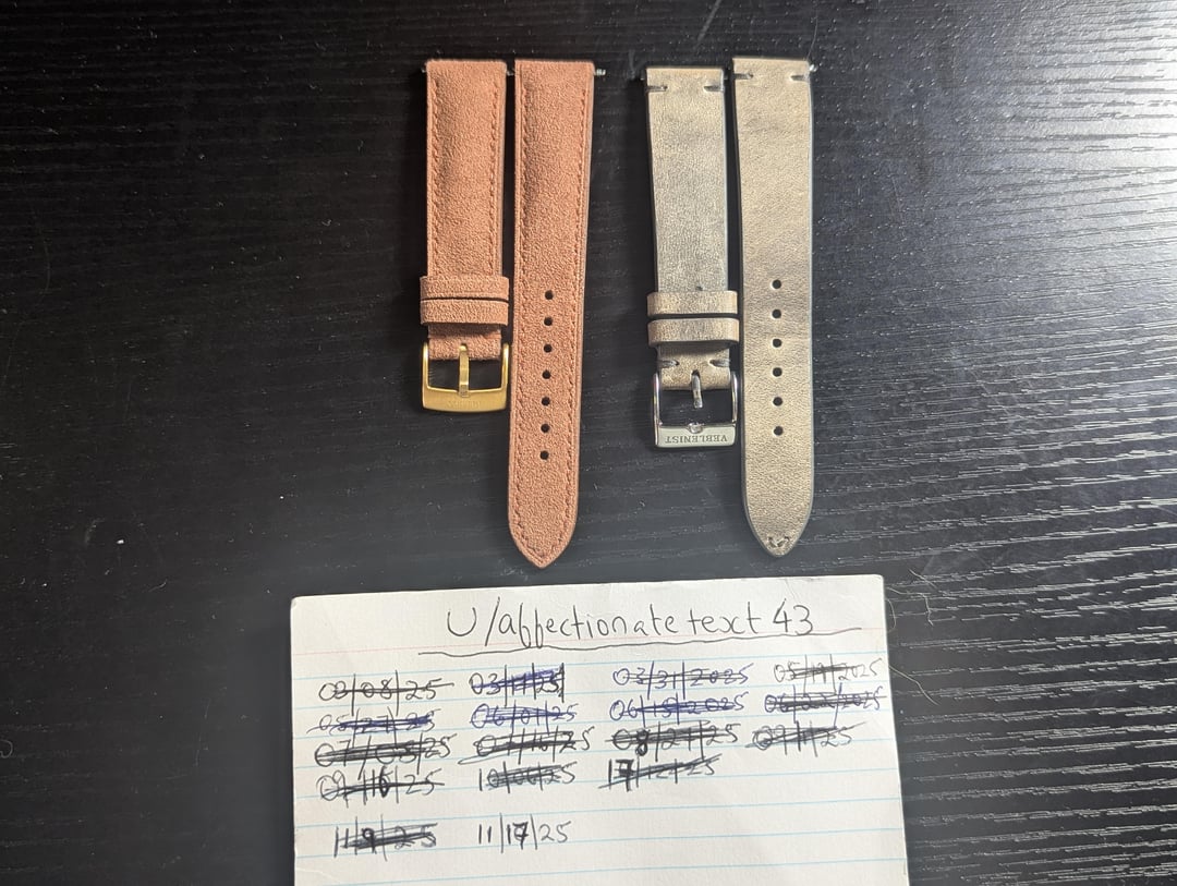 Hi all! Up for sale are these two **18mm straps from Delugs and Veblenist.** **They are both Like New and Unworn!** **Delugs brown Alcantara signature "Teddy Bear" New and Unworn: Price $75 (retail $110)** Link: [brown Teddy Bear ](https://delugs.com/products/brown-alcantara-leather-signature-watch-strap?srsltid=AfmBOopHSNwr4eAux51aYmImEW-7DkuSVgBMYD9FB2iGcB9uvknDp0DW) **Veblenist "Smoke" New and Unworn: Price $80 (Retail $125)** Link: [Smoke](https://veblenist.com/products/smoke-watch-strap?srsltid=AfmBOooWJZYBuLwu4VAcDPlo7Rif5NysVWuEzCowLiNXcXUr6PIOIL1n) Happy to answer any questions! **Check out my other strap sales!**