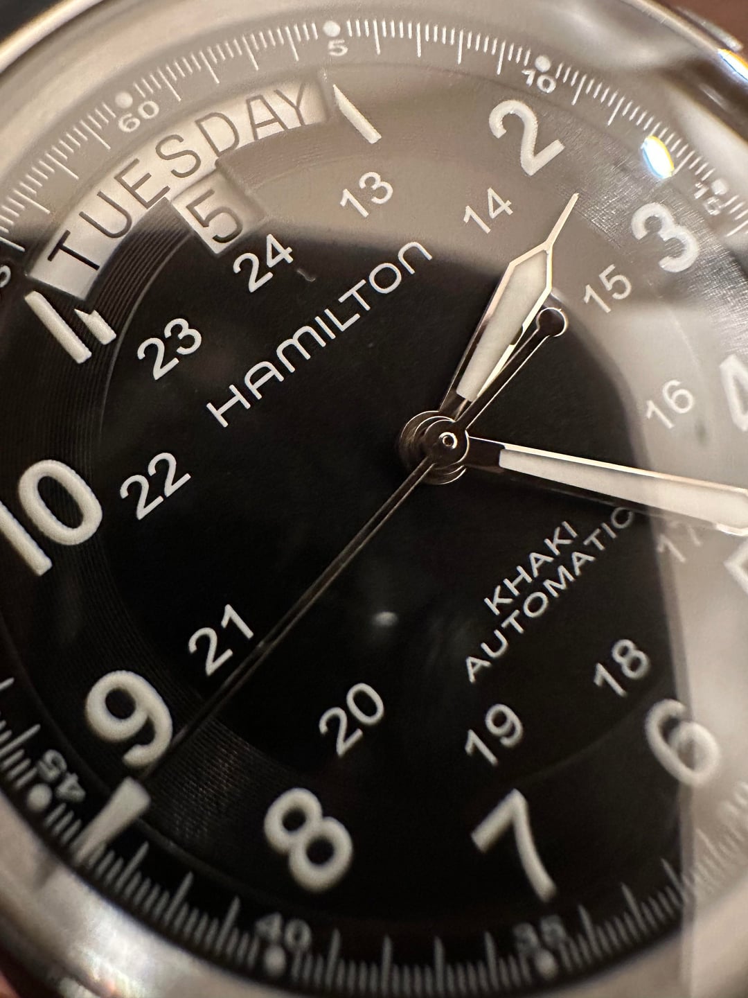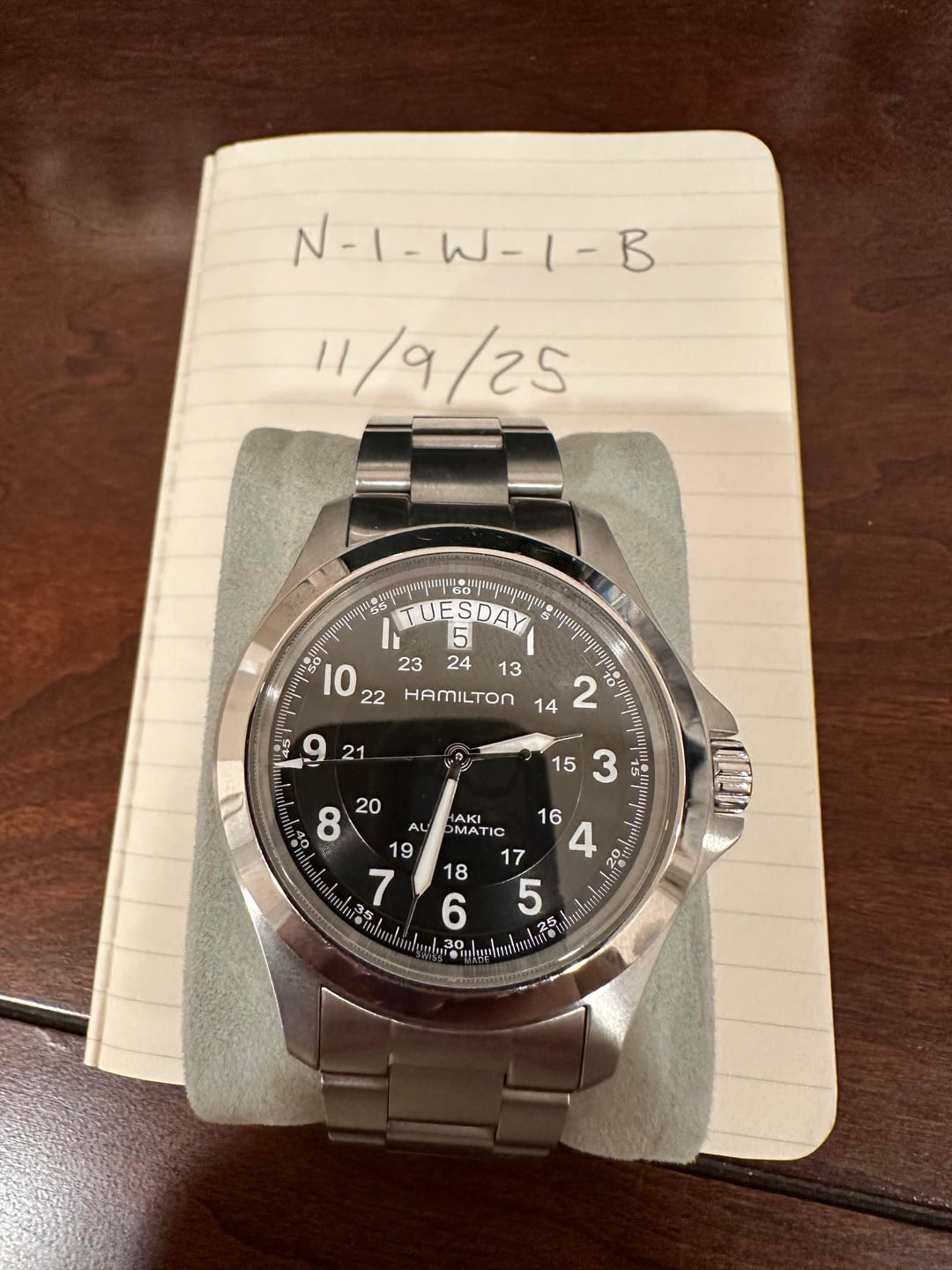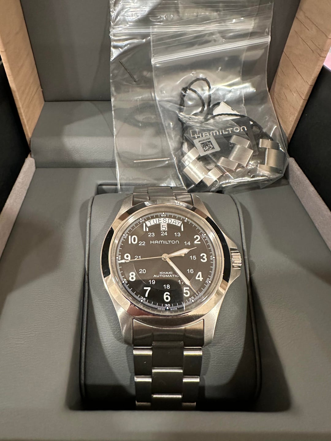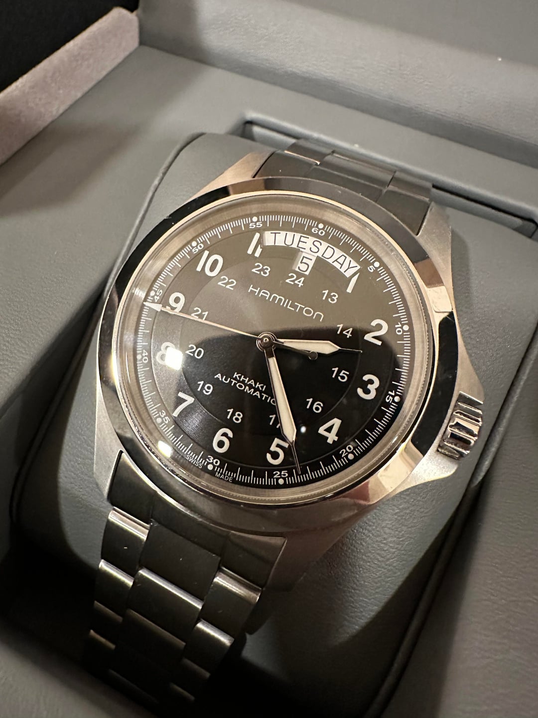 Up for sale is my Hamilton Khaki Field King Automatic, a fantastic everyday field watch that just doesn’t get enough wrist time in my rotation. Hoping it finds a good home. Condition: Excellent. Light desk wear on the clasp and bracelet but nothing noticeable on the case or crystal. Runs great and keeps good time. Specs: Case size: 40 mm Case thickness: \~11 mm Lug width: 20 mm Movement: Hamilton H-40 automatic (day/date, 80-hour power reserve) Crystal: Sapphire Water resistance: 50 m Lug-to-lug: \~49 mm Bracelet: Stainless steel bracelet with signed clasp Dial: Black with day/date window at 12 o’clock **Asking** **~~$625~~** **$540 + Shipping** to US. Comes with original box and papers. Open to trades.