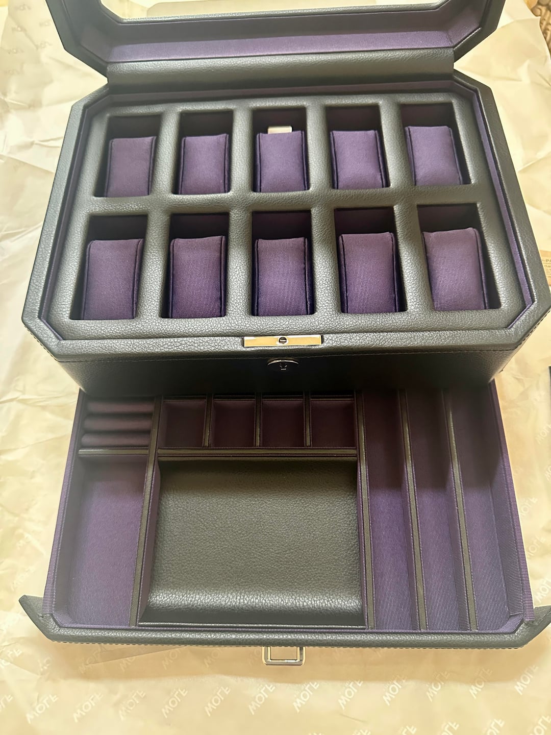 Windsor 10 pc box with drawer. Features chrome finished hardware, locking glass cover, smooth vegan leather and 10 pc watch and jewelry storage. Color - Black/Purple Link Condition - BNIB, with original packaging $175 each, shipped CONUS Zelle (preferred), PayPal FF