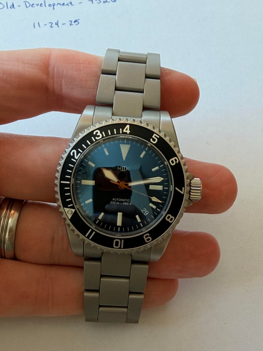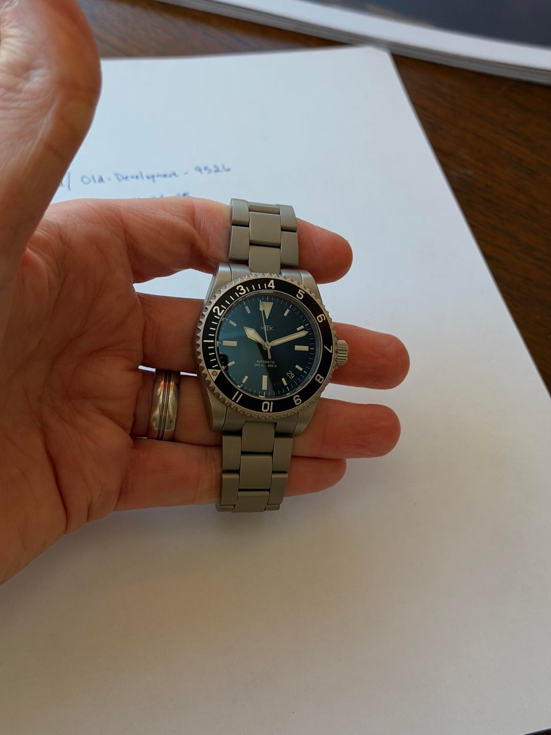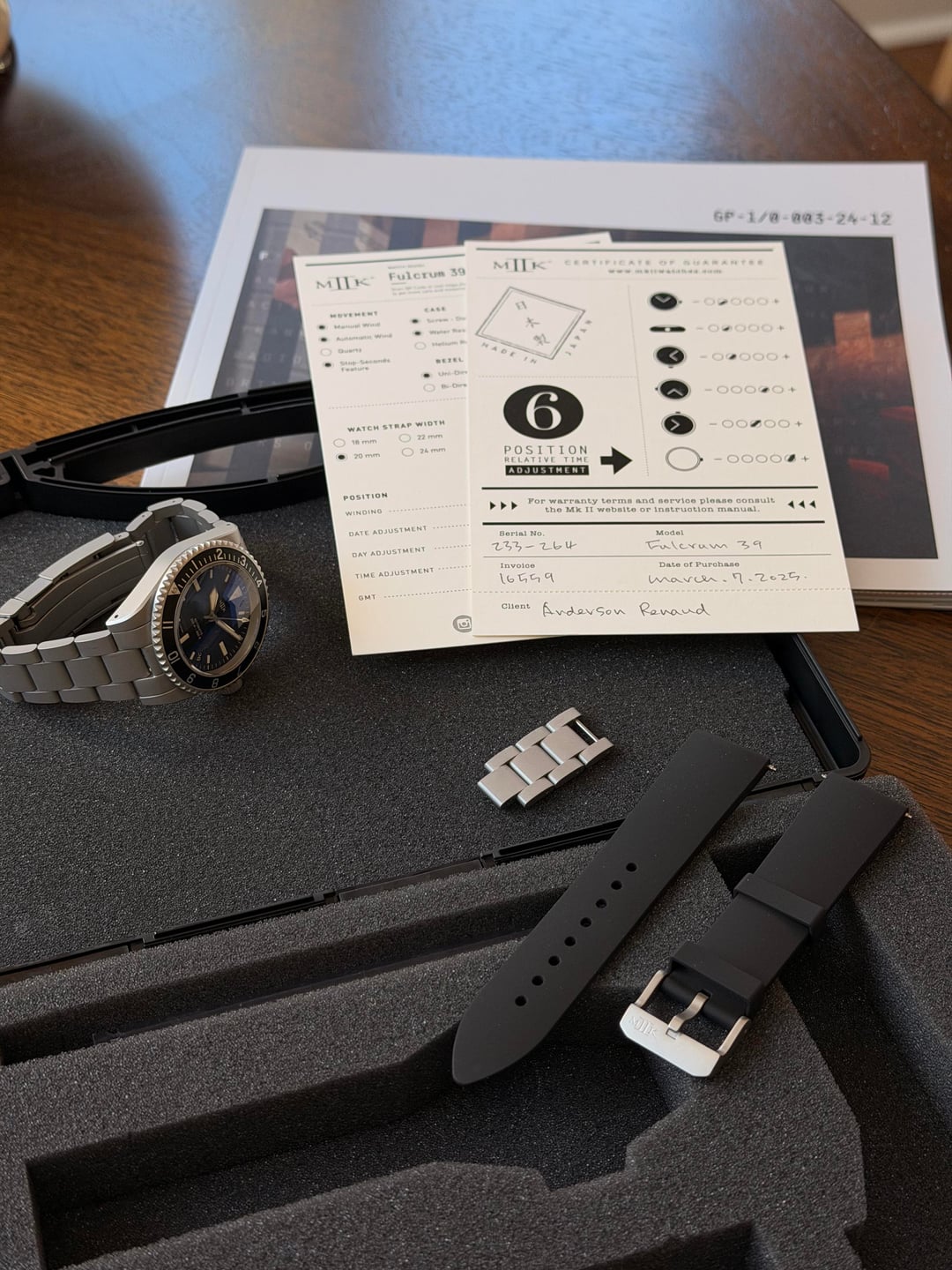 Selling my Mk II Fulcrum 39. 12-hr bezel with date version. Selling for $1200 OBO. This watch has been sold out, and any re-stock is gone in minutes. I am the original owner. And it comes with everything shown. A few marks in the sandblasted finish that I tried to capture in pics. Zelle preferred. Please reply to post before chat. And let me know if any questions.