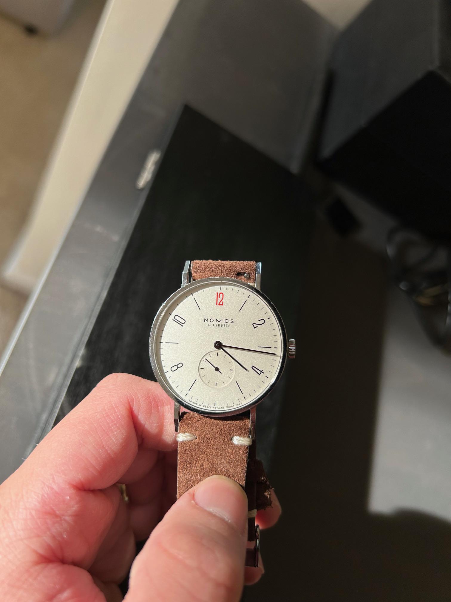 **Up for sale is my Nomos Tangente 38 – 50 Ans De Médecins Sans Frontières**, a meaningful limited edition of 2,021 pieces created to commemorate the 50th anniversary of Doctors Without Borders. **About This Watch:** This is the 10th year edition of Nomos's collaboration with MSF, distinguished by the iconic red 12 o'clock numeral and the French inscription "50 ans de Médecins Sans Frontières" at 6 o'clock. When new, €100 from each sale was donated to emergency aid efforts. **Specifications:** * **Reference:** 165.S50 * **Case Size:** 37.5mm diameter x 6.7mm height * **Case Material:** Polished stainless steel * **Movement:** Nomos Alpha caliber (hand-wound, in-house) * **Power Reserve:** 43 hours * **Dial:** White silver-plated with oxidized black hands * **Crystal:** Sapphire with anti-reflective coating * **Water Resistance:** 30 meters * **Strap:** Grey textile strap with stainless steel pin buckle * **Caseback:** Solid steel with limited edition engraving **Condition:** The watch is in good overall condition with some hairline scratches on the case consistent with gentle wear. The movement keeps excellent time. The grey textile strap shows minimal wear. **What's Included:** * Watch on original grey textile strap * Extra Nomos strap * 2 additional Strapco straps * Original box * Papers **Price:** **$1,200** shipped CONUS via USPS Priority Mail with insurance **Payment:** PayPal Friends & Family (G&S +3% for established members with references), Zelle, or Venmo **Trades:** Not at this time **Shipping:** CONUS only, fully insured **Timestamp & Photos:** [https://imgur.com/a/ud749SG](https://imgur.com/a/ud749SG) Happy to answer any questions! Thanks for looking.