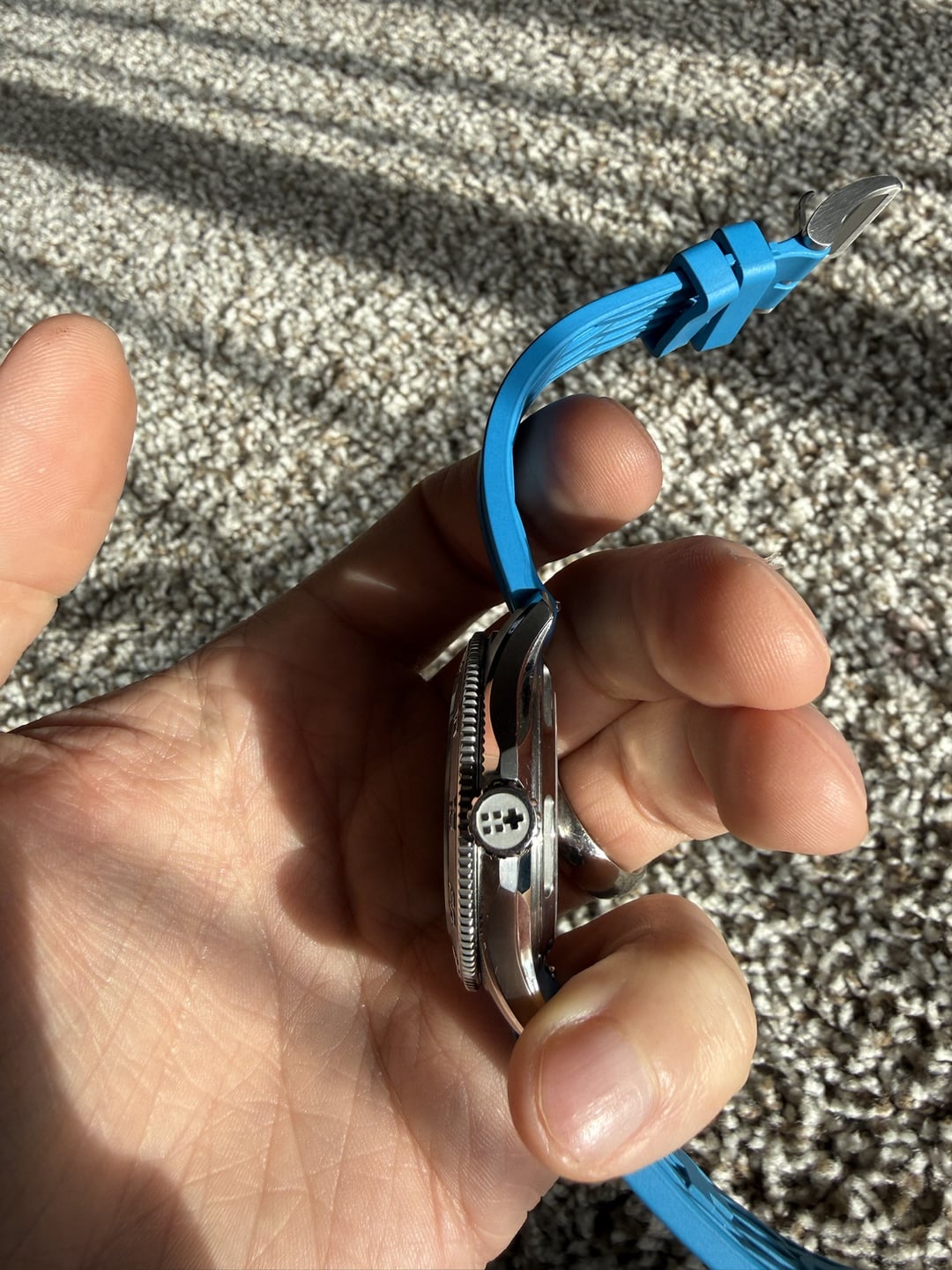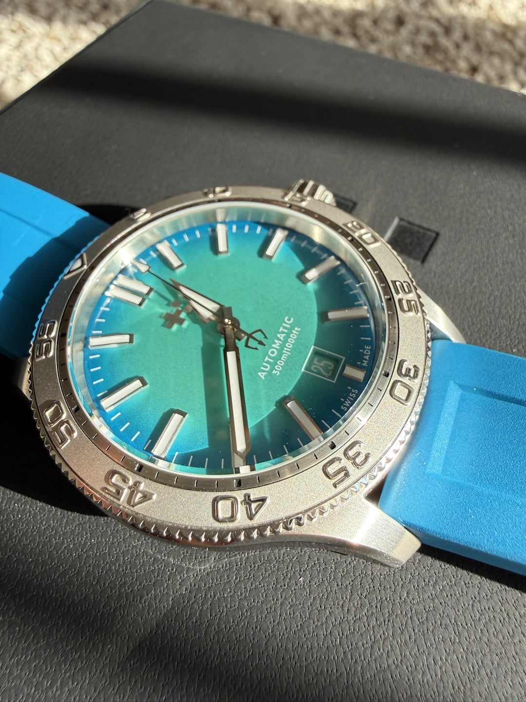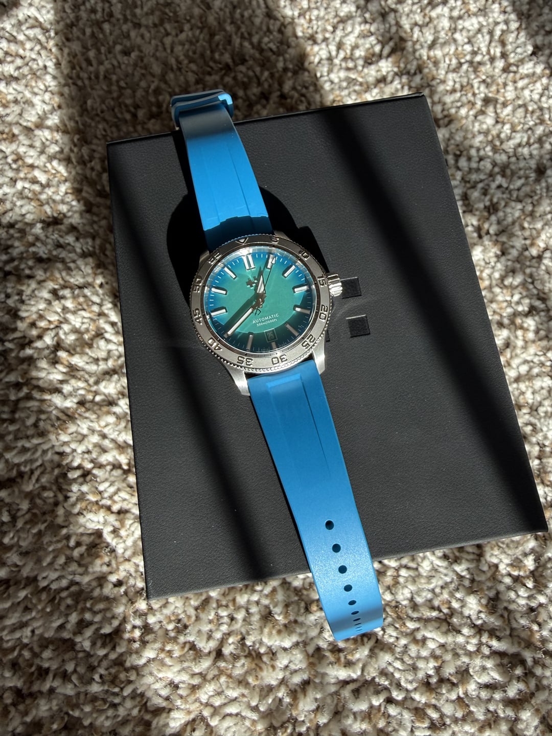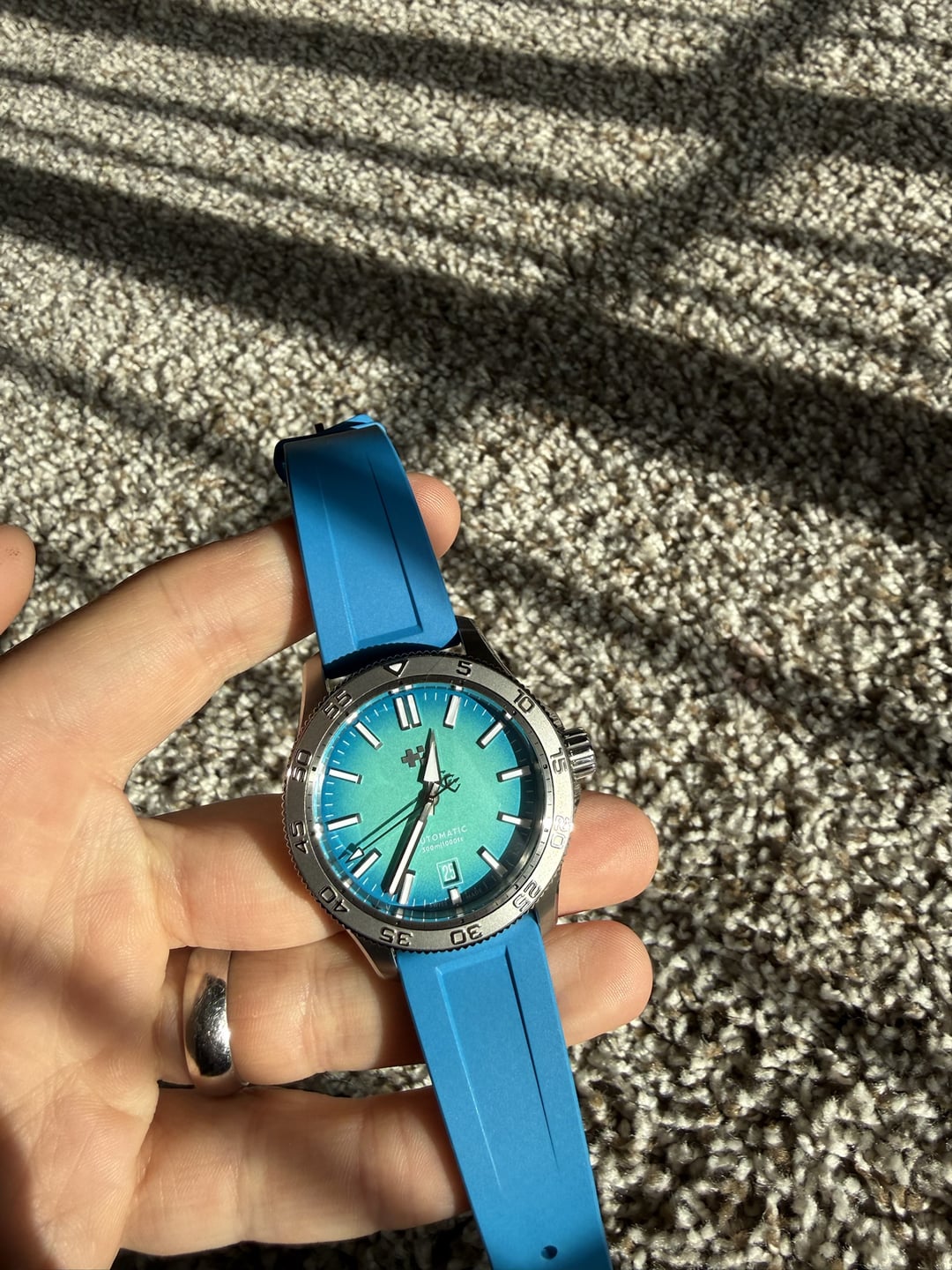 Looking to sell my Christopher Ward C60 Atoll 300 with blue Aquaflex rubber strap. It’s in great condition and I originally purchased it from another user here. This watch is stunning in person and especially brilliant in the sunlight (updated to include some additional sunlight pictures). The light catcher case, sand-blasted bezel and blue dial come together very nicely in this watch. The date wheel is color-matched to the dial which is a nice touch. It’s got the Sellita SW200 movement with a 38-hour power reserve and a nice smooth sweep at 4Hz. This has a 60 month warranty good until 2030. Selling only to make room for another strikingly blue watch (Straum Jan Mayen) and would love to see this get more wear time. Asking for $750 shipped, thanks for looking! Album: [https://imgur.com/a/cw-c60-atoll-drtPPUZ](https://imgur.com/a/cw-c60-atoll-drtPPUZ) Timestamp: [https://imgur.com/a/cw-timestamp-ub7rTJD](https://imgur.com/a/cw-timestamp-ub7rTJD)