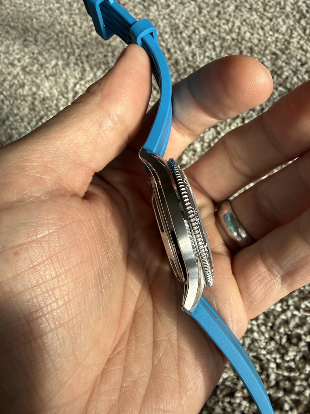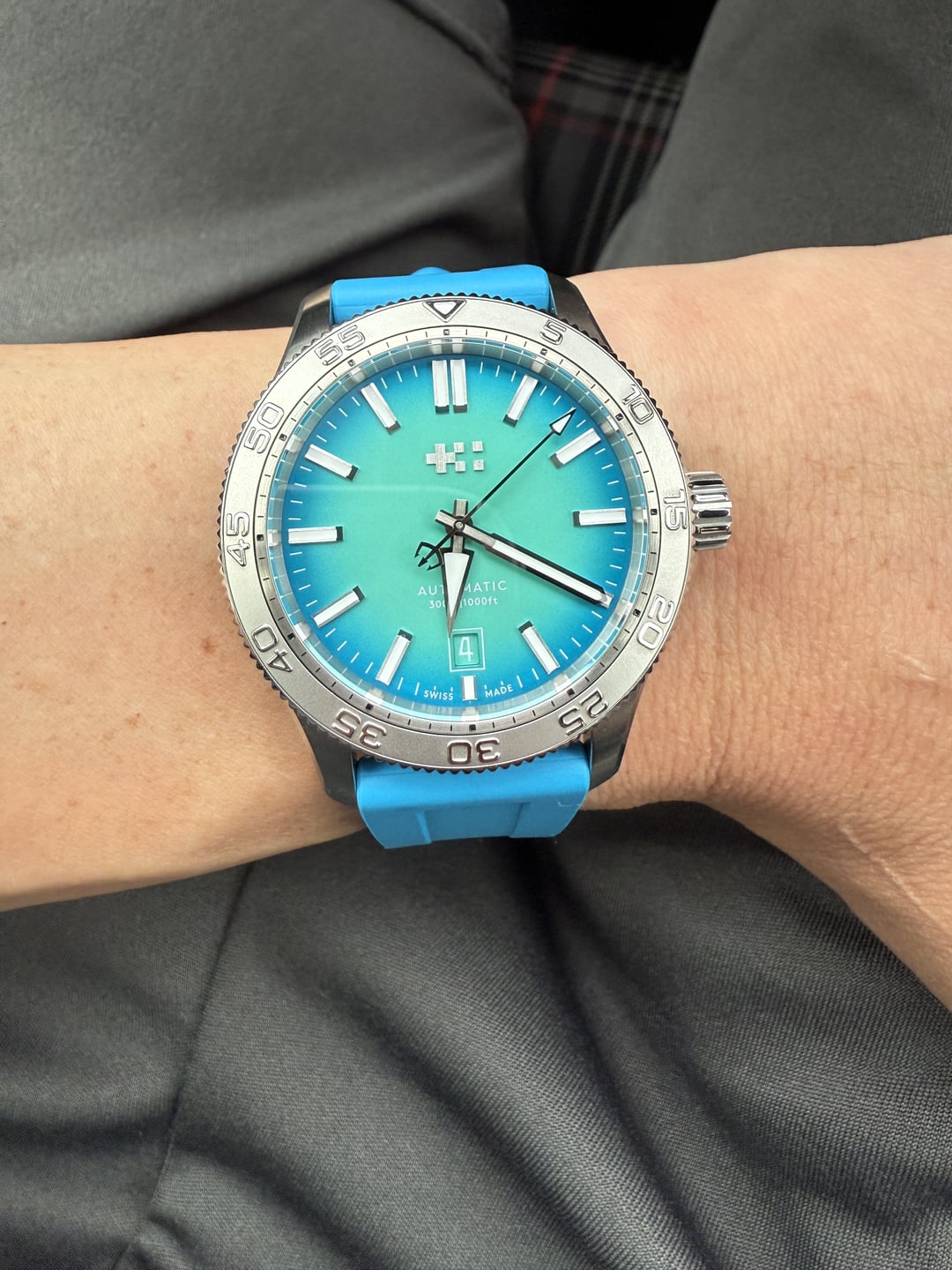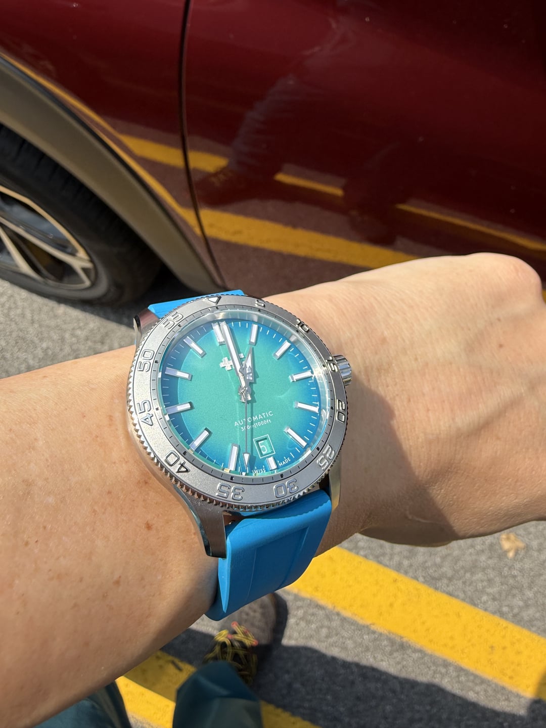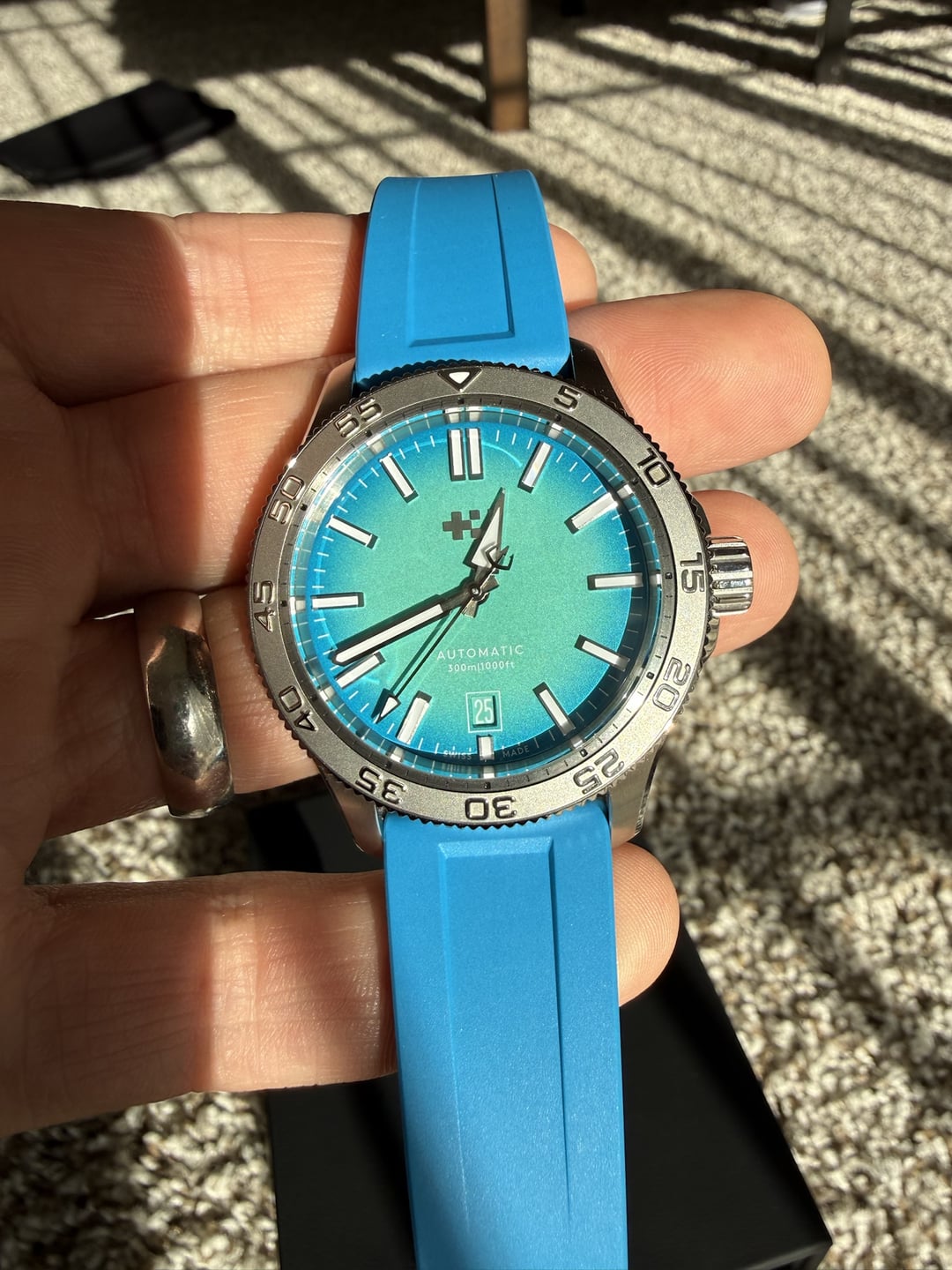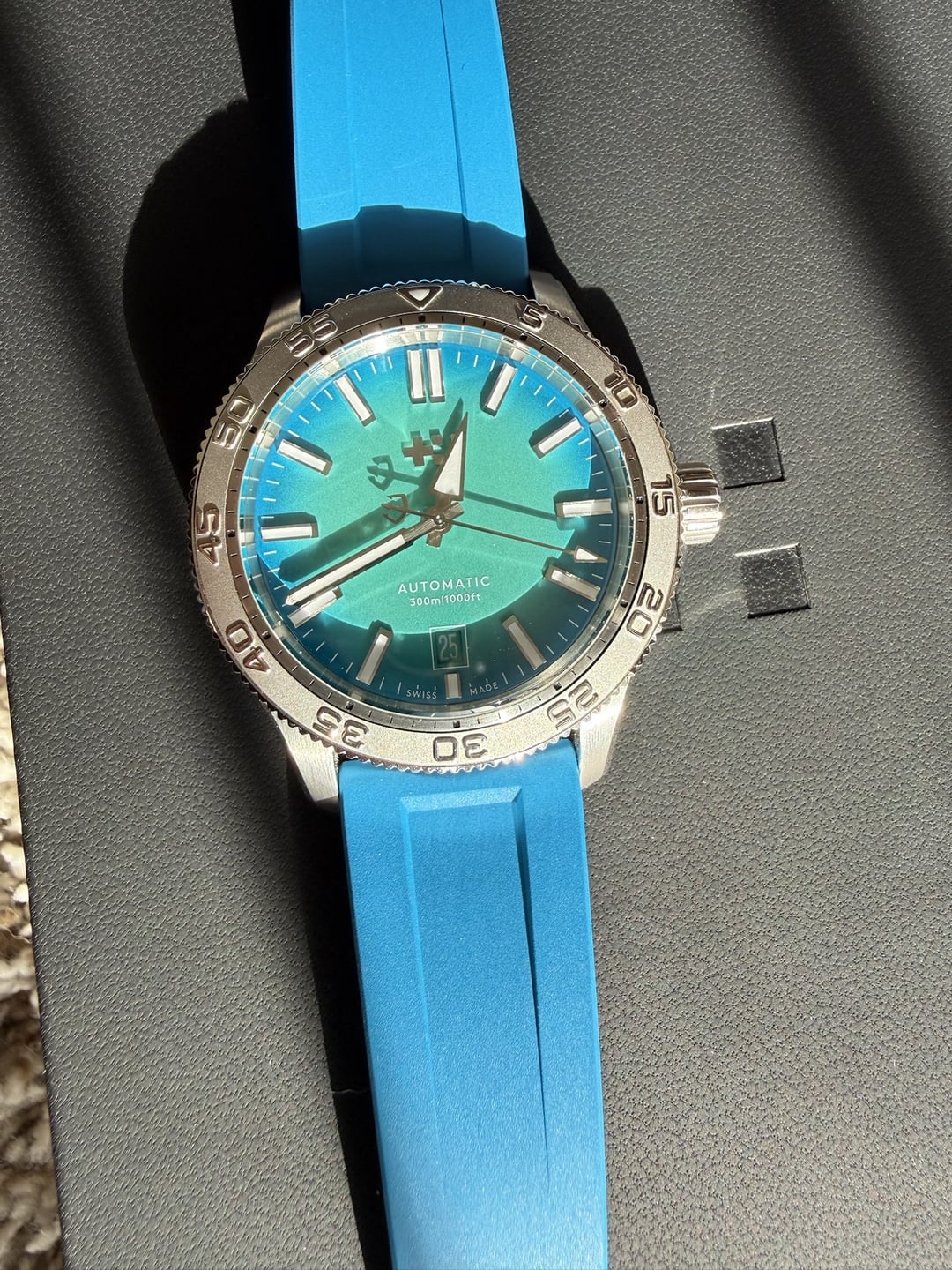 Looking to sell my Christopher Ward C60 Atoll 300 with blue Aquaflex rubber strap. It’s in great condition and I originally purchased it from another user here. This watch is stunning in person and especially brilliant in the sunlight (updated to include some additional sunlight pictures). The light catcher case, sand-blasted bezel and blue dial come together very nicely in this watch. The date wheel is color-matched to the dial which is a nice touch. It’s got the Sellita SW200 movement with a 38-hour power reserve and a nice smooth sweep at 4Hz. This has a 60 month warranty good until 2030. Selling only to make room for another strikingly blue watch (Straum Jan Mayen) and would love to see this get more wear time. Asking for $750 shipped, thanks for looking! Album: [https://imgur.com/a/cw-c60-atoll-drtPPUZ](https://imgur.com/a/cw-c60-atoll-drtPPUZ) Timestamp: [https://imgur.com/a/cw-timestamp-ub7rTJD](https://imgur.com/a/cw-timestamp-ub7rTJD)