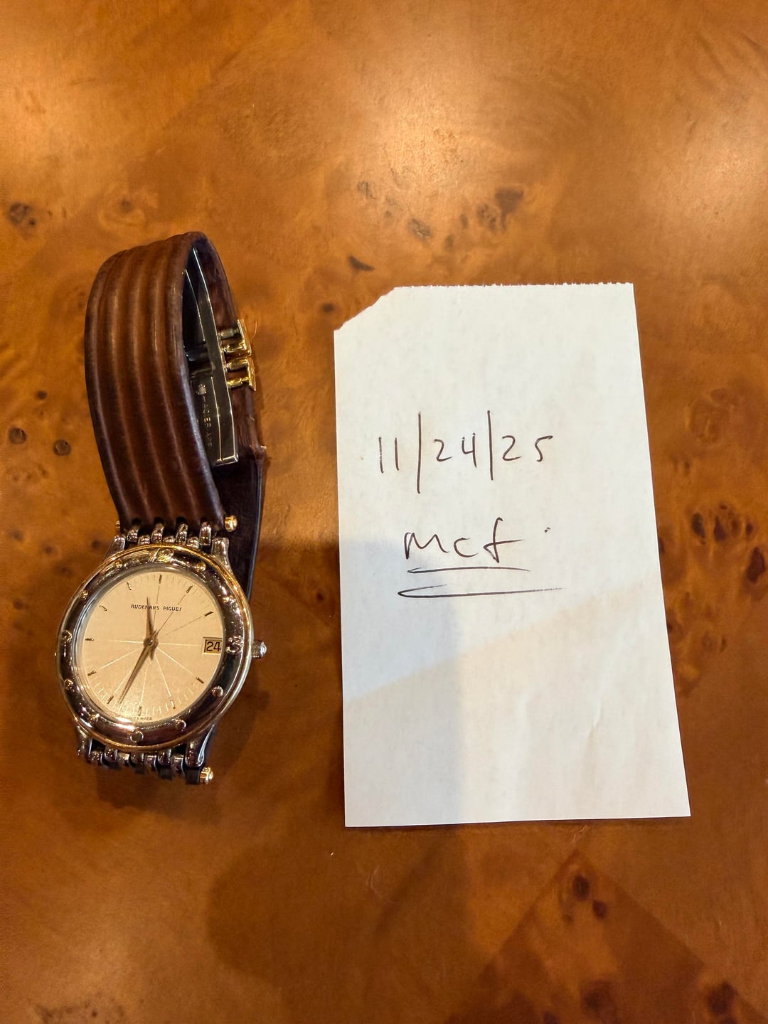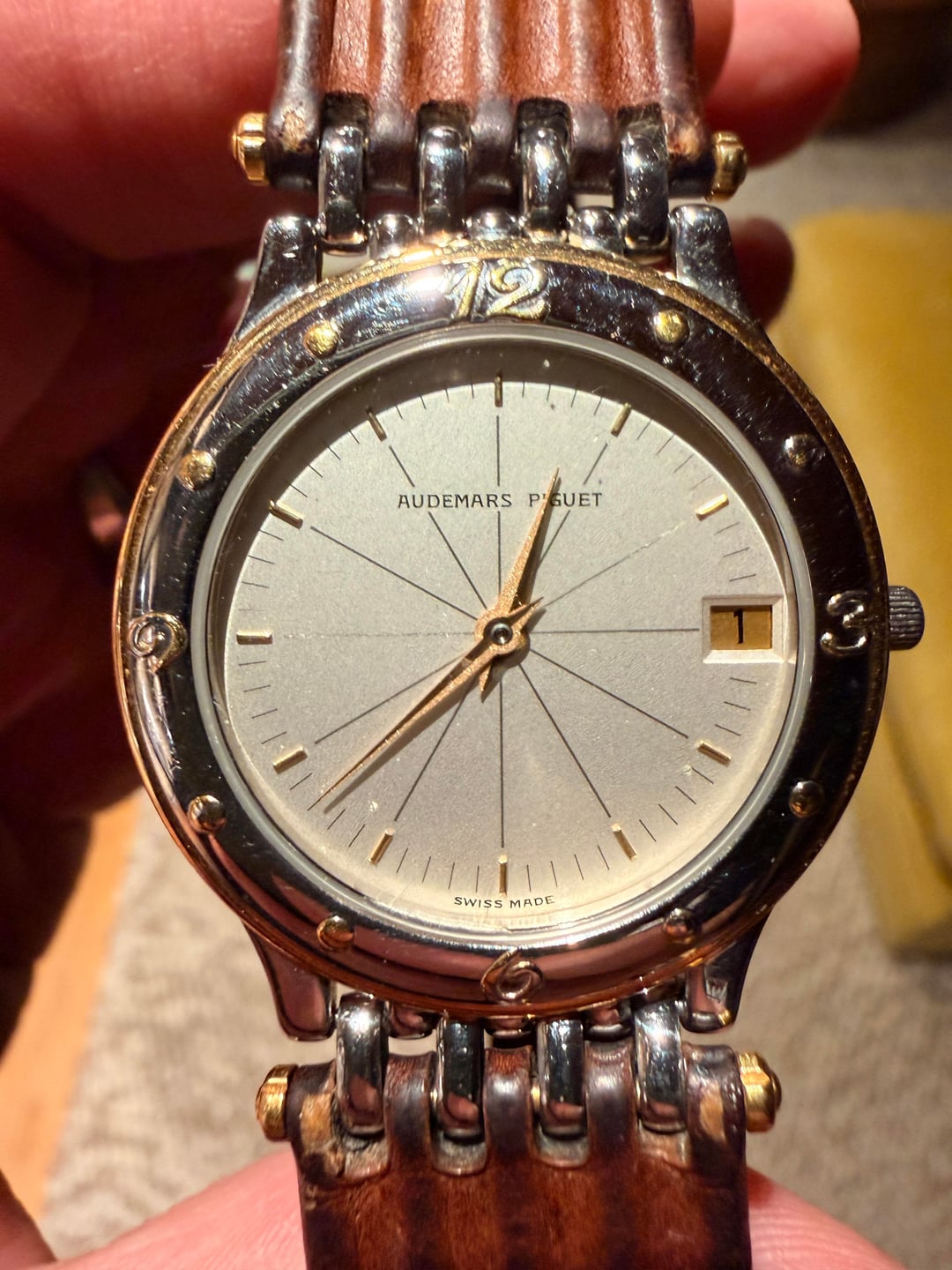 AUDEMARS PIGUET Meridian - Circa 1990 - 18K yellow gold and steel wristwatch. Round case with numbered case back. The bezel features Arabic numerals at 3, 6, 9, and 12 o'clock in 18K yellow gold. The silver-gray dial is signed Audemars Piguet and features applied baton hour markers. Date window at 3 o'clock. The leather strap has a double folding clasp decorated with the opposing initials "AP". Quartz movement. Hallmarked. Case diameter: 33 mm. New battery put in watch last week. Wrist size: 7.75 inches. I don't believe the watch is adjustable which is a function of purchasing the watch in 1990 to fit the original owners wrist. Condition: Excellent overall condition. (Minor scratches from use on the case back and clasp) Ref: DV54035 This is my second watch put up for sale but I don't have any sales yet. I am happy to do a video chat to review the watch and/or send more pictures. I am looking for $1,600 for the watch with shipping included within the US. International shipment will need to be considered individually. I accept PayPal F&F or Venmo. Unfortunately, I don't have Zelle at this time (waiting for my bank to set it up).