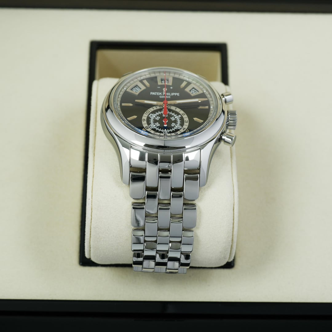 2018 Patek Philippe 5960/1A-010 Annual Calendar Chronograph Complete Set Timestamp: [https://imgur.com/AczQpNJ](https://imgur.com/AczQpNJ) A standout in Patek Philippe’s lineup, the Patek Philippe Annual Calendar Chronograph 5960/1A-010 is a rare fusion of high complication and modern sportiness. Crafted entirely in stainless steel, this model marks one of Patek’s few ventures into complicated steel watches—making it especially sought after by collectors. The 40.5mm polished case and integrated bracelet exude refined durability, while the striking black dial adds a bold, contemporary edge. Red chronograph accents and luminous blackened markers enhance legibility and contrast, framing the annual calendar windows (day, date, and month) and chronograph subdial in perfect symmetry. At its heart beats the in-house Caliber CH 28-520 IRM QA 24H, an automatic movement featuring a column-wheel chronograph, annual calendar, and 55-hour power reserve, visible through the sapphire crystal caseback. Blending heritage with modern allure, the 5960/1A-010 represents Patek Philippe at its most versatile—a highly collectible masterpiece that balances timeless craftsmanship with contemporary flair. Watch comes a complete set with Inner/Outer box, booklet, certificate of origin paper, pusher. Watch is overall in MINT condition. Please look at my pictures as I like to fully represent the exact condition of the watch through my photography. **Offered at $83,499 shipped in US or OBO.** Payments accepted: Wire or Direct Bank Transfer (Bank of America). Shipping is always FedEx/UPS overnight, fully insured. I am an avid enthusiast and collector and am not affiliated with any watch brand I post. **Always open to trades or purchases! Looking for Audemars Piguet, Rolex, Patek Philippe, FP Journe, Vacheron Constantin, and other luxury brands.** I guarantee every watch I sell to be 100% authentic. Follow me on IG: JJ\_Timepiece\_Co Call or text (941) 800-3931