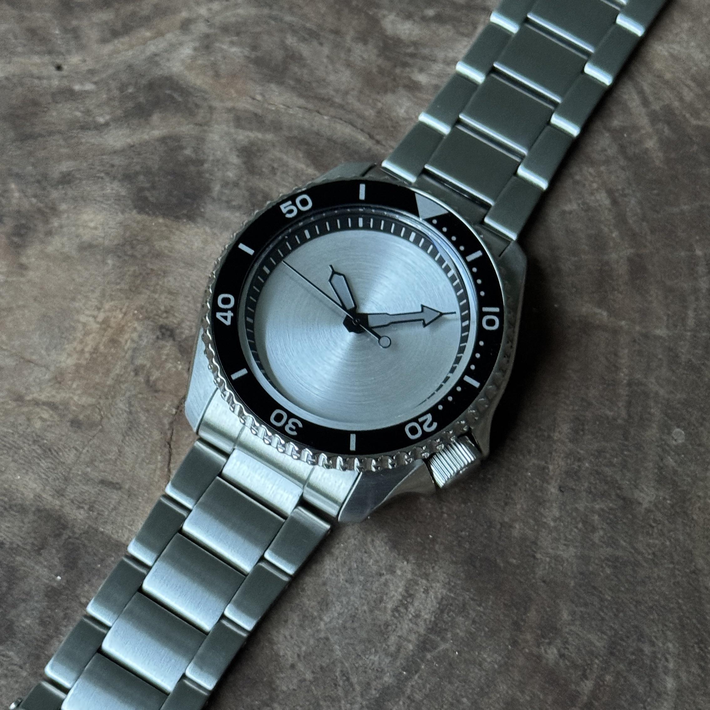 For sale is a really fun mod incorporating a silver no-date dial of concentric circles and black framed hands inside a Seiko SRPD55 case on its oyster style bracelet. Movement is a NH38 from Ajuicet swapped in to remove that ghost date keeping good time. Watch only. Love how it turned out with some SRPJ79 vibes. Nice overall condition with light wear primarily to the polished surfaces and bracelet clasp. Dial and hands are new and the crystal and bezel insert are clear. Wrist friendly SKX dimensions. 42mm case , 46mm lug to lug , 22mm lug width (drilled lugs) , 100m WR Album: https://imgur.com/a/A9SfmjJ Timestamp: https://imgur.com/a/KruNgbv $199 to CONUS buyers - UPS Insured shipping included. Payment via Zelle or PayPal with positive feedback. Please check the photos carefully before purchasing as they are part of the overall description - all sales are final. l've had many successful transactions and I'm looking forward to another smooth deal. Please let me know if you have any questions!
