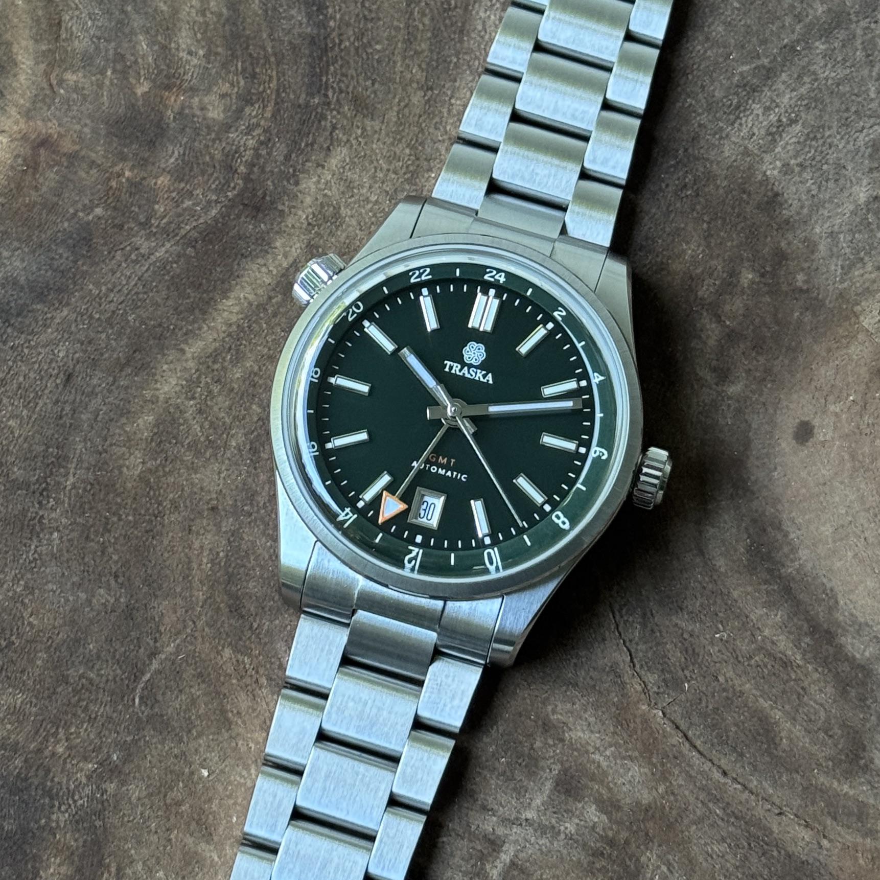 For sale is my 38mm Traska Venturer GMT ref. 4214 with its awesome Bottle Green dial and is a full kit including the watch on its original bracelet with on the fly quick adjust clasp and all links, Traska travel pouch, outer box, and manual. This model is the 4th generation of the Venturer with dual screw down crowns and the first release of Bottle Green. Excellent overall condition with only light wear primarily to the bracelet clasp. No dents or dings and the sapphire is clear. Traska’s hardened stainless steel is no joke! Timekeeping comes from the Miyota 9075 true GMT movement. Specs: 38mm case with drilled lugs , 46mm lug to lug , 20mm lug width , 9.75mm thin plus a fantastic sapphire crystal with AR , 150m WR , Miyota 9075 flyer GMT automatic movement $625 to CONUS buyers - UPS Insured shipping included. Payment via Zelle or PayPal with positive feedback. Album: https://imgur.com/a/Ww6S1gI Timestamp: https://imgur.com/a/fTO39qg Please check the photos carefully before purchasing as they are part of the overall description - all sales are final. l've had many successful transactions and I'm looking forward to another smooth deal. Please let me know if you have any questions!