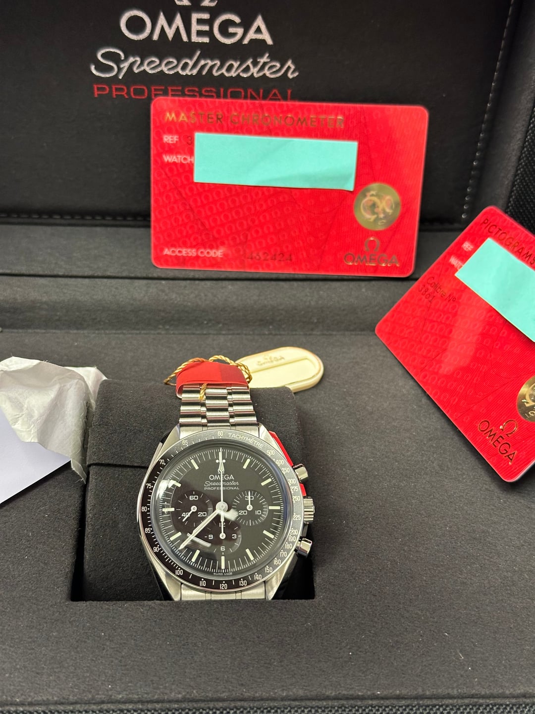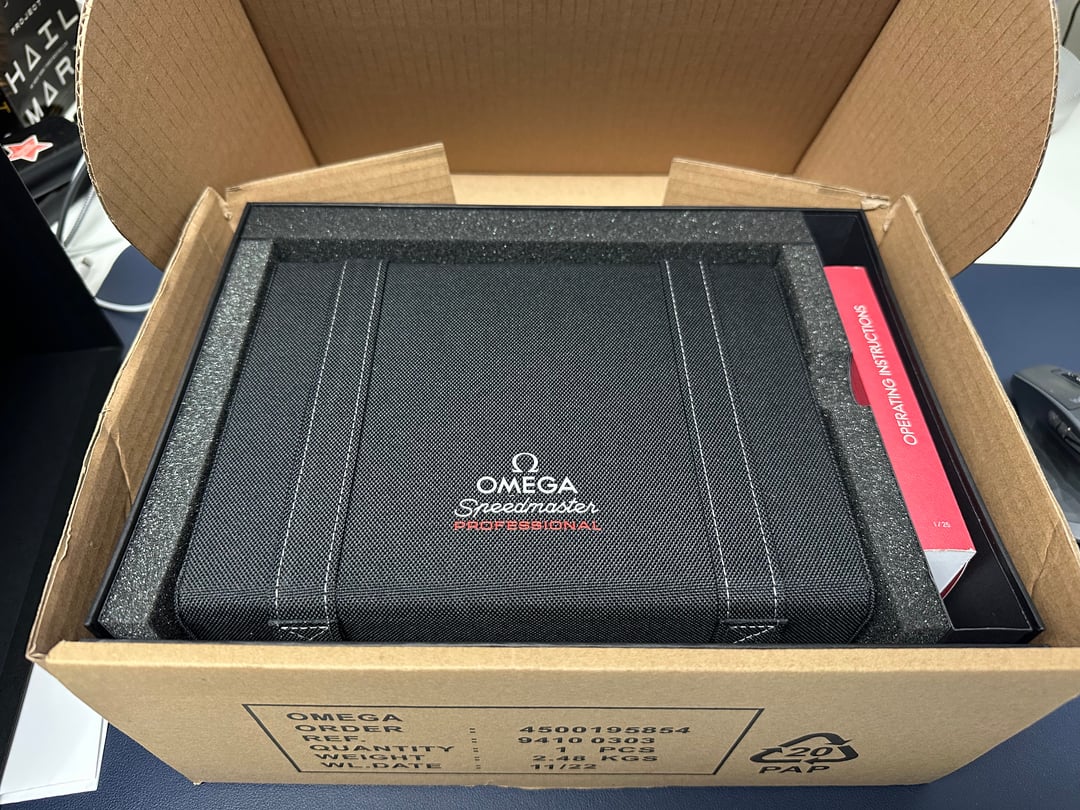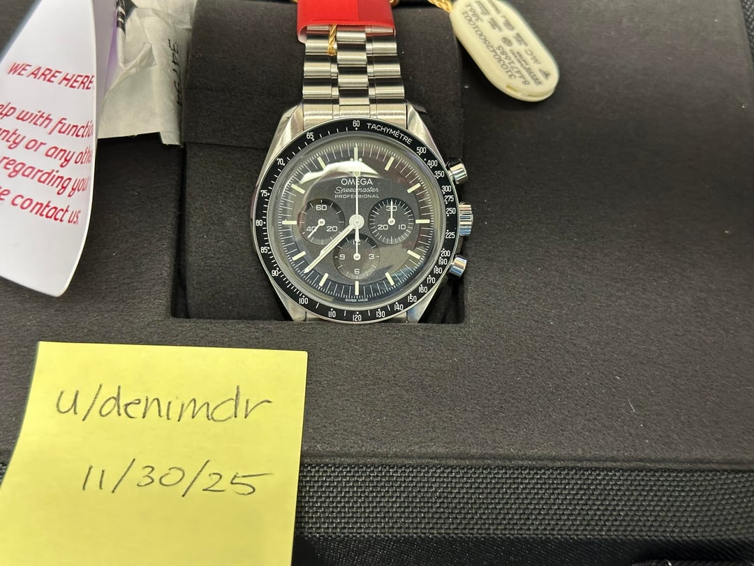 Up for sale is my Omega Speedmaster Professional Moonwatch, reference 310.30.42.50.01.001. This was purchased at the very beginning of my collecting journey from a gray-market dealer (rhymes with NotchRacks). At the time, I didn’t realize their “warranty” is not the same as the official Omega manufacturer warranty—which is the only reason I’m moving this along. **Condition:** Unworn, only tried on once at home for fit Still has that fresh-from-the-box feel Absolutely clean condition across the board **What’s Included (Full Set):** Original Omega presentation box Outer box Operating instructions All cards/paperwork as provided by the dealer - This includes the Pictogram(?) and Chronometer card. This was purchased from a grey market dealer (rhymes with CrotchPaxx). At the time, I wasn't aware that a retailers warranty card wasn't the same as a mfg warranty card. Original bracelet with all links **Details:** Hesalite model Manual-wind Master Chronometer movement Legendary “Moonwatch” design 42mm stainless steel Runs beautifully; never on wrist outside of a 1-minute fit test Price: $5,900 shipped CONUS (insured, signature required). Payment: Zelle or bank wire preferred. **No trades at this time.** Happy to answer questions via PM—please comment before messaging per sub rules.