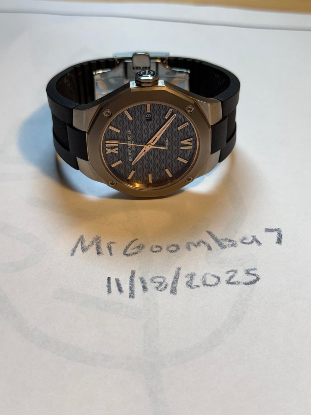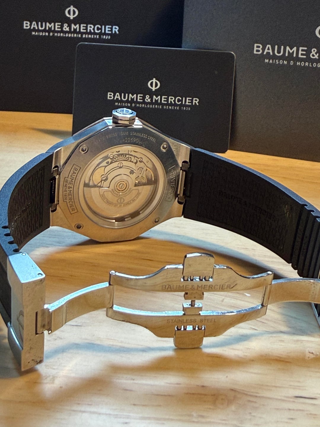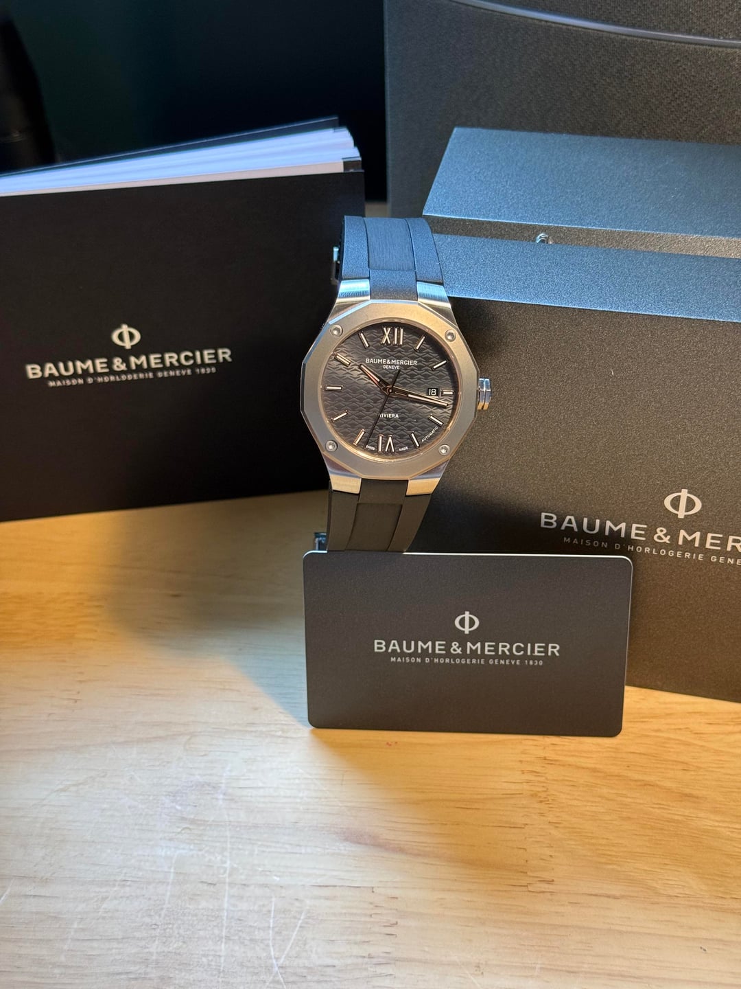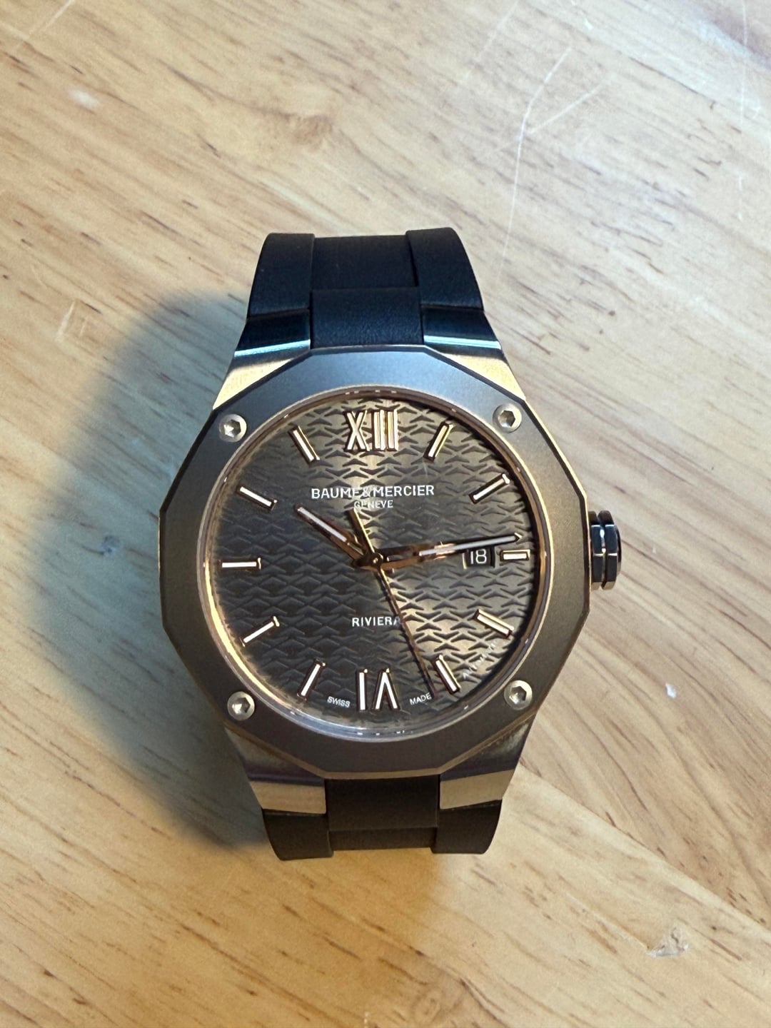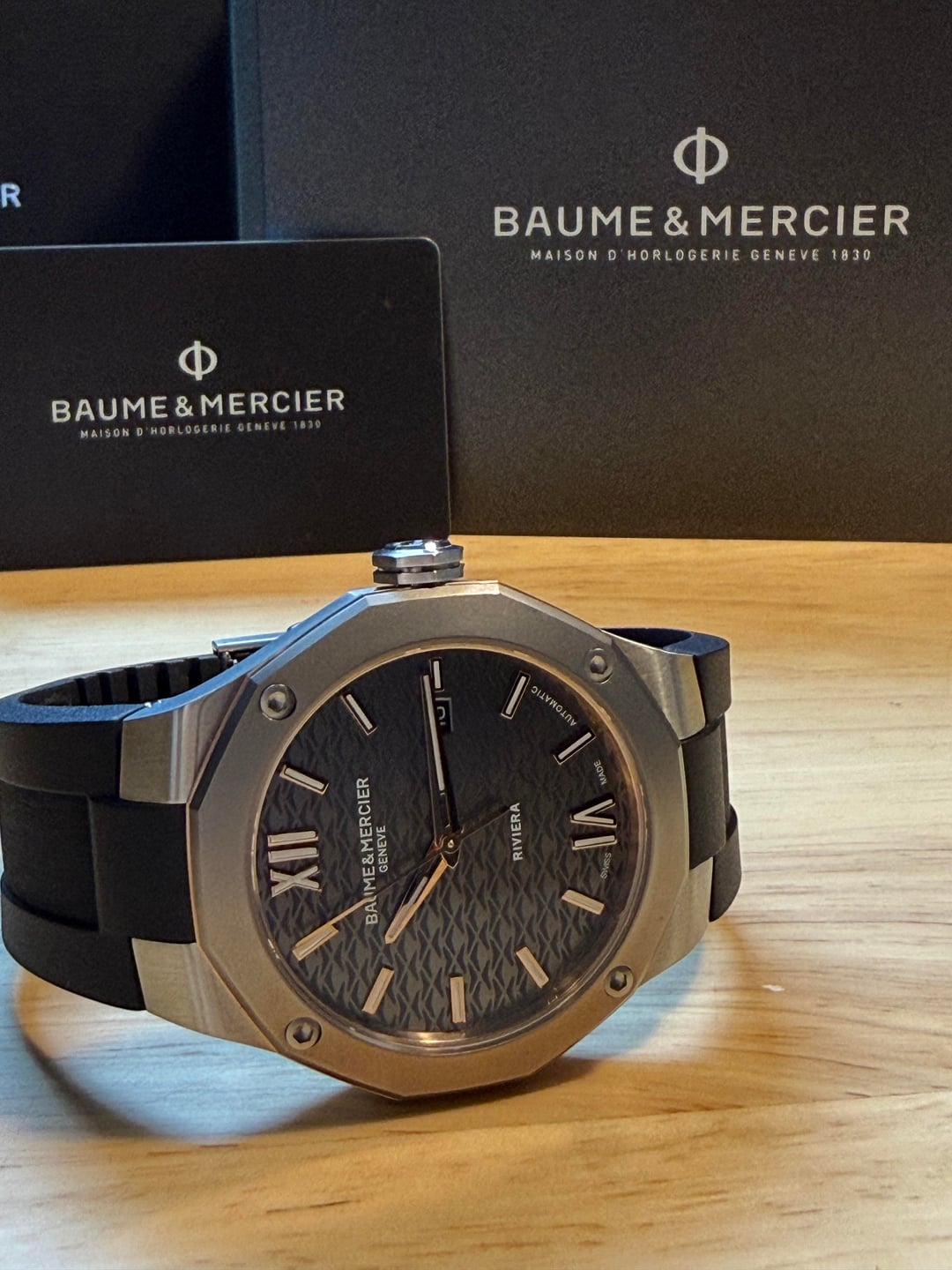 For sale: Baume & Mercier Riviera 10660 Swiss made, automatic self winding with a 38 hour power reserve and 100m water resistance. Case diameter is 42mm and thickness 10.66mm. This watch is only a couple months old and bought new (includes outer box, inner box, and warranty card). The watch has been worn maybe a dozen times and shows little to no signs of wear - like new. I have both a black and the stock gray rubber strap. Note: These strips are cut to fit. Its currently fit for a wrist size slightly smaller than 7in. Straps can be purchased directly from Baume & Mercier if you need bigger. Price: $1,800 + shipping Payment: Bank Wire/Zelle/PayPal F&F/Apple Cash/crypto