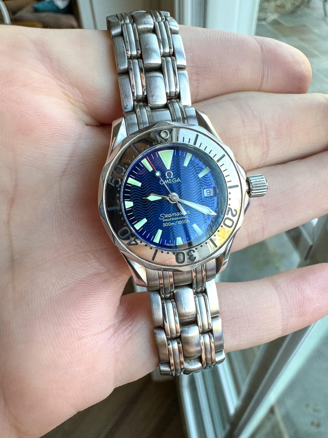 29mm Omega Seamaster 300M 2283.80 with the stunning electric blue dial. Quartz, Screwdown crown, 120 click bezel, Hour Jumping. Functions as it should. Battery is good to go. Watch Only, bracelet should fit 6.75in wrist. $850+ shipping. [Album/Timestamp](https://imgur.com/a/xYGOZov)
