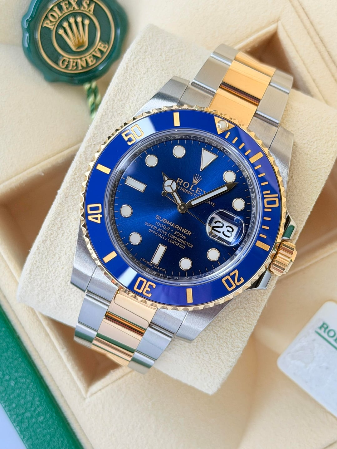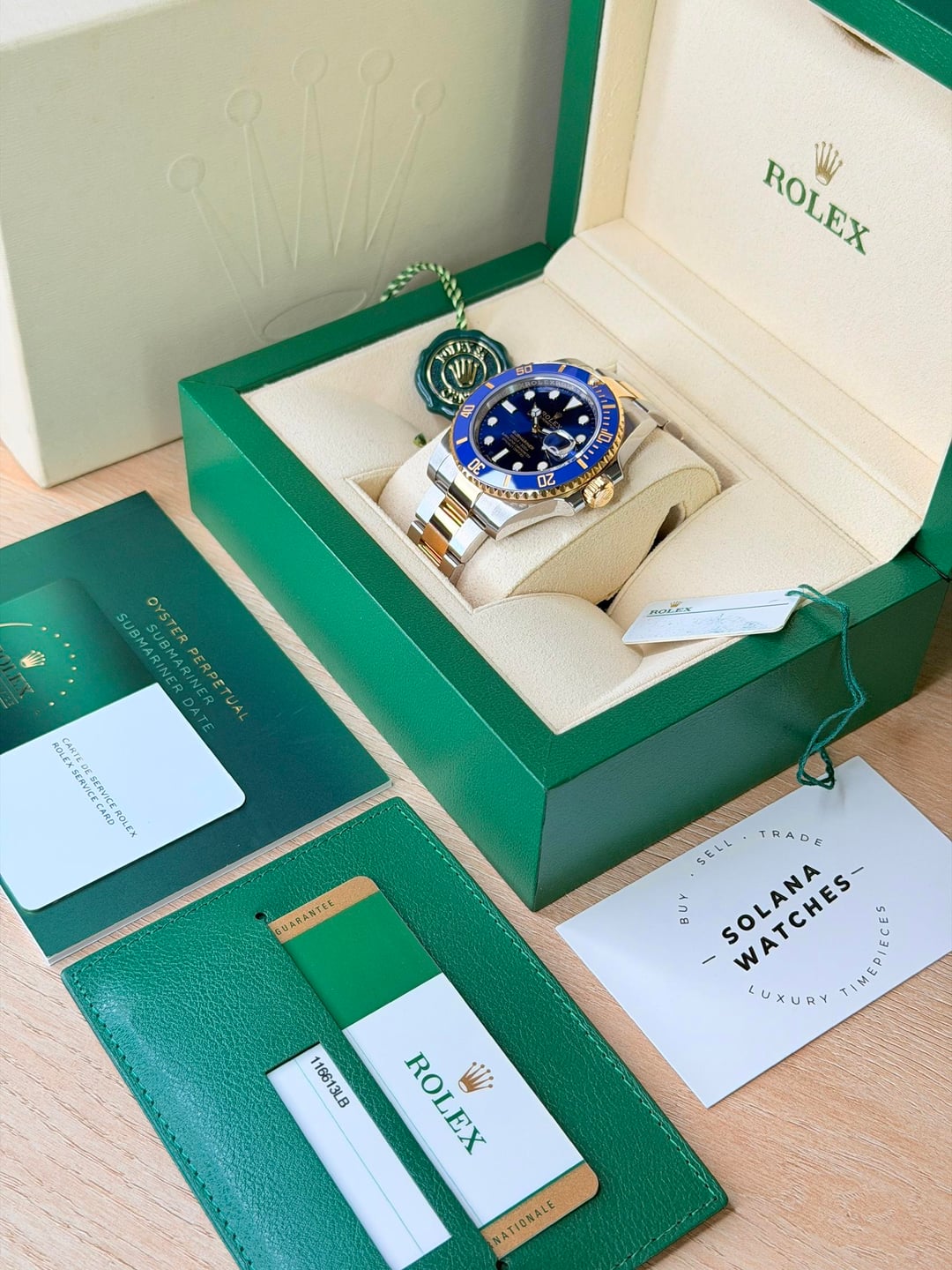 Selling this 40mm two-tone Rolex Submariner reference 116613LB / 116613 with the beautiful sunburst dial, also known as the Bluesy. **This Bluesy is in great condition**. It was just serviced by Rolex in November 2025 and is covered by Rolex under their 2-year warranty. It comes as a full set including small box, outer box, manual, warranty booklet, leather wallet, warranty card dated 2016, 2025 Rolex service card, all 12 full links, serialized hangtag, and the Rolex hangtag. **Photos:** * [Album](https://imgur.com/a/2016-bluesy-dec2025-PfMOQnF) * [Timestamp](https://i.imgur.com/UbV7sjC.jpeg) * [More on my Instagram @SolanaWatches](https://www.instagram.com/solanawatches/) **Price is $14,400 delivered **in the US. **I am a full-time watch dealer, and I have completed many transactions here. **I can provide additional references upon request. **Feel free to contact me** via PM here so we can exchange numbers and get on the phone or do a video call. You can also [find me on Instagram @SolanaWatches](https://www.instagram.com/solanawatches/). _Private showroom located in San Diego, CA. Reach out to schedule an appointment._ _All my watches are guaranteed 100% authentic, and I will stand by their authenticity. _ _California buyers without a seller’s permit are subject to sales tax._