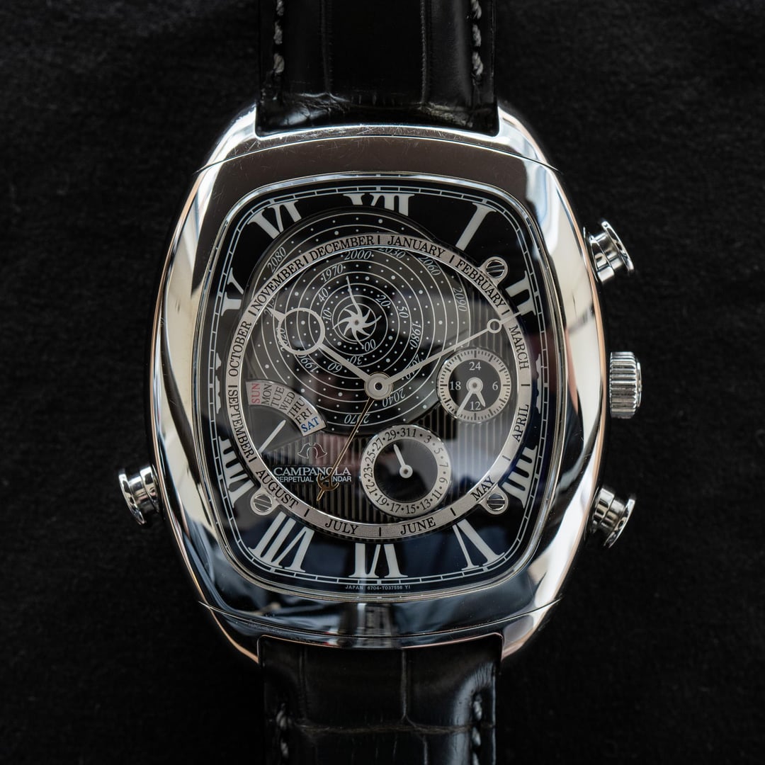 # Reference: **Model:** Campanola AG6250-09E Triple Perpetual Calendar **Year:** May 2019 **Timestamp:** [https://imgur.com/a/1UHpBsO](https://imgur.com/a/1UHpBsO) # Features: **The Collection.** Campanolas are renowned for their use of layering, often opting for a distinctly three-dimensional look, as demonstrated above. Taking a typically chaotic complication, like a Triple Date Perpetual Calendar, and leaning into that chaos is the Campanola’s signature move. There are at least six different metal finishing techniques on display: brushing, sunburst, engraving, polishing, relief striping, and azurage. Definitely not a dial you’d get bored of looking at. **The Design.** Released in 2017, it was the last iteration of the Triple Perpetual Campanolas to feature the now-iconic spiral galaxy year wheel. In the first picture, the watch is showing Saturday, July 31, 2027, as the date. The year 2027 is indicated by counting the dots after 2020 until reaching the dot that the white hand points to - in this instance, the seventh dot. Here’s the clever part: every year that aligns with the hand, both above and below 2025, shares the same day/date combination. July 31 in 1915, 1943, 1971, 1999, 2053, and 2083 are all Saturdays! **The Changes.** Over the years, the changes between releases have been cosmetic and minor, but I’ve always welcomed them. In this final version, the centre of the universe hand was slightly distorted to better mimic a swirling galaxy, and the minute and hour hands were given bulbous tips to make them look like celestial bodies orbiting the dial. **The Functionality.** Holding the top or bottom right-side pushers will move the calendar backwards or forwards in time, allowing you to easily see which day falls on a specific date. A quick press of the left-side pusher resets the calendar to the current date. **The Craftsmanship.** Much like Grand Seiko, the Campanola collection is hand-assembled, from the movements to the watch itself. Even the quartz movements, like this one, are hand-assembled! The case is hyper-polished and coated with Citizen's proprietary surface-hardening Duratect, and the domed sapphire features Citizen’s proprietary multi-layered AR coating system, known as Clarity Coating. # Details: **Condition:** In very good condition. Hairline swirls and lines are visible on the edges of the case. **Scope:** Original Box and Papers. **Movement:** Citizen 6704 Triple Calendar Quartz **Dimensions:** \- Lug to Lug: 54.6mm \- Case Width: 40.5mm \- Case Thickness: 15.0mm **Price:** Offered at **$1350** \+ shipping. I accept a wide range of payment options, including credit card, depending on your transaction history. Transaction fees paid by the buyer, where applicable.