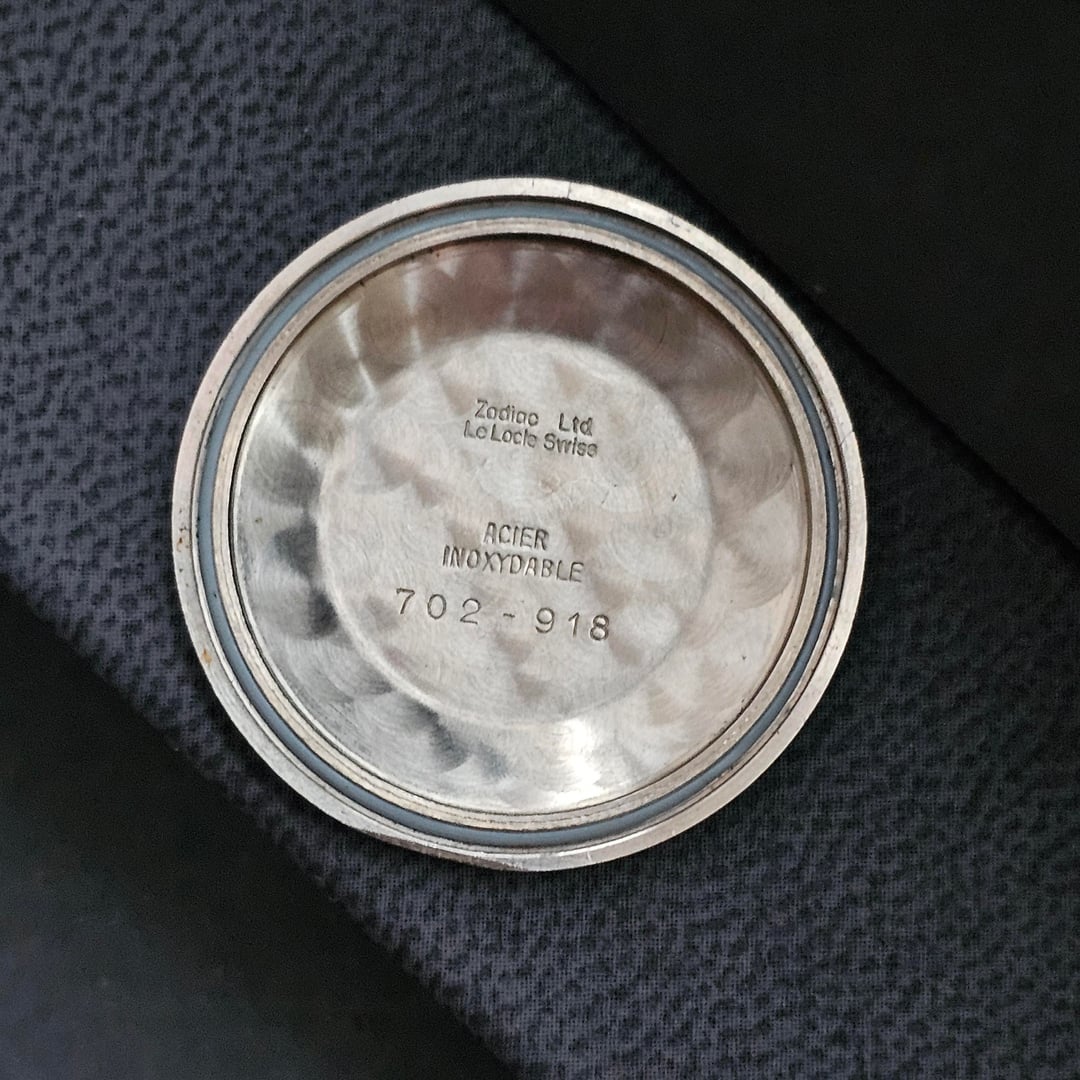 For sale is this vintage Zodiac Automatic Men's Wrist Watch Ref. 702-918 Watch is in very good overall condition and is ready to wear. Circa 1960's. Made in Switzerland This funky and retro watch measures in with a 36 mm case across (Crown not included) and is in great original shape showing no signs of extreme abuse and polish. It's case size makes it suitable to todays modern trends. Lug to lug measures in at 41mm. Fair & original 12hr silver sunburst dial. Dial text at 6 o'clock is sharp and untouched. Inner silver chapter ring remains perfect and untouched. Original black lumed stick/pointer minute hand and blued steel seconds hand in good condition. They present well. Lumed hour wheel disc is flawless. Zodiac Signed Cal.70-72 17J Swiss made movement. Watch is in good working order and is keeping excellent time. Serviced within the past year. Crystal appears to be original Crown is original and signed with the Zodiac logo Case is complete stainless steel construction Replacement Black ostrich leather strap. Watch will fix a maximum 8" wrist size. **Asking $850 + Shipping**