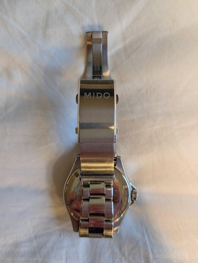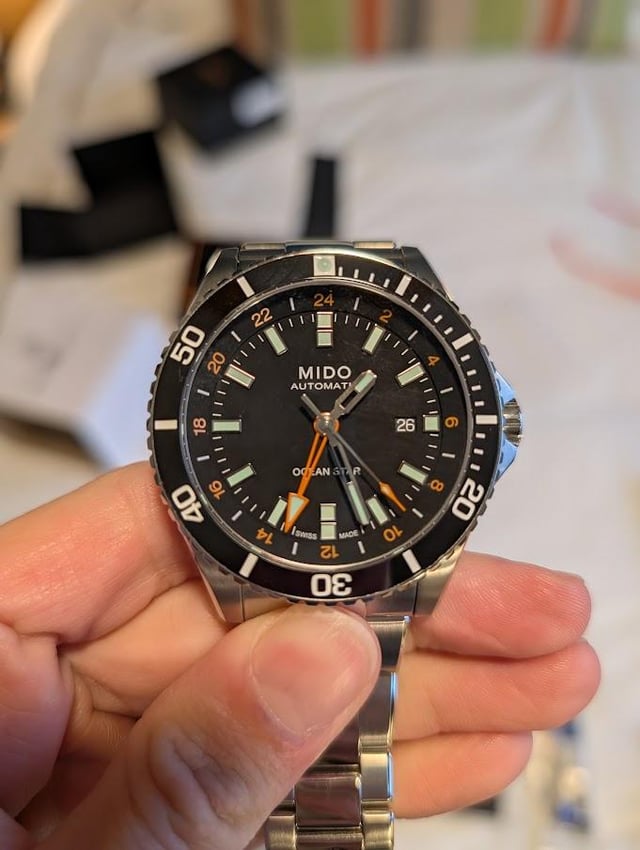 Selling a Mido Ocean Star Model 026.629.11.051.01 with a 44mm case, originally bought new by me in 2023; condition is 9.5/10 with minimal desk diving marks. Full specs here: [MIDO Ocean Star GMT | M0266291105101 | MIDO® Watches United States](https://www.midowatches.com/us/ocean-star-gmt-m0266291105101.html) Asking $589 shipped via USPS Priority Mail in the US, with payment via either PayPal F&F or Zelle. Please add $40 for PayPal G&S.