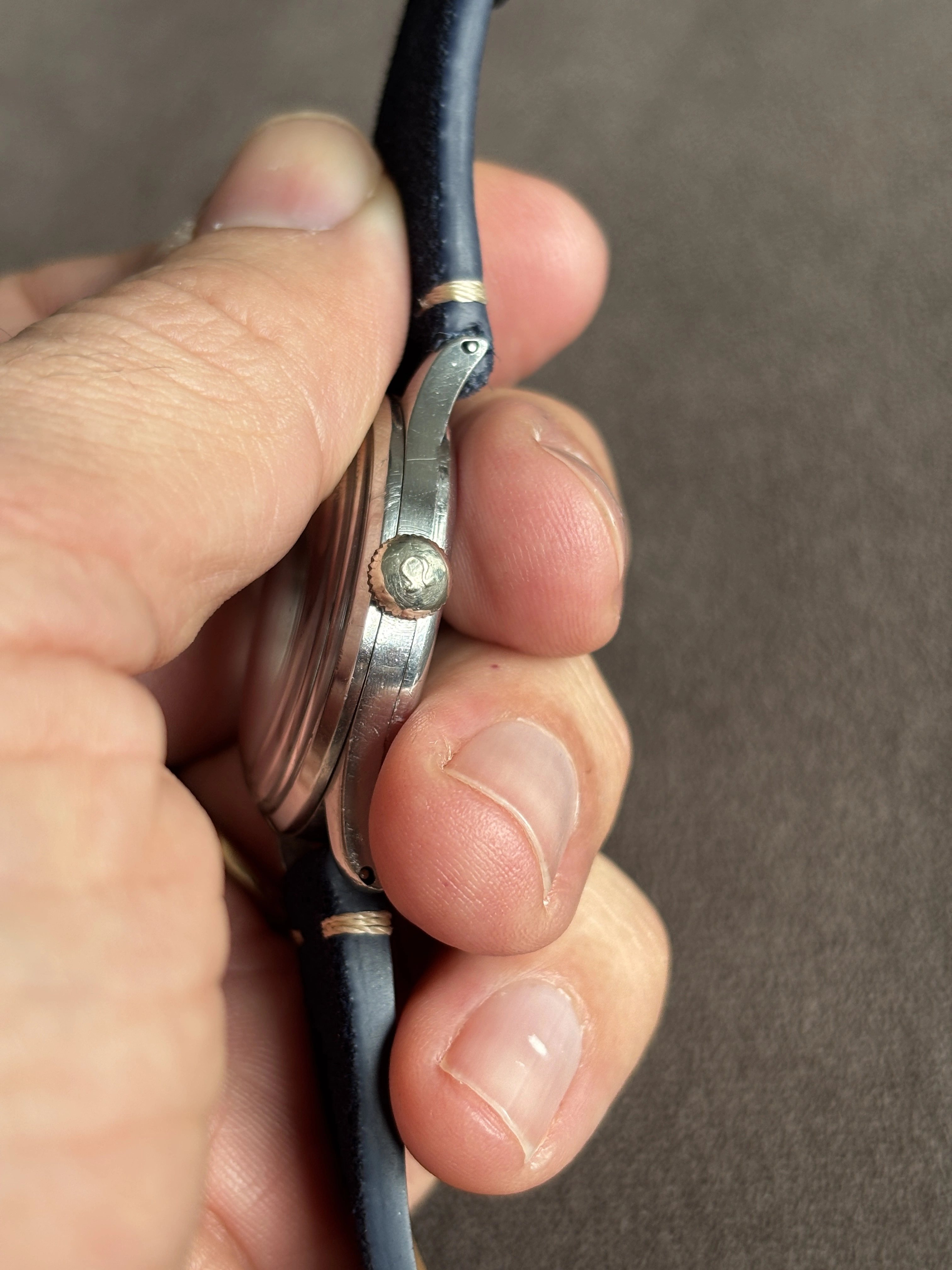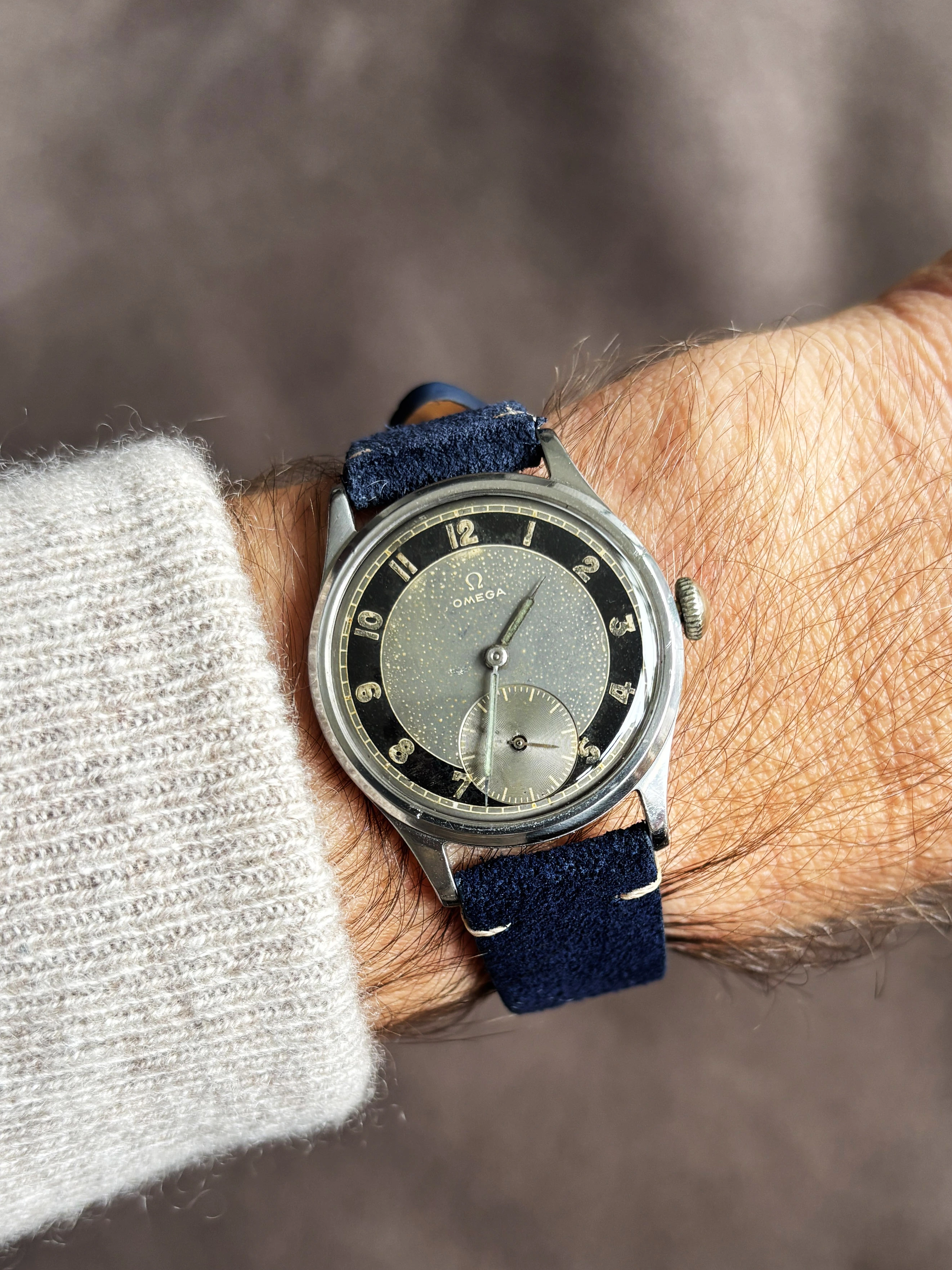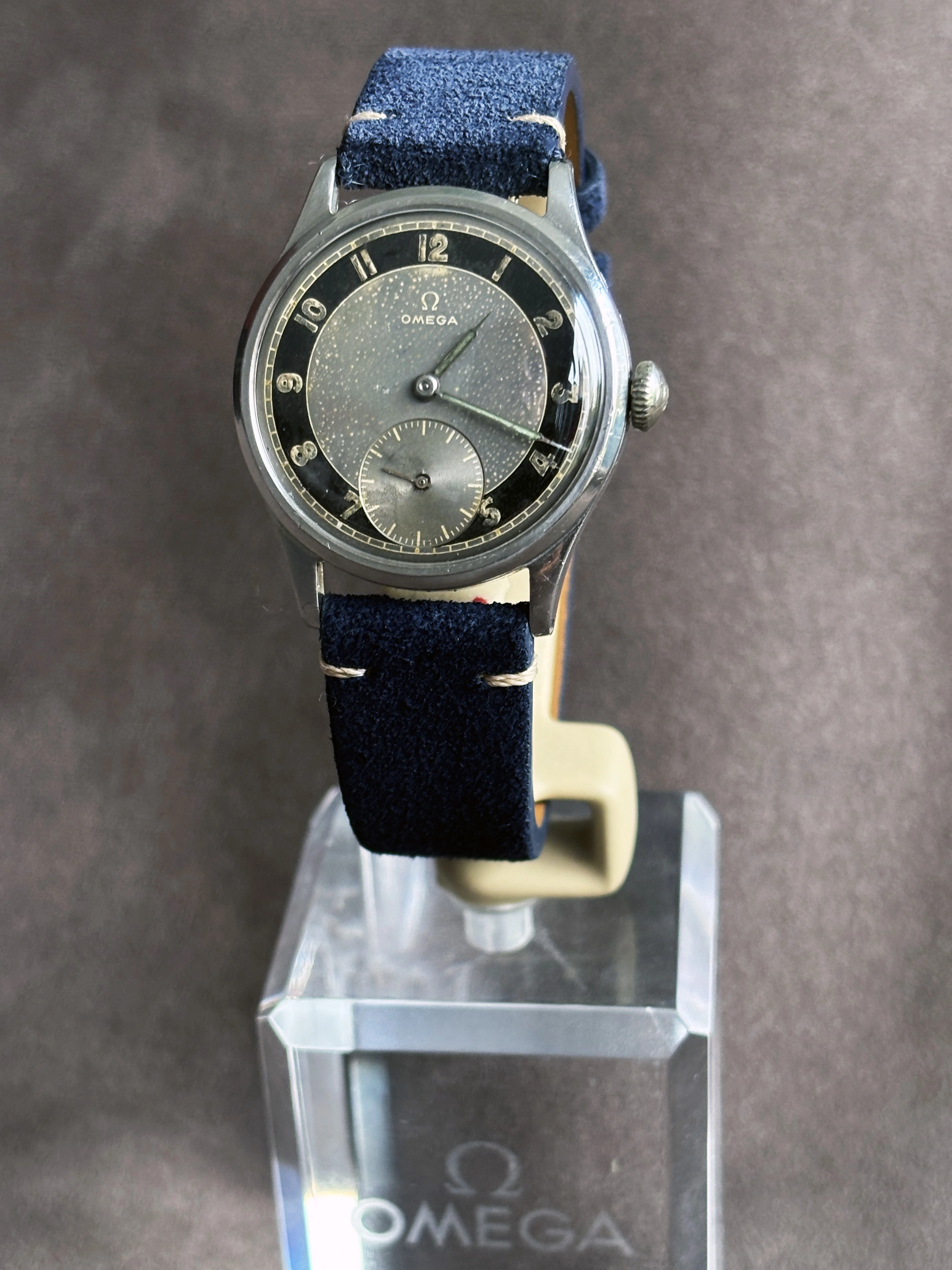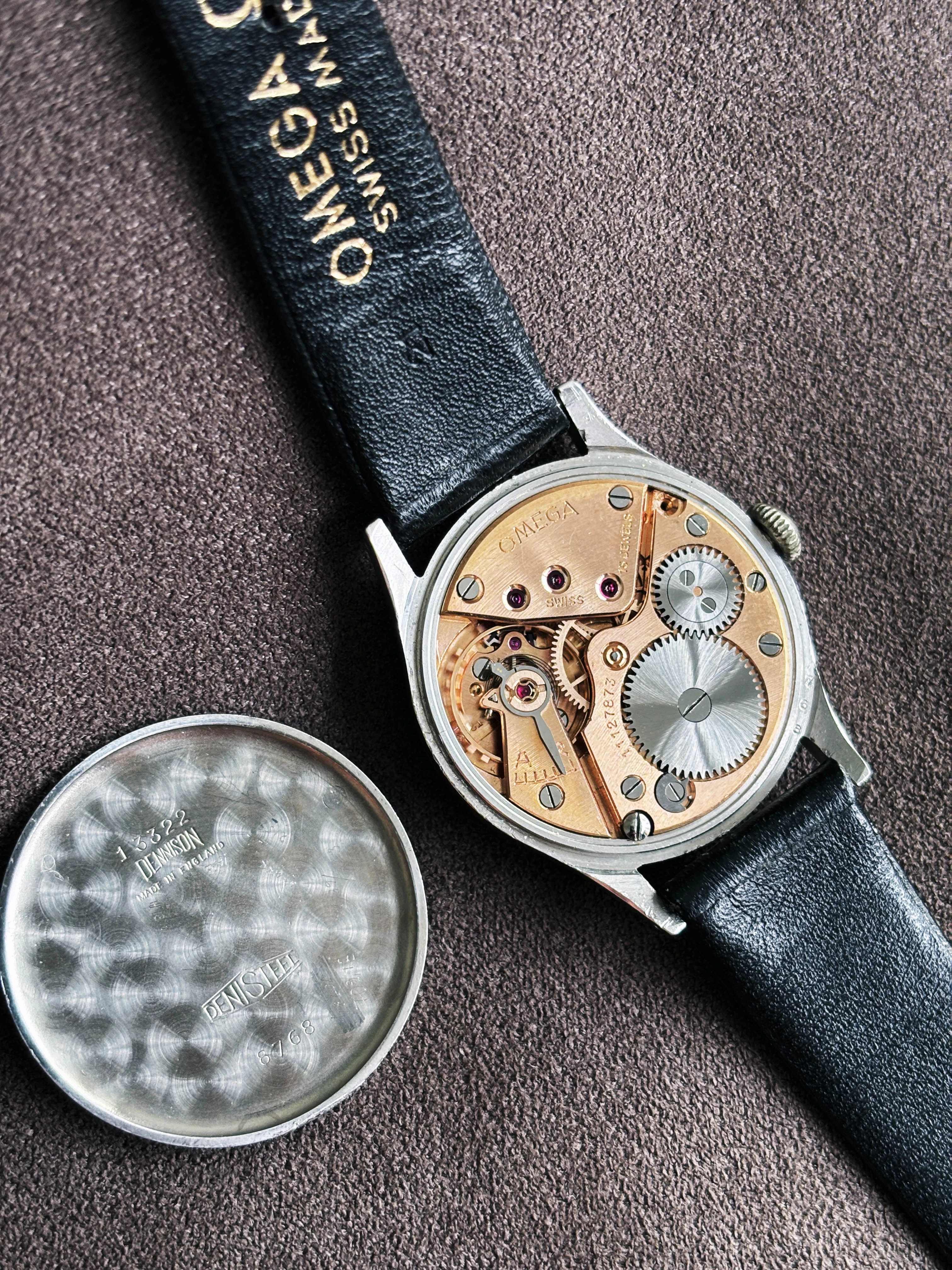 Connoisseurs will recognize this rarity. It's an Omega Dennison 13322. Dennison was a subcontractor, notably known for the Constellation case. They were also the official Omega importer in the United Kingdom. And as in many countries during the 1940s and 50s, to limit customs fees, brands shipped the movements assembled in the destination country.