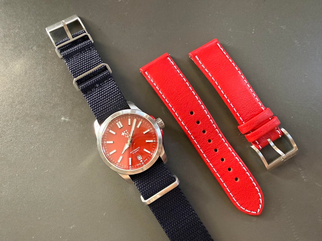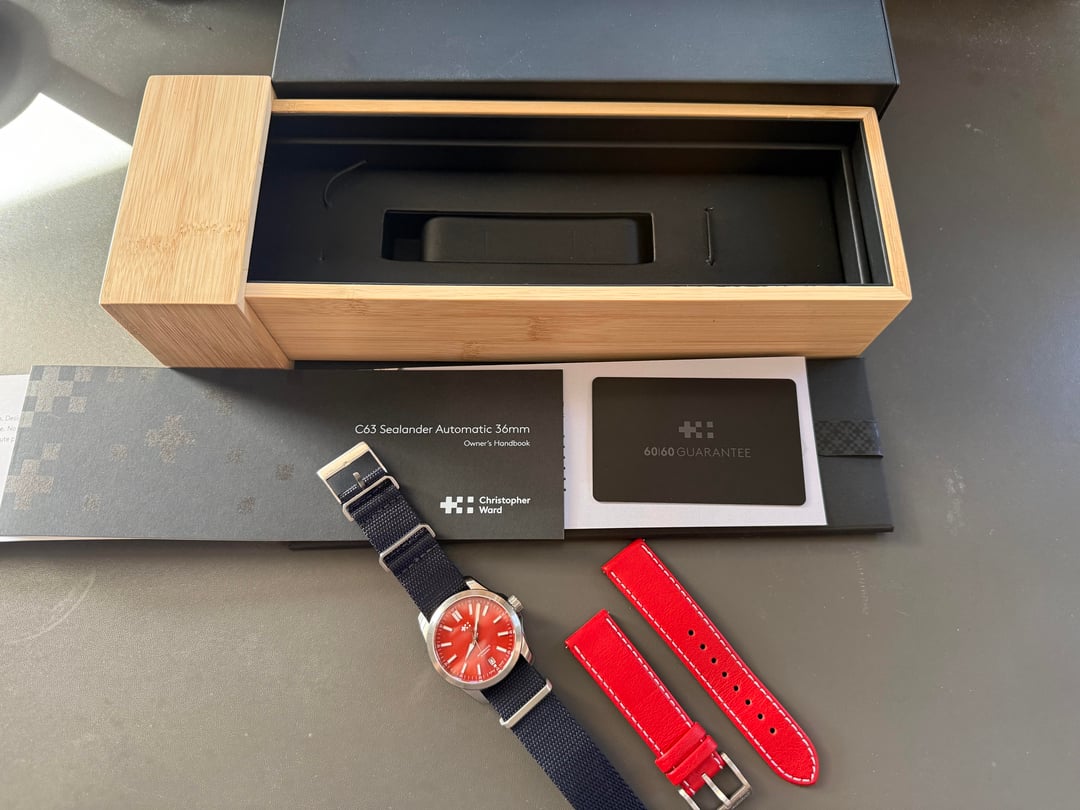 For sale is a 36mm Christopher Ward C63 Sealander watch in a rare limited edition Acer Red. Comes with the full kit, including box, papers, and warranty card (warranty runs until October 2027). Comes with two straps, the original red leather strap and a bonus NATO strap. I believe the NATO strap is from Crown & Buckle. Watch is in good condition, the case and bezel show minor scratches but there are no major dings. Crystal and dial are clean and free of imperfections. **$700 shipped** to anywhere in the USA. Prefer payment via Paypal F&F (+3% for G&S), Zelle, or Venmo. Price is firm. No trades at this time. Please let me know if you have any questions! Timestamp is in the last photo.