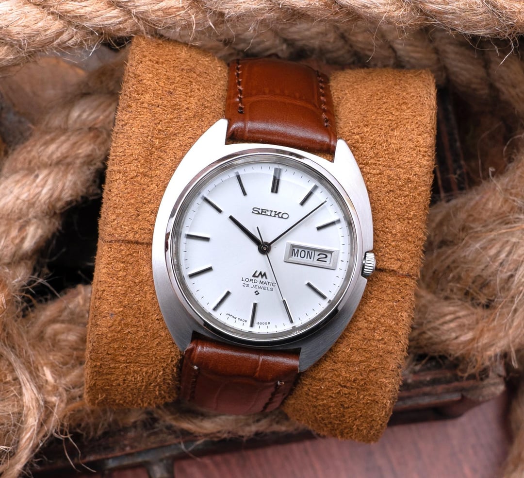 A very rare Seiko Lord Matic watch in great condition. Stunning White sunburst dial, unique layout. Robust well built beefy cushion case. Raised faceted indexes make the dial pop. Movement has been serviced. Great time keeping. LM offers the base movement of the King Seiko. Amazing condition at 55 year old, ready to be used as a daily driver. Designs are well ahead of its era being futuristic. It has both English and Japanese (Kanji) day options. Kanji(Japanese) date highly complements the dial. Comes with an aftermarket brown leather strap, unsigned buckle. Such pieces should be appreciated upfront to experience at full measure, pictures don't do justice to it. Sunlight brings out most of its beauty. They were designed to have premium build quality but for only within regions of Japan. Case is professionally polished keeping all the sharp brushed lines, edges and mirror finishing. Handling it, I can definitely guarantee this is superior to modern watches of the same price zone. A good collectors piece. Lord matics are great investment pieces. It’s only released in Japan, JDM model. This example like all Lord Matic’s house the King Seiko 56 base movement (a high end automatic movement that was thinner then all other auto’s of the time). Check my Instagram: [https://instagram.com/hour.lust](https://instagram.com/hour.lust) PRICE: $249 USD via Paypal, Wise, Crypto. FREE Shipping worldwide. Considering a full service has been done to the watch, I'm asking a reasonable price. I have a good number of exchanges here for a safe transaction. * Manufacturing Year: SEPTEMBER 1970 * Caseback Reference: 5606-8000 * Case size: 38 mm * Lug to Lug size: 41 mm * Case thickness: 9.5 mm * 5606 Automatic Movement Pics: [https://imgur.com/a/m2y0aJP](https://imgur.com/a/m2y0aJP) TS: [https://imgur.com/a/Y6XPXA9](https://imgur.com/a/Y6XPXA9)