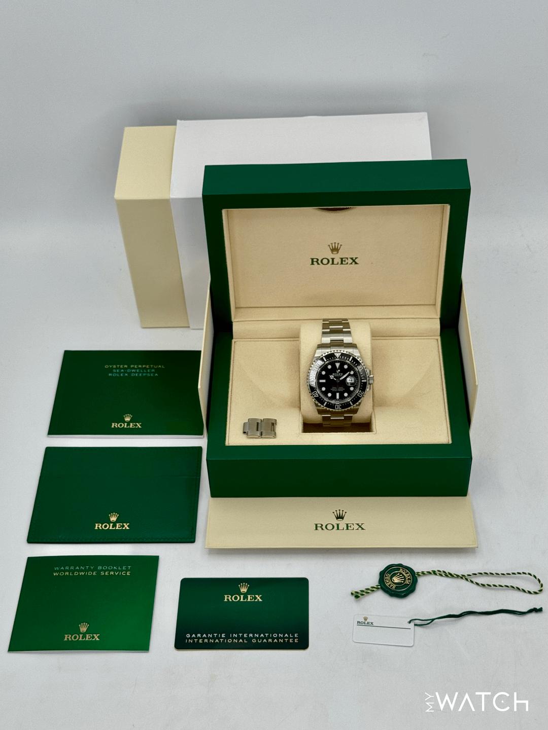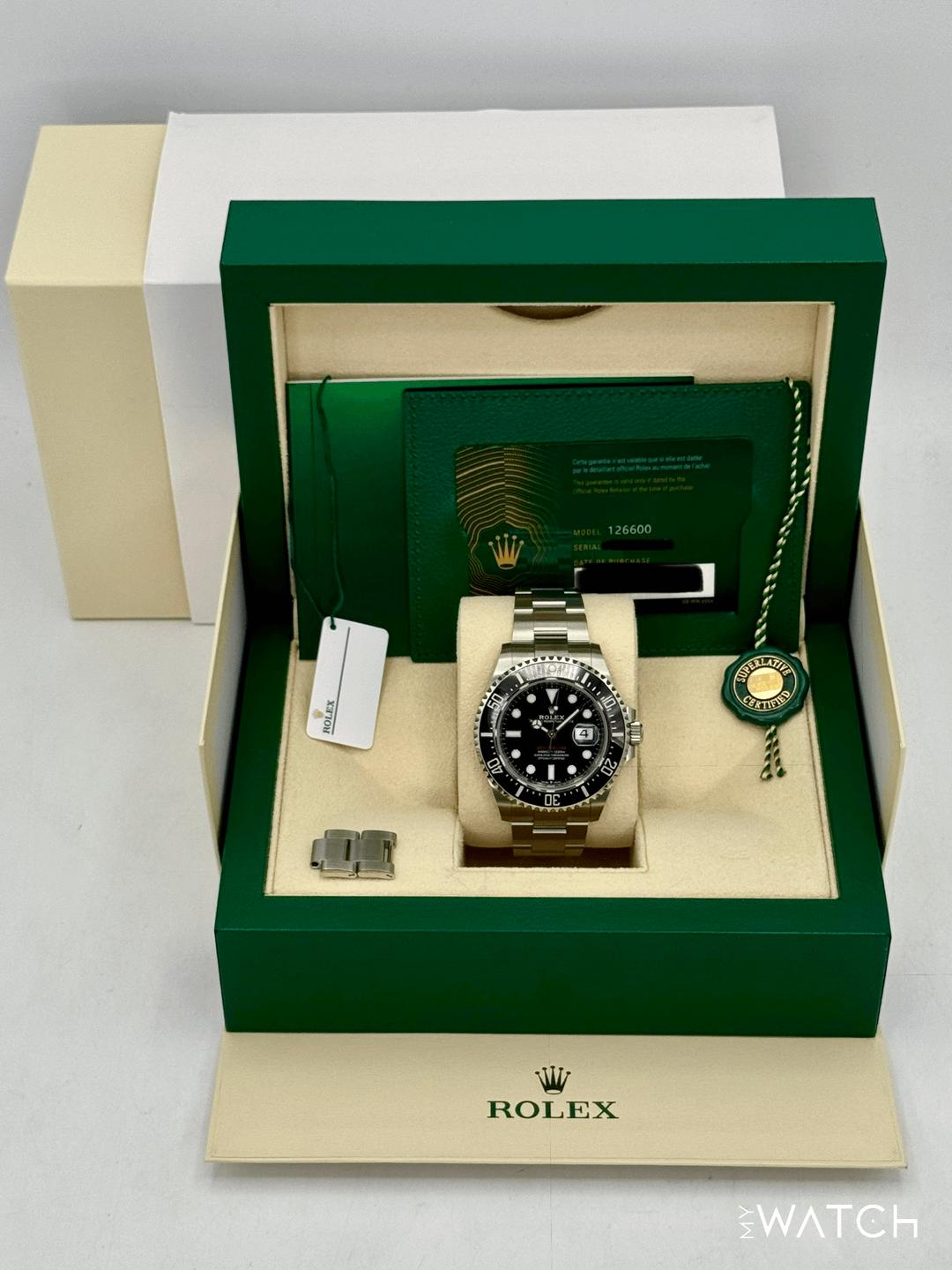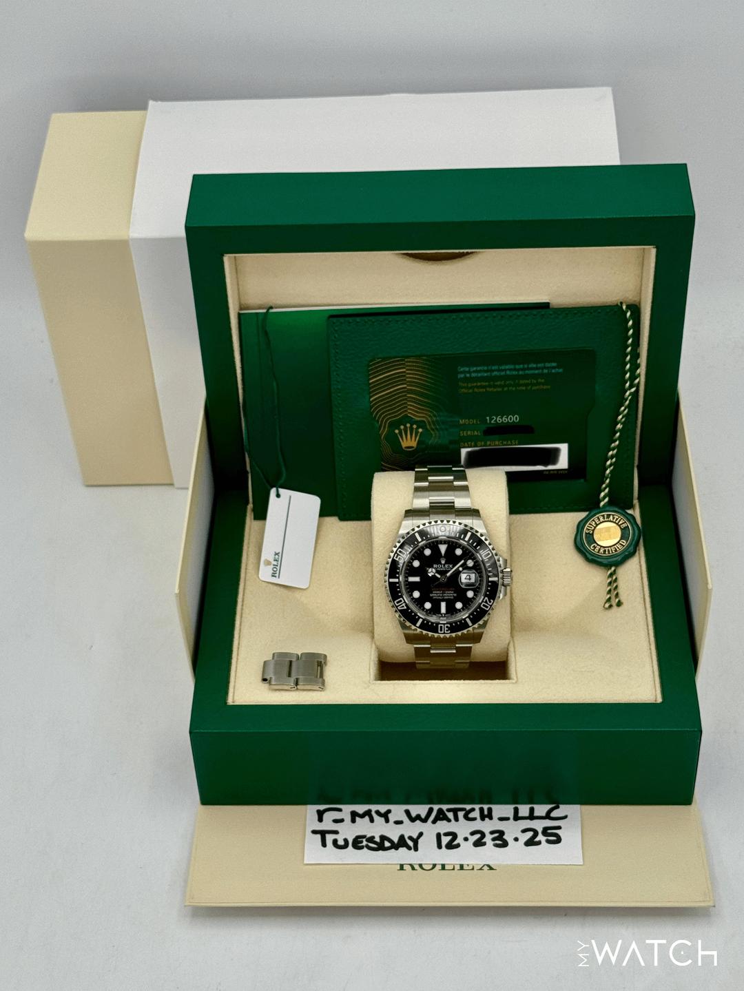 🔵**2023 Rolex Sea-Dweller 43mm 126600 Stainless Steel Oyster Bracelet Black Dial** 🔵**TRADE or SELL us your luxury watch, all brands considered. Message me details.** **Includes the following:** **✔️Original Rolex Double Boxed** **✔️Box and Papers - Yes** **✔️Warranty card dated November 2023** **✔️5 Year Manufacturer Warranty** **✔️Manual and Warranty booklets** **✔️Green and White Hang Tags included** **✔️Material: Oystersteel** **✔️Size: 8.25inch wrist (Full Links)** **✔️Watch is in excellent overall condition. Please see photos for details.** **✔️**[**Trades**](https://mywatchllc.com/pages/sell-rolex-watch) **welcome** Business Name: **My Watch LLC** LOCATION: Oak Park, Michigan ✔️[MyWatchLLC.com](http://mywatchllc.com/) for current inventory ✔️Google Business Listing [https://g.co/kgs/Cmd6FPW](https://g.co/kgs/Cmd6FPW) ✔️Business Hours M-F 9-6 ✔️Facetime/Video chat/calls welcome to view the watch interested. ✔️Contact: 248-422-0909 via text or call for quickest response. 🟢TERMS: Visit [MyWatchLLC.Com](http://mywatchllc.com/) for payments accepted 🟢REFERENCES/REVIEWS: We are well reviewed on all platforms from google, trust pilot, rolexforums, additionally we have 300+ reference in multiple FaceBook watch groups, reference checks welcome. 🟢SHIPPING: If you are not local, we offer Fully Insured FedEx overnight shipping in the USA for a fee. International shipping available. [https://mywatchllc.com/products/2023-rolex-sea-dweller-43mm-126600-black-dial-1](https://mywatchllc.com/products/2023-rolex-sea-dweller-43mm-126600-black-dial-1)