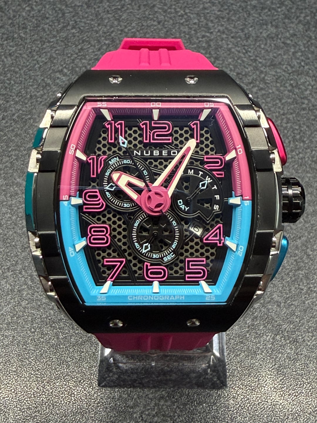 Hey folks Colors pop on this one, Bubblegum Pink version. This is the special limited edition that is no longer available - as opposed to the regular version on Nubeo site this one comes with both the point AND black rubber straps. Retailed for over $500. In excellent condition. I am not original owner but i see nothing wrong with it. Looks great. Super comfortable on the rubber straps which is nice due to its size. Overall just a cool fun piece when you'd like to add some color in your day :) $400 shipped conus PayPal F&F or Zelle. I have 60 positive transactions on watchexchange with good feedback so please read them. Also have an eBay store with hundreds of sales and hundreds of positive feedback so read them as well (offtherakcollectibles) Sale only, no trades. Ships from NYC so if you're in area can meet up locally. Please leave a comment here so I can view your transaction history and then message me if you're interested. Thank you! \---------- 120SpecificationsMovement Japanese Meca-quartz ChronographCase Material Stainless SteelCase Size (mm) 49.0Case Thickness (mm) 15.2Lug to Lug (mm) 51.0Dial Colour BlackIndex & Luminous Applied Index With Swiss NewliteLens Mineral LensCrown Type Screw DownBand 26mm Pink Rubber StrapWater Resistance 5 ATMWatch Weight (g) 120