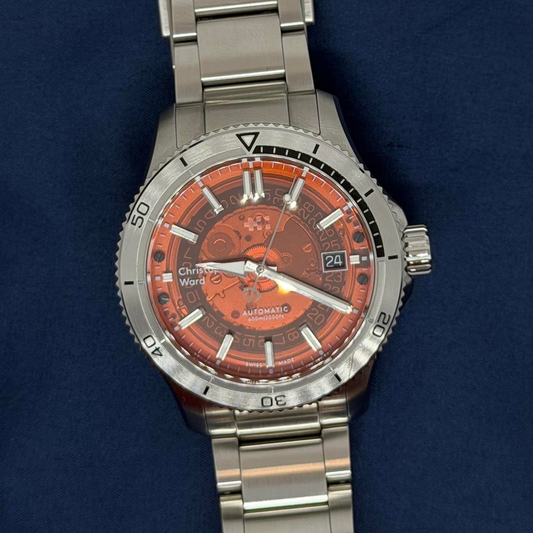 Christopher Ward C60 Sapphire Orange The watch is in excellent condition. Worn sparingly in rotation, showing minimal signs of use (faint hairlines or desk dives on clasp and on the bezel - shown in the photos). Comes in full kit. Translucent sapphire dial allowing a view of the movement. Diameter: 40mm Lug to Lug: 47.46mm Thickness: 12.9mm Case: 316L Stainless Steel Movement: Sellita SW200-1 Automatic Water Resistance: 600m / 60ATM Crystal: Sapphire with AR coating Back: Exhibition caseback Strap: Steel bracelet with micro-adjust [Datestamp](https://imgur.com/a/D9ZGbXV) €900 OBO shipped within EU - payment with PayPal FF / Wise / Revolut / Bank / GS (buyer covers fees)