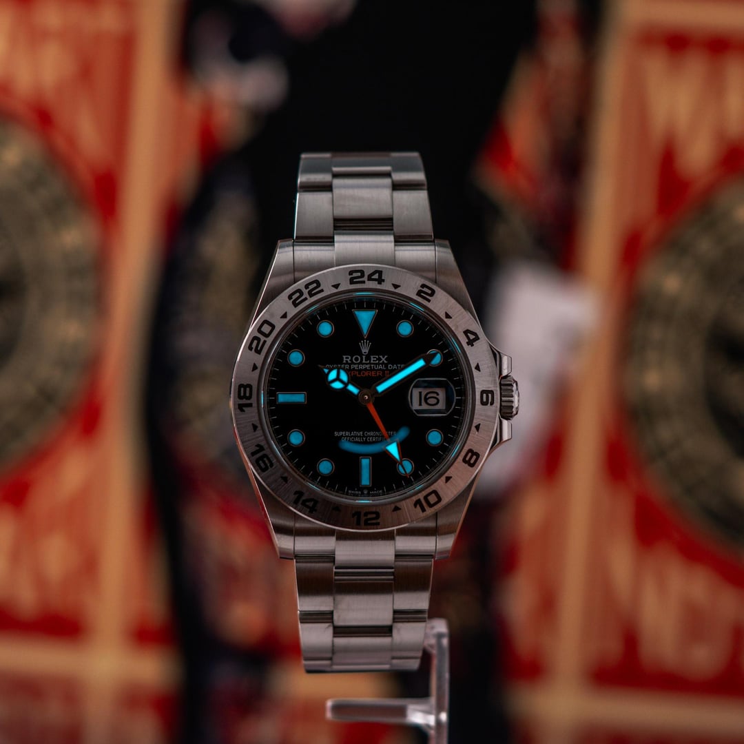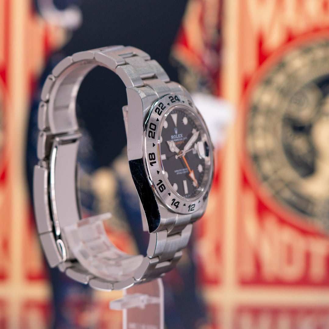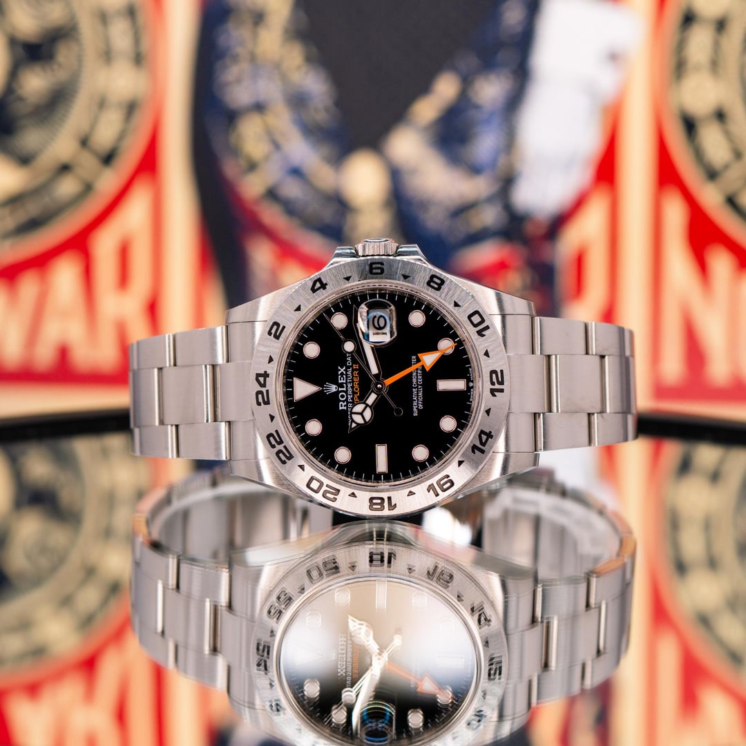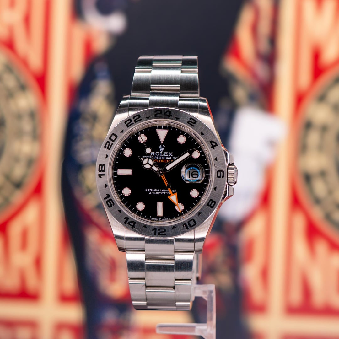 🏒🥅🚨 Rolex Explorer II 42MM Black Dial (226570) This timepiece is in good condition. It is a full set that includes the boxes (inner and outer), hangtags (white and green), an additional aftermarket strap, booklets, a cardholder, a purchase receipt, and papers dated October 22nd, 2021. 💰 Price: 💲10,350 USD  The Rolex Explorer II (226570) features a striking 42mm Oystersteel case, paired with a matching GMT bezel. The sleek black dial features luminous hour markers and hands, including the signature orange 24-hour GMT hand, ensuring excellent legibility in low-light conditions. A date window at 3 o’clock, magnified by Rolex’s iconic Cyclops lens, adds practicality. Completing the design is a sturdy Oyster bracelet in steel fastened by a folding clasp for a comfortable fit Condition & Photography Please review all photos for the most accurate representation of this watch's condition. Our macro photography is designed to capture every detail, including the smallest imperfections, ensuring you can buy with complete confidence. Shipping & Service We ship fully insured overnight via FedEx for your peace of mind. We are happy to arrange a video call to show the watch and answer any questions—just reach out anytime. We guarantee the authenticity and accuracy of all our timepieces. Your satisfaction is our highest priority, and we strive for a smooth, transparent, and 100% positive transaction. As a dedicated hockey coach and passionate timepiece collector (@pucks\_timepieces), I've spent years immersed in the world of horology. I now combine this passion with my hockey-playing daughters, and together we create the unique presentations you see here. Our photography is inspired by contemporary artists like KAWS, Banksy, Joan Cornellà, Death NYC, and Shepard Fairey. This artistic approach adds a distinctive, creative character to how each watch is presented. When you purchase from me, you can expect a seamless experience. I'm highly responsive and happy to provide extra photos or details to ensure you feel great about your purchase. Timestamp: [https://drive.google.com/file/d/1mRRqUalwWYE0fIaSVAihZXannjDyv62l/view?usp=sharing](https://drive.google.com/file/d/1mRRqUalwWYE0fIaSVAihZXannjDyv62l/view?usp=sharing)