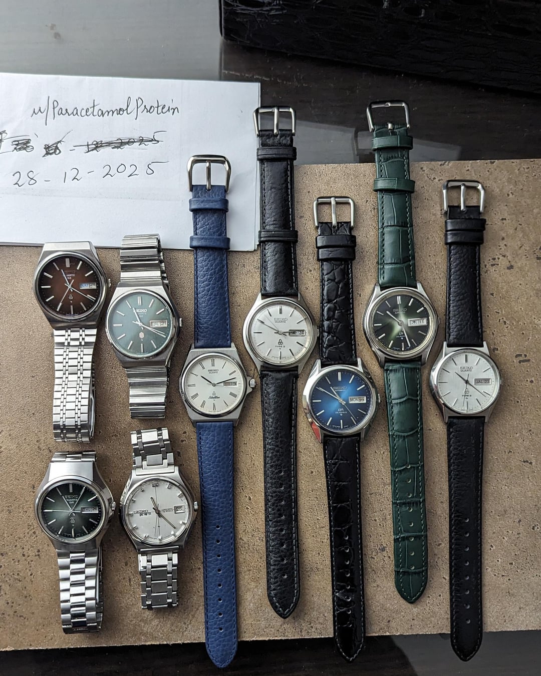 Hey folks. Here's the Post Christmas sale post with incredible Seikos \*\*\*\* 1- Timestamp 2- Seiko Cherry Red dial QZ - 0923 - kanji day calendar - $239 3- Seiko QZ Green dial - kanji day calendar - $229 4- Seiko LM blue dial 5606 - kanji day calendar - $319 5- Seiko Type II 7123 deep textured dial kanji day calendar - $155 6- Seiko QR green dial kanji day calendar - $225 7- Seiko LM 5606 - white dial kanji day calendar - $235 8- Seiko LM fume green dial $279 9- Seiko Silverwave $165 ***MISSED TO UPLOAD THE SEIKO BABY GS CASE TYPE II FOR $159*** Payment: PayPal G&S Shipping: $20-25 to standard addresses worldwide