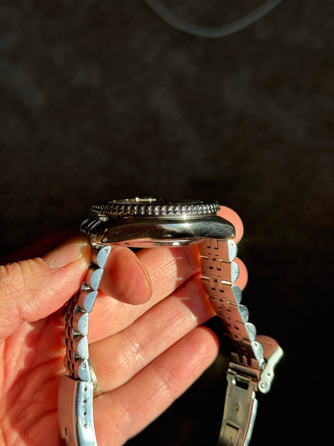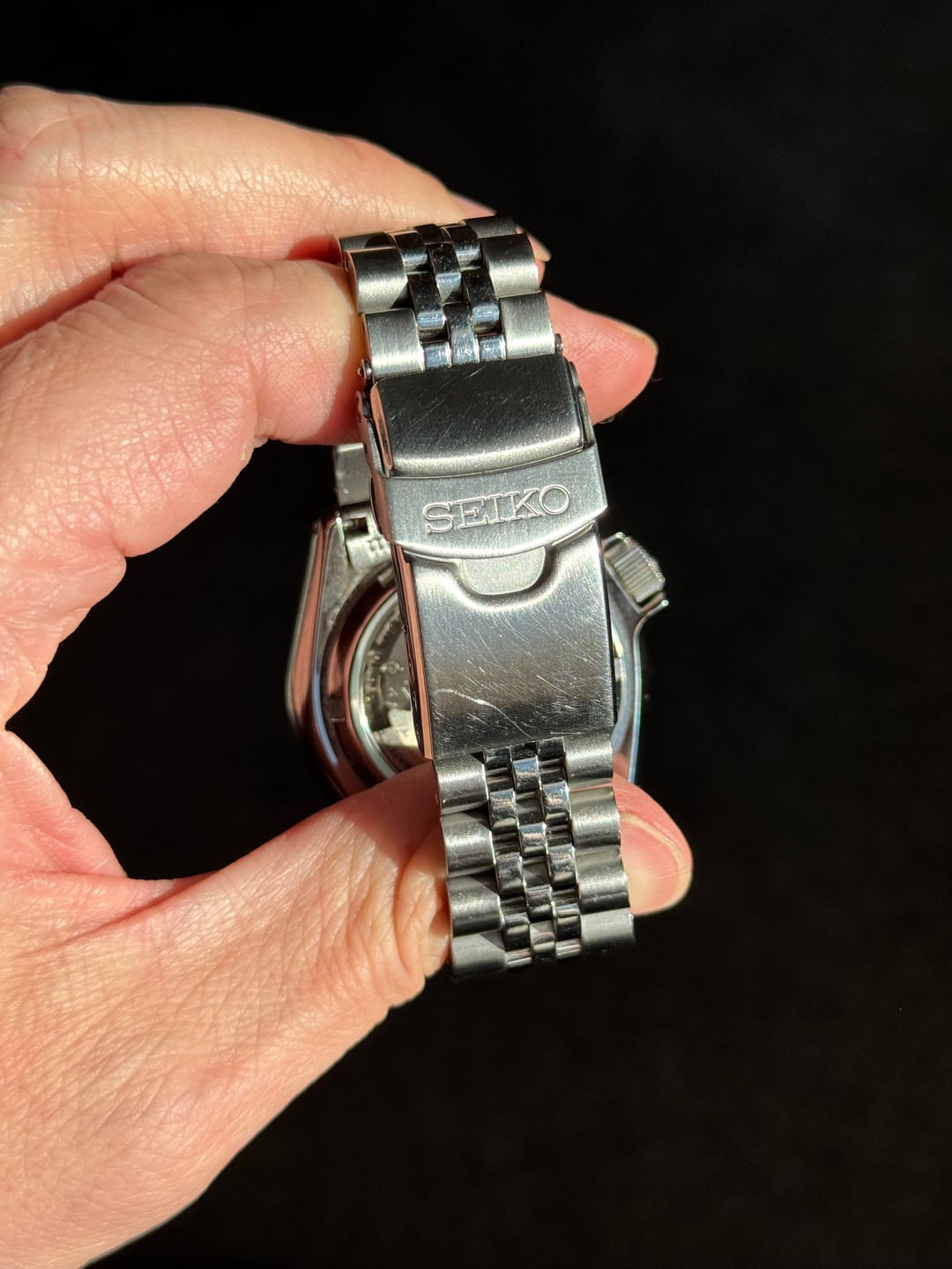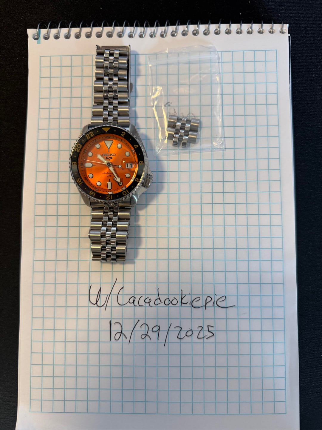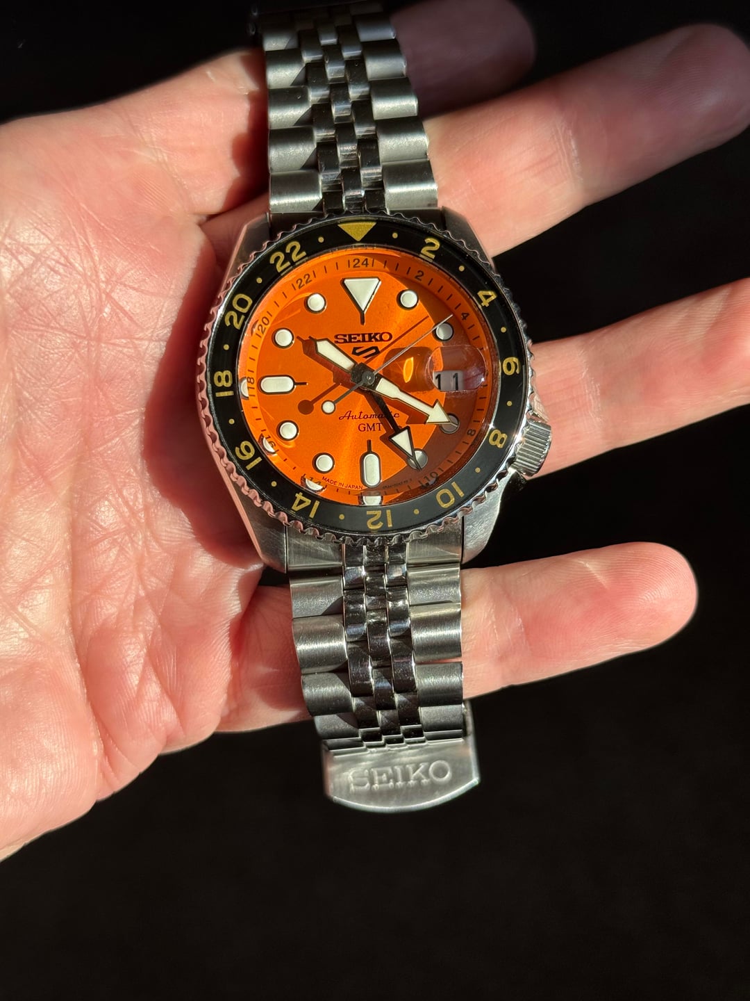 Hey Watchex I have a great deal for you today. Seiko SSK005 Orange GMT Runs well and is in great condition. I’ve only worn it a handful of times. The pictures I took were in direct sunlight, so the wear is less pronounced in normal lighting conditions. Has been sized to my 6.25 inch wrist and includes 2 additional links as well as 3 additional micro adjust holes. Watch only, no box or papers. Price is $215 shipped conus. I accept zelle/venmo/paypal friends and family. Feel free to reach out with any questions. No trades please.