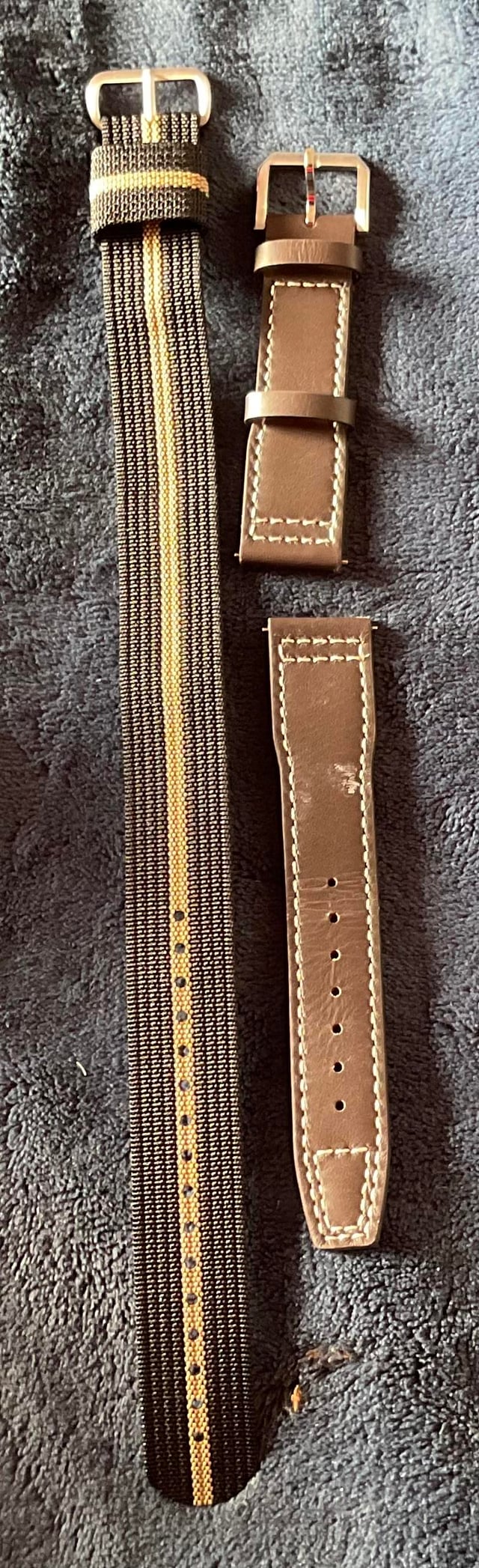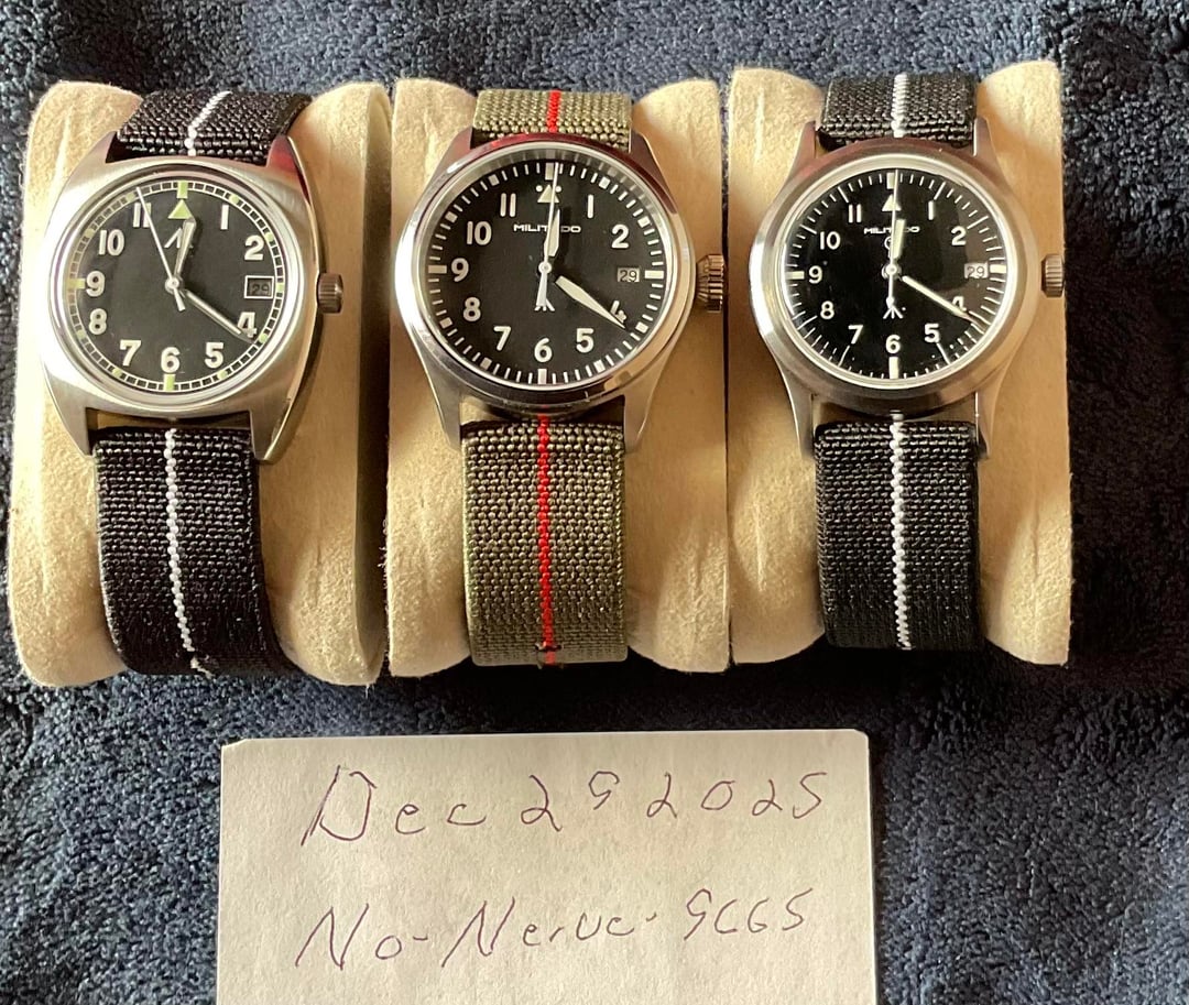 Prefer to sell the watches together ML14 - IWC Pilot Watch homage. 36mm diameter K1 domed mineral crystal with AR coating Ronda 515 quartz movement BGW9 lume ML17 British DOD W10 homage. 36mm diameter K1 domed mineral with AR coating Ronda 515 quartz movement BGW9 lume ML21 Pilot watch homage. 38 mm sapphire crystal with AR coating Ronda 515 quartz movement BGW9 lume Each watch has excellent AR coating and lume. Each comes on a AliEx stretchy nylon quick release strap. 2 of the unworn OEM straps are also included. Asking $99 Or Best Reasonable Offer PayPal F&F USPS Ground Advantage to a US Address