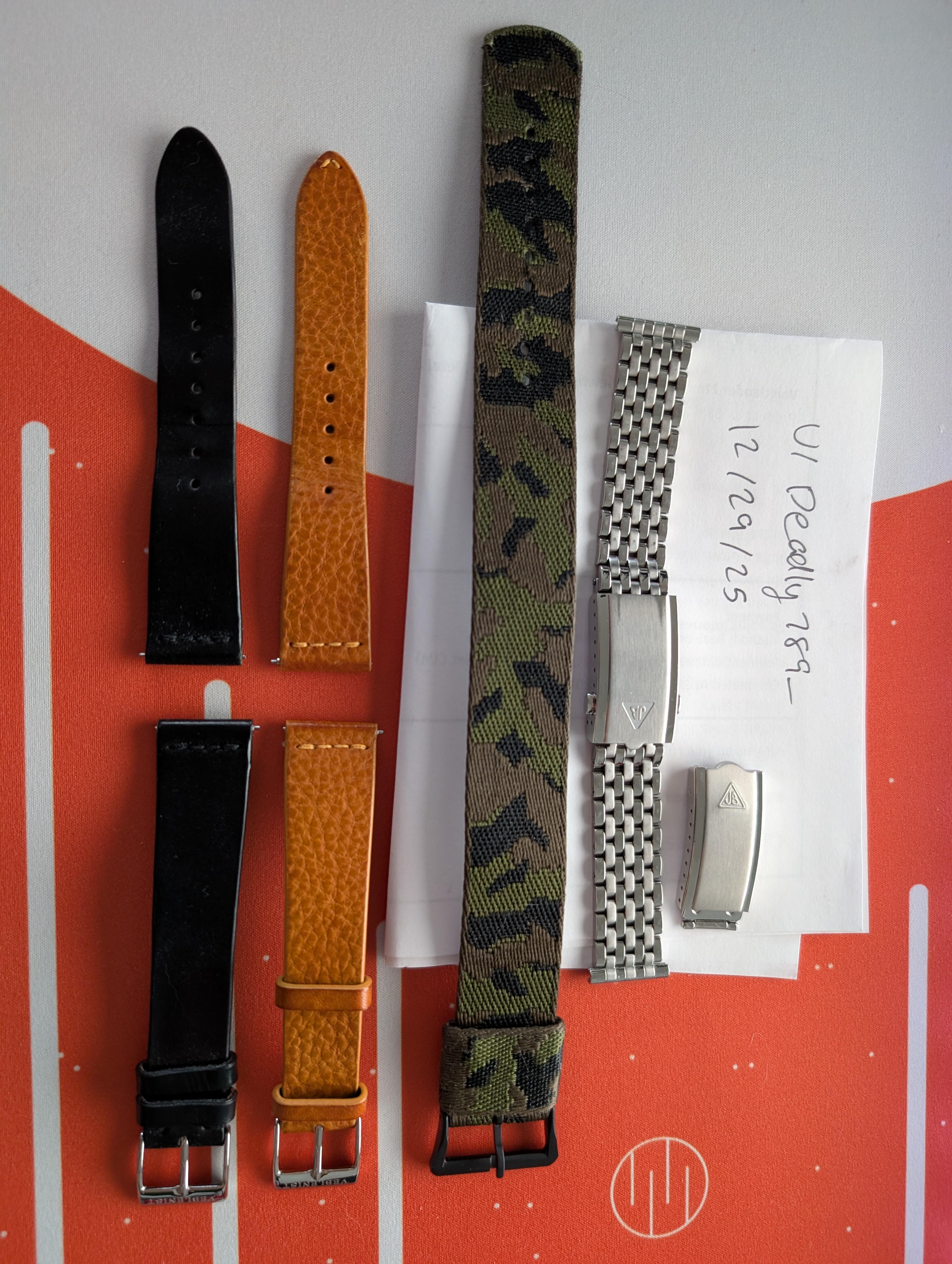 Selling straps I haven't used or haven't worn in a while. 1. 19mm Forstner 7-Row Beads of Rice + Forstner's Push-Button Milled Clasp $154 shipped 2. 22mm Crown & Buckle Jungle Camo + flared PVD buckle $36 shipped 3. 19mm Veblenist Unlined Black Shell Cordovan + polished buckle, 110mm/90mm $56 shipped 4. 19mm Veblenist Tuscan Brown Calfskin leather + polished buckle, 110mm/90mm $50 shipped Open to offers, will discount on bundles