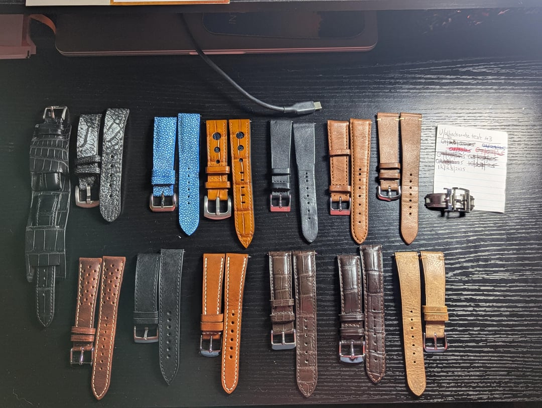 Hi Watchex! Up for sale are these High Quality Straps. **All are in either New or Very Good Condition. Free Shipping for orders above $40.** *Add Delugs Style Spring Deployant Clasp to any strap purchase for $25 (See pics 15,16,17). 90% identical to the ones offered by Delugs*. Link: https://delugs.com/products/spring-deployant-clasp?srsltid=AfmBOoroudvsHxmG0rtUenk0gncxdx7A-BjGNEZu3YoijhdJyonS720y **All Straps are 20mm and standard length.** **Top (Left to Right)** ~~**Bulang and Sons Black Crocodile Leather Bundt Strap - $125** (Retail - $335) [BnS link ](https://bulangandsons.com/products/newman-black-croco-leather-watch-strap?variant=56023146070361&country=AE¤cy=EUR&utm_medium=product_sync&utm_source=google&utm_content=sag_organic&utm_campaign=sag_organic&gad_source=1&gad_campaignid=22482519586&gbraid=0AAAAAC_JAe7e1JyhxQMQX7jIO95D2_ojt&gclid=Cj0KCQiA6sjKBhCSARIsAJvYcpOJe2A_sfSWRrX7MF436V-awXCLqVvgeWJ_Y0p9KJx3-dad9ZQkR3kaAqZaEALw_wcB)~~ ~~**Jack Foster Nubuck Ostrich Leg Limited Ed. Made in USA - $59** (Retail - $130+)~~ ~~**HD Straps Blue Stingray, Very Supple - $49** (Retail - $65+) [HD link](https://hdstraps.com/products/blue-stingray-leather-watch-strap-rd17?srsltid=AfmBOoryUxayoH-msU_U4vRQhjHLtrIItzHt6wsm_NFaflsvq0k2RLcK)~~ **HD Straps Custom Crocodile belly & Ostrich Leather Combo Rally Strap - $49** (Retail - $85+) **Colareb Black Essential Italian Leather - $40** (Retail - $55+ shipping/tariff) [Colareb Link](https://colareb.it/products/essential?_pos=3&_sid=5fce690c5&_ss=r&variant=39316304855220) **Colareb Bologna Brown Italian Mutton Leather - $45** (Retail - $60+ shipping/tariff) [Colareb Mutton Link ](https://colareb.it/en/collections/all-products/products/bologna) **The Strap Tailor Wax Flat Calfskin Minimal Stitch Brown - $69** (Retail - $183) [Strap Tailor Link](https://thestraptailor.com/products/wax-flat-calfskin-strap-light-brown-w-minimal-cream-stitching?_pos=30&_sid=732640b27&_ss=r) **Bottom Left - Right** **Watch Gecko Beaufort Racing Badalassi Leather Perforated Rally Strap - $59** (Retail 100+) [Watchgecko link](https://www.watchgecko.com/products/beaufort-racing-genuine-leather-perforated-watch-strap-dark-brown) ~~**Tuns Black Pueblo Leather Strap - $30 (Retail $50+)** [Tuns Link](https://www.etsy.com/listing/1528387795/handmade-pueblo-black-leather-watch?ga_search_query=Pueblo%2Bblack&ref=shop_items_search_1&pro=1&frs=1&sts=1&logging_key=d9e309309fddf755c35fe7c18e51b53ab96baf75%3A1528387795)~~ **House of Straps Wickett and Craig Bridle Tan - $49** (Retail - $120) - *Note: I've made and additional tang buckle hole in this strap.* [House of Straps Link](https://thehouseofstraps.com/collections/wickett-craig-bridle-watch-straps/products/wickett-craig-bridle-tan-full-stitch-leather-watch-strap) **VinaStraps Genuine Alligator Leather Strap, Dark Brown - $25** ~~**Swiss Army Victorinox Inox Genuine Alligator Leather Strap Dark Brown - $25**~~ **HD Straps Light Brown Strap - $25** (Retail - $50) *Add Delugs Style Spring Deployant Clasp to any strap purchase for $25 (See pics 16,17). Quality is almost identical to this clasp from Delugs* *Free shipping for orders above $40 (otherwise add +$5)* Happy to answer questions. **Check out my other strap listings!**