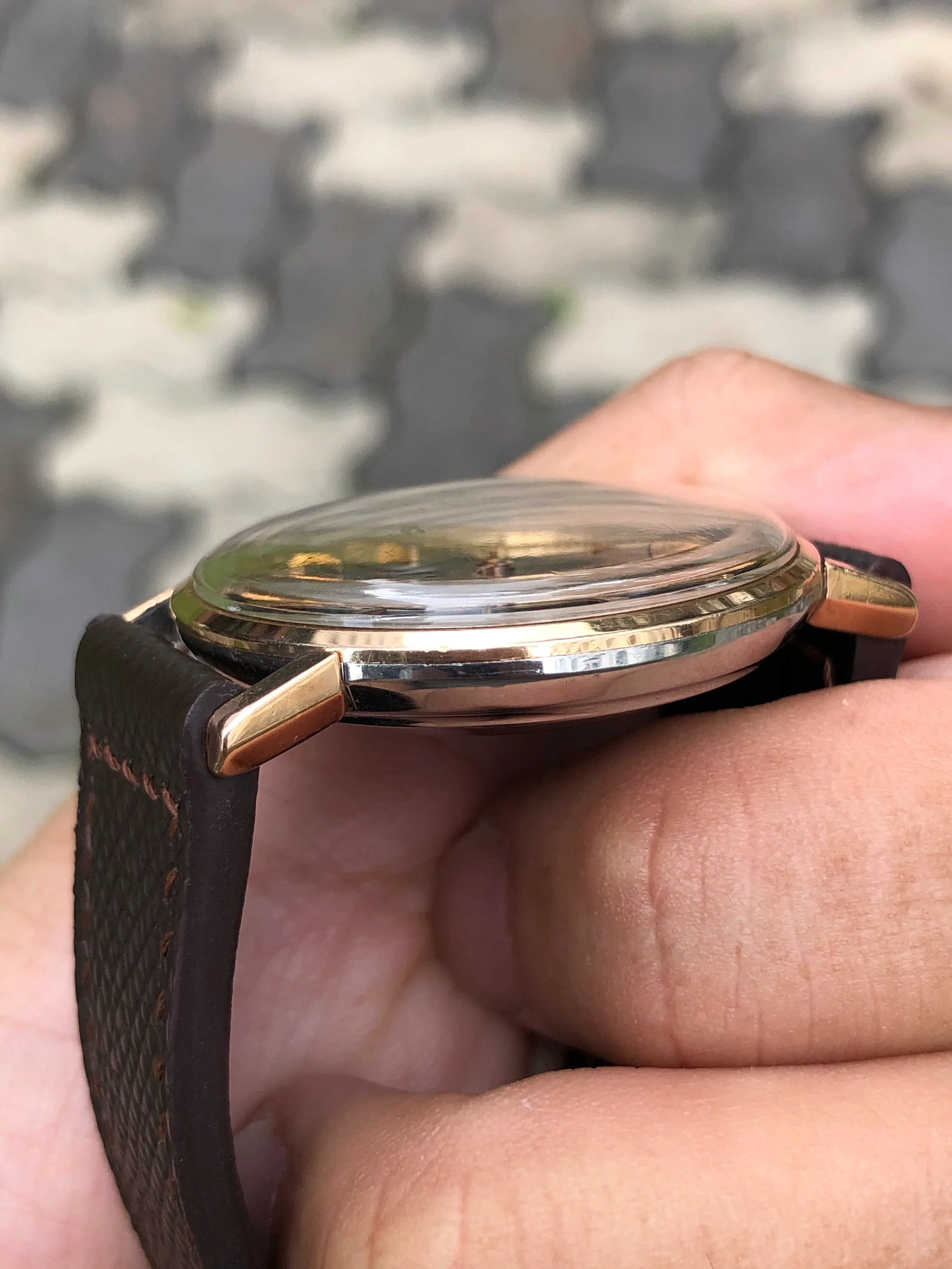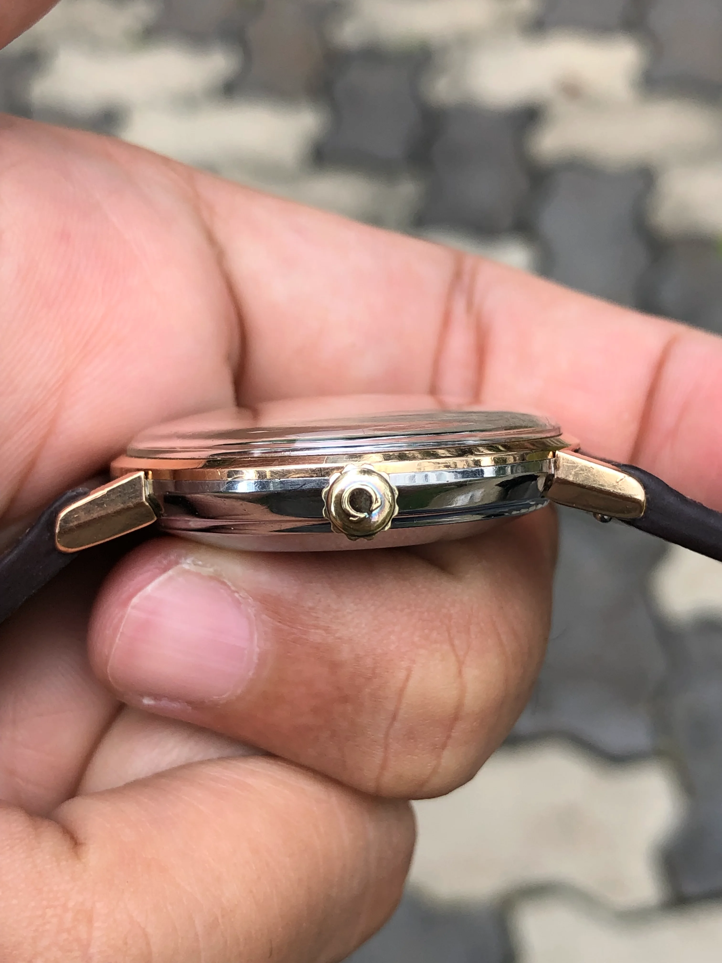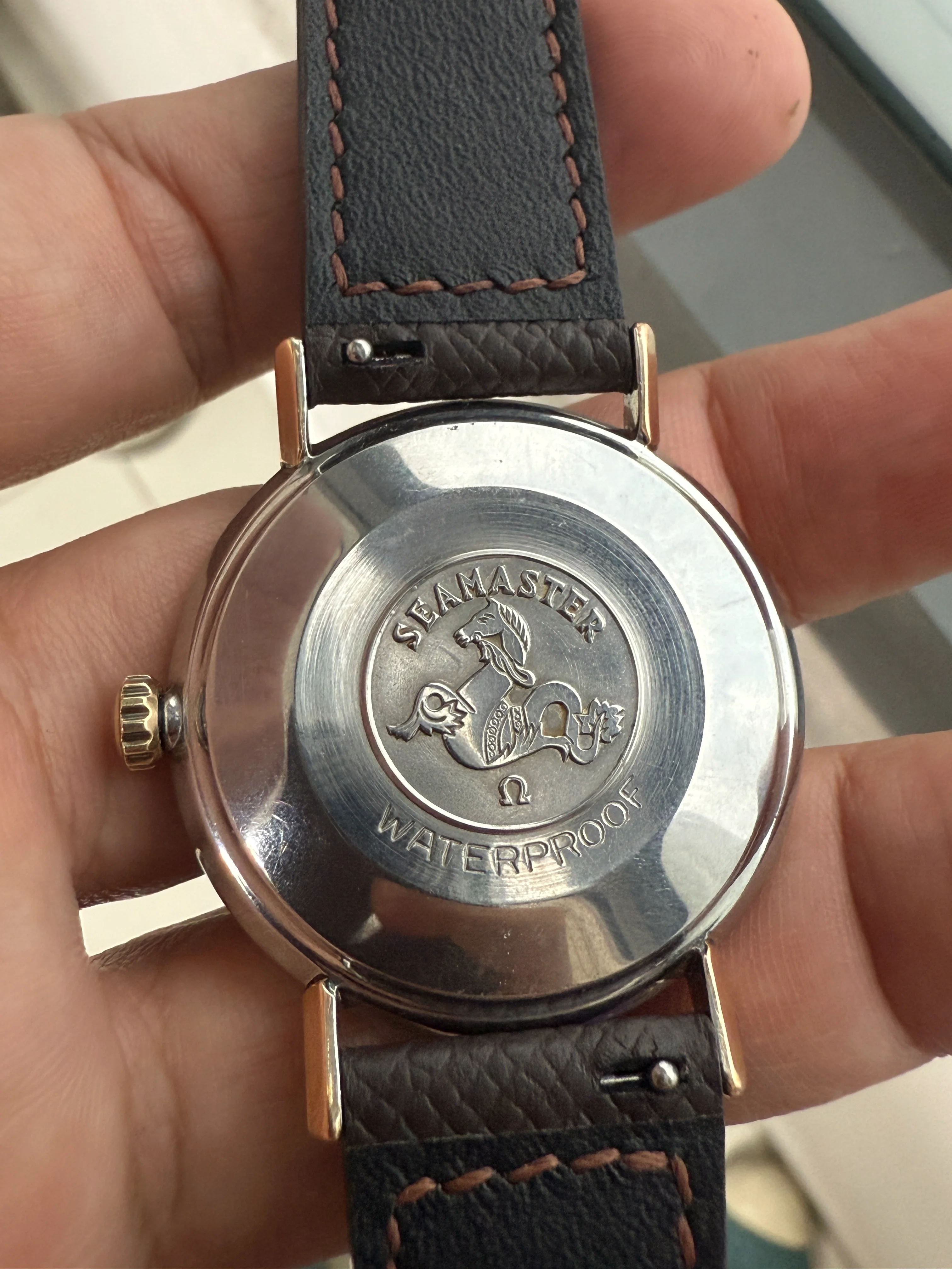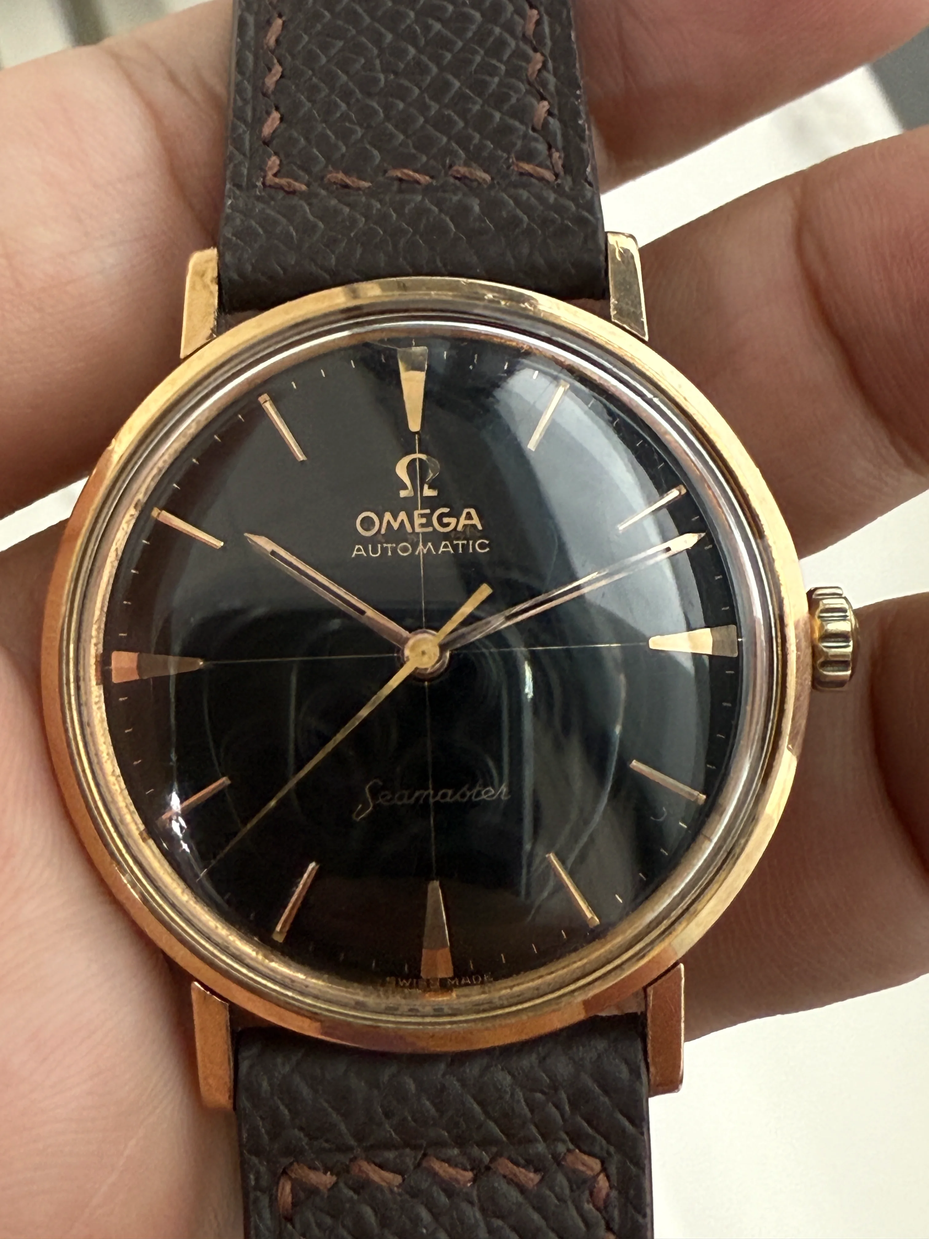 - Strap: Brand new hand-made brown leather strap, original Omega gold-plated buckle.