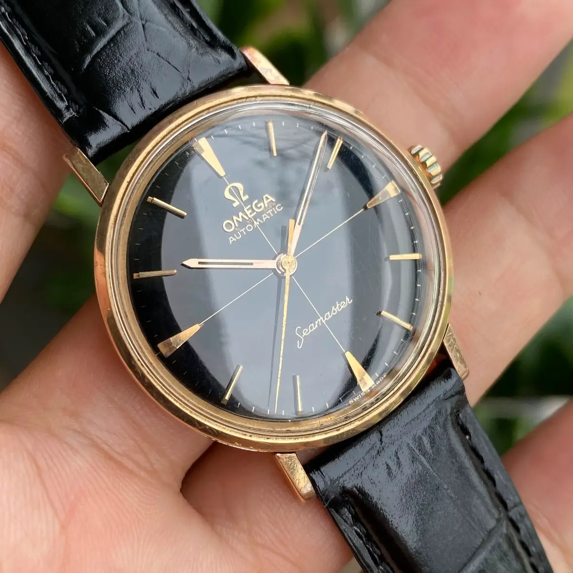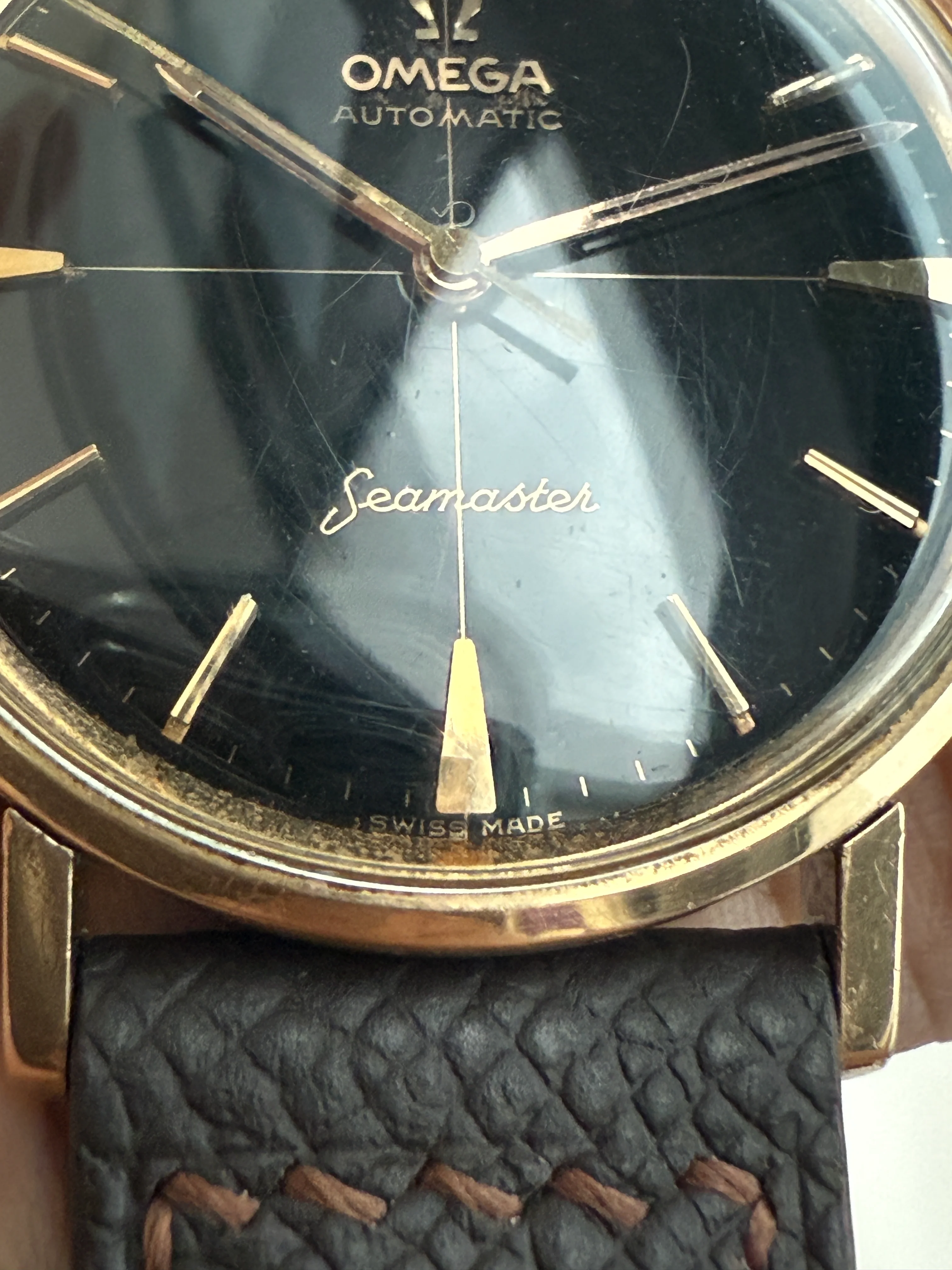 - Dial: Original black lacquer cross hair dial; gold tone hands and hour markers; all lume on hands and hour markers are lost; no date; pencil hands; prints, hands and hour markers are all good; some signs of age aroud the applied logo and hour markers, which is typical to black lacquer dial.