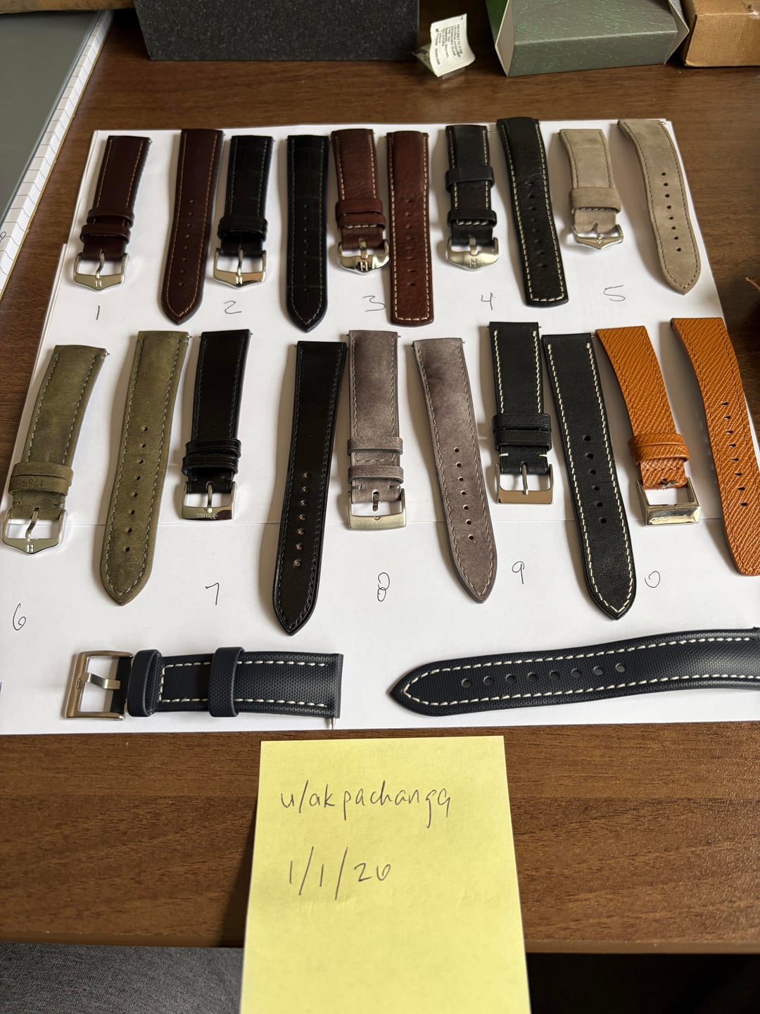 Who doesn't need more 20mm straps? I have 11 excellent condition, high quality, straps for sale. All 20mm with quick release spring bars. They have minimal wear as you can see in the picture. I have a 7.25 inch wrist, for reference, and all of these are either custom ordered for my wrist or, in the case of the Hirsch straps, large size. I'll take Zelle or paypal. Let me know if you have any questions. And here they are as numbered below: **Upper Row** 1. Hirsch Performance James (Brown) = $65 2. Hirsch Performance Andy (Black) = $65 3. SOLD Hirsch Mariner water resistant (Brown) = 40 4. Hirsch Mariner water resistant (Black) = 40 5. Hirsch Osiris Nubuk (Grey) = $25 **Lower Row** 6. Hirsch Heritage (Army Green) = $60 7. SOLD Delugs Shell Cordovan Slim (Black) = $80 8. SOLD Tuns 115x80 (Grey) = $35 9. SOLD Tokonuma Handmade (Blue w/ White Stitching) = $35 10. SOLD Merkur Epsom (Tan and incredibly comfortable) = $15 11. SOLD Sailcloth (Navy Blue w/ White Stitching) = $15