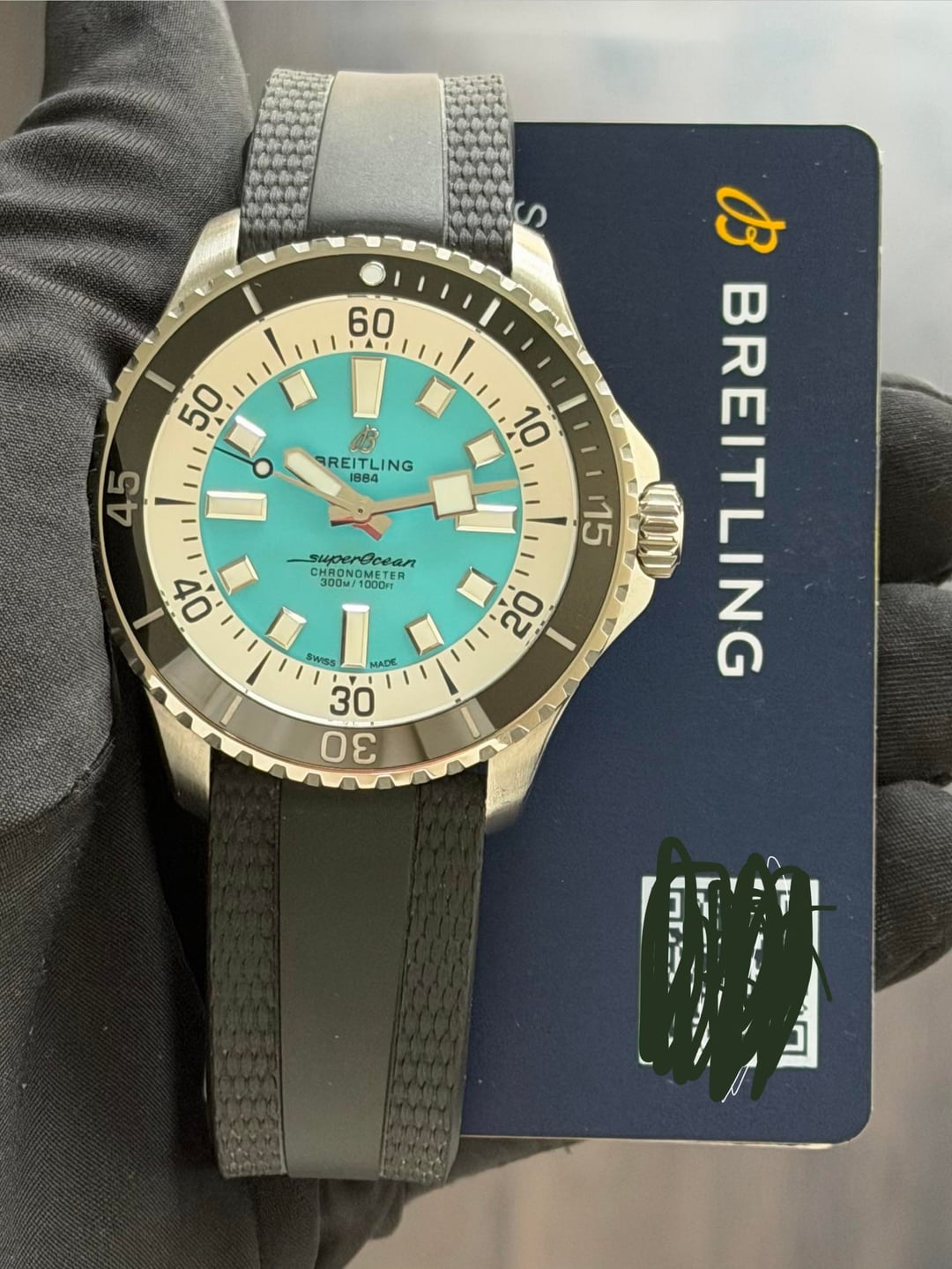 💎 Breitling SuperOcean 44 “Tiffany” 💎 A17376.. 44mm. Watch & card. Active warranty till June 2028. Clasp has been polished. 8.5” max fit on strap. **$3375** / Zelle, Venmo, or WU accepted. Timestamp: https://imgur.com/a/xLnEiiE I have **tons** of references on multiple platforms including WatchExchange. We also are a 5-STAR rated business on Google!