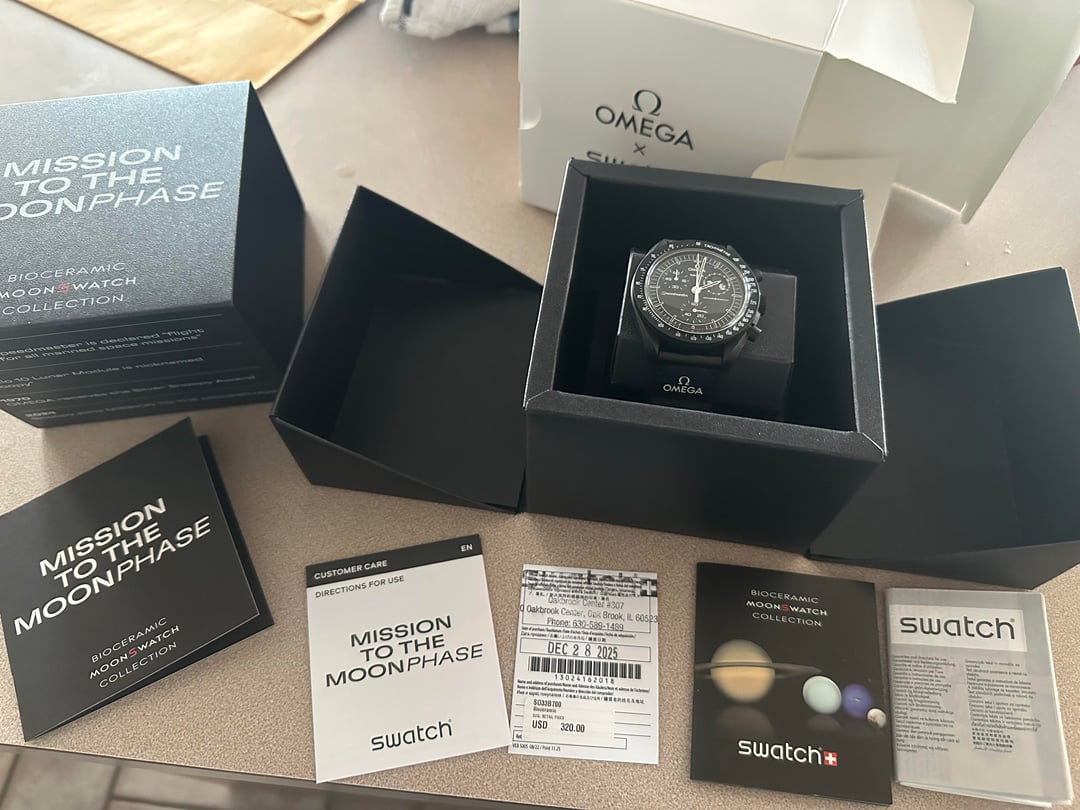 Hi WatchEx! I’m selling my Omega x Swatch Mission to Moonphase Moonswatch. I purchased this watch brand new from a Swatch store and wore it once. It is like-new with the full kit. Asking what I paid, $345 (retail plus tax), including domestic USA shipping. Payment via PayPal F&F or Zelle preferred. Please reach out with any questions! Timestamp - https://imgur.com/a/NbvyULz