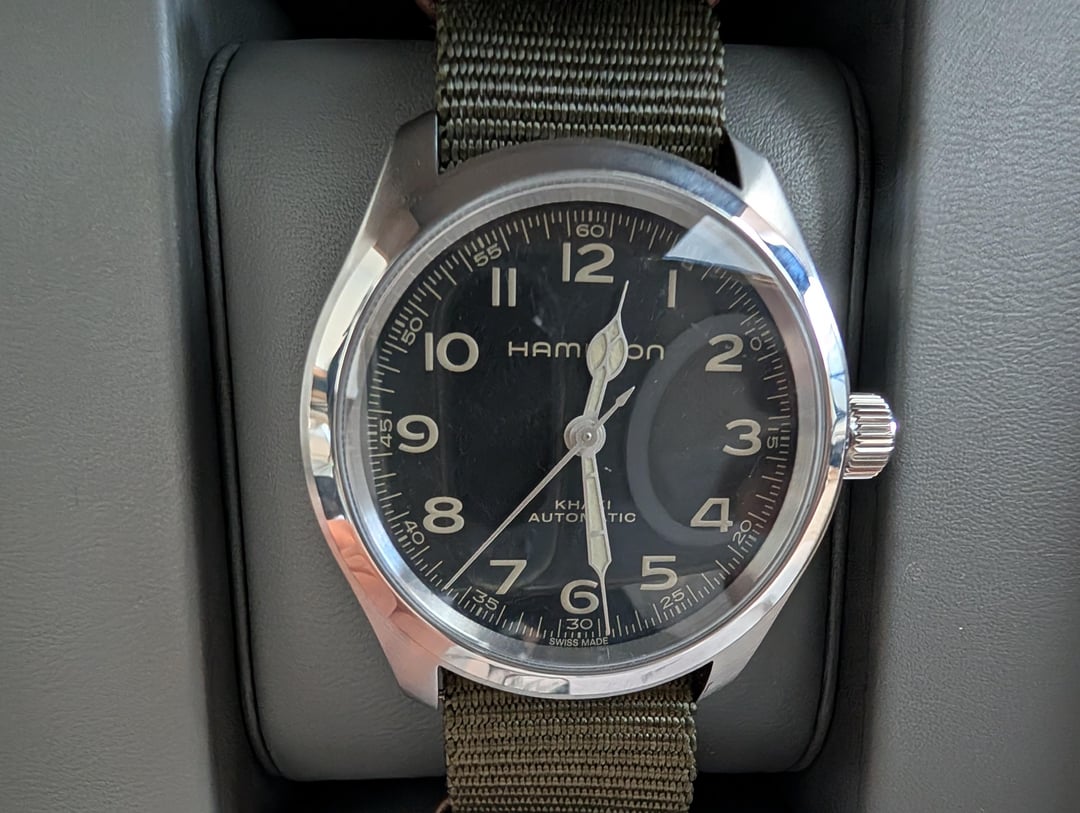 Up for sale I have a Hamilton Murph in 38mm. This watch was purchased directly from Hamilton and still has 15 months of warranty coverage. This sale includes the full kit - box, tags, warranty card, manual, even purchase receipt. Also included is the Hamilton NATO strap that it is currently on. The stock strap is included and in near mint condition. Watch condition is very good with no noticeable marks on the watch body or bezel. The crystal is near perfect, but in the right light you can see a very faint scratch on the crystal around the 1 o'clock on the dial. I tried, but couldn't get it to show in any photos and I never notice it in day to day use. Looking for $690 shipped within CONUS. I accept all common forms of payment and am happy to ship G&S (+3%) as well as provide any additional photos or information on the watch. Thanks for looking! PS I have an [additional Hamilton leather strap up for sale](https://www.reddit.com/r/Watchexchange/comments/1q4s1w0/wts_hamilton_brown_leather_strap_20mm/) separately and I'm happy to throw it in at a nicely discounted price if you'd like that as well.
