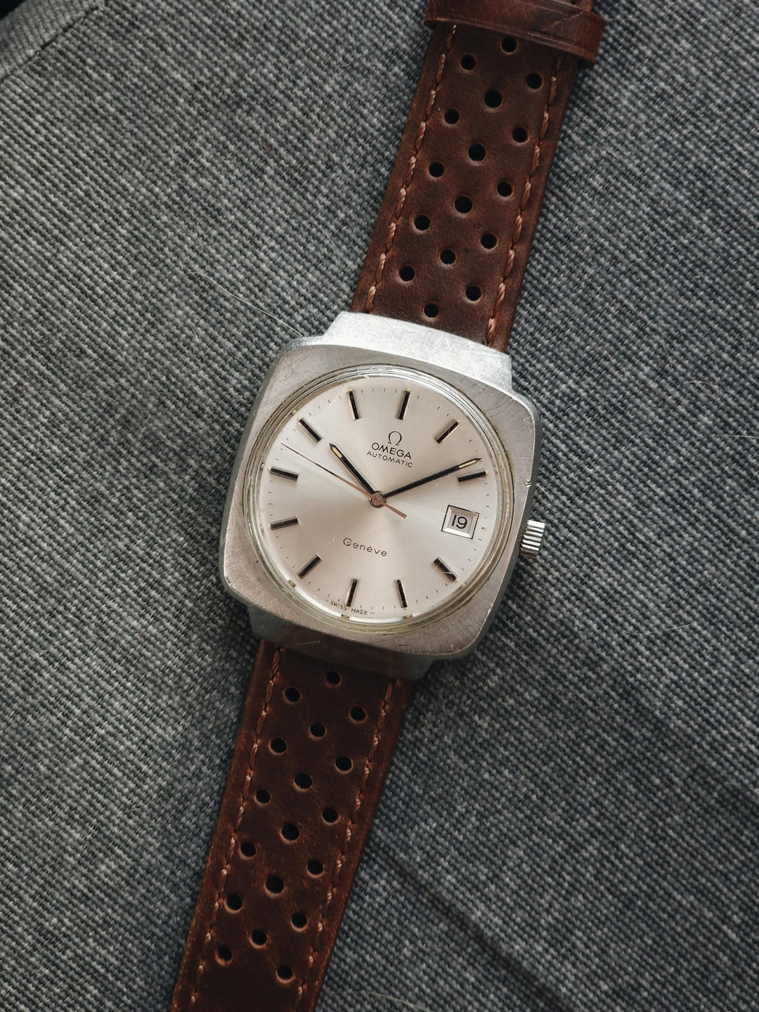 For sale is an Omega Genève "Jumbo" reference number 166.0164. According to Omega's records, it was only produced between 1973 and 1975. This particular example is from 1973, according to the serial number. The watch features a silver dial and has a decent case size of 36.6 mm that wears larger due to its square shape, hence the nickname “Jumbo”. Inside is the legendary Omega 1012 automatic movement, with quickset date. **Details & More** **Condition:** Good. The dial looks pristine, but the crystal and case have some markings. Please see the pictures for full condition and clarity. **Case Size:** 37 x 43.6mm stainless steel case with a thickness of 10.3 mm and a lug width of 20mm. **Movement:** Omega 1012 - automatic, 23 jewels, 28,800 bph, 42-hour power reserve. With quickset date. The movement winds and runs okay, although accuracy isn’t guaranteed and we don’t know its service history. **Other Information:** * Signed crown and crystal. * Aftermarket racing strap. **Price:** Asking $550. Please add $25 for worldwide shipping. Payment methods include Wise, ACH transfer, Revolut, Bitcoin (On-Chain or Lightning), or PayPal G&S for buyers with solid references. Add +7.5% for currency conversion fees on the latter. Portugal has suspended all local post shipments to the US, but I can still ship with UPS ($100). Established seller with over 220 transactions – buy with confidence! Make sure to follow me on Instagram (@daily.worn) to check out the newest additions. [Pictures](https://imgur.com/a/xBOadIL) [Timestamp](https://imgur.com/a/WH6PEol)