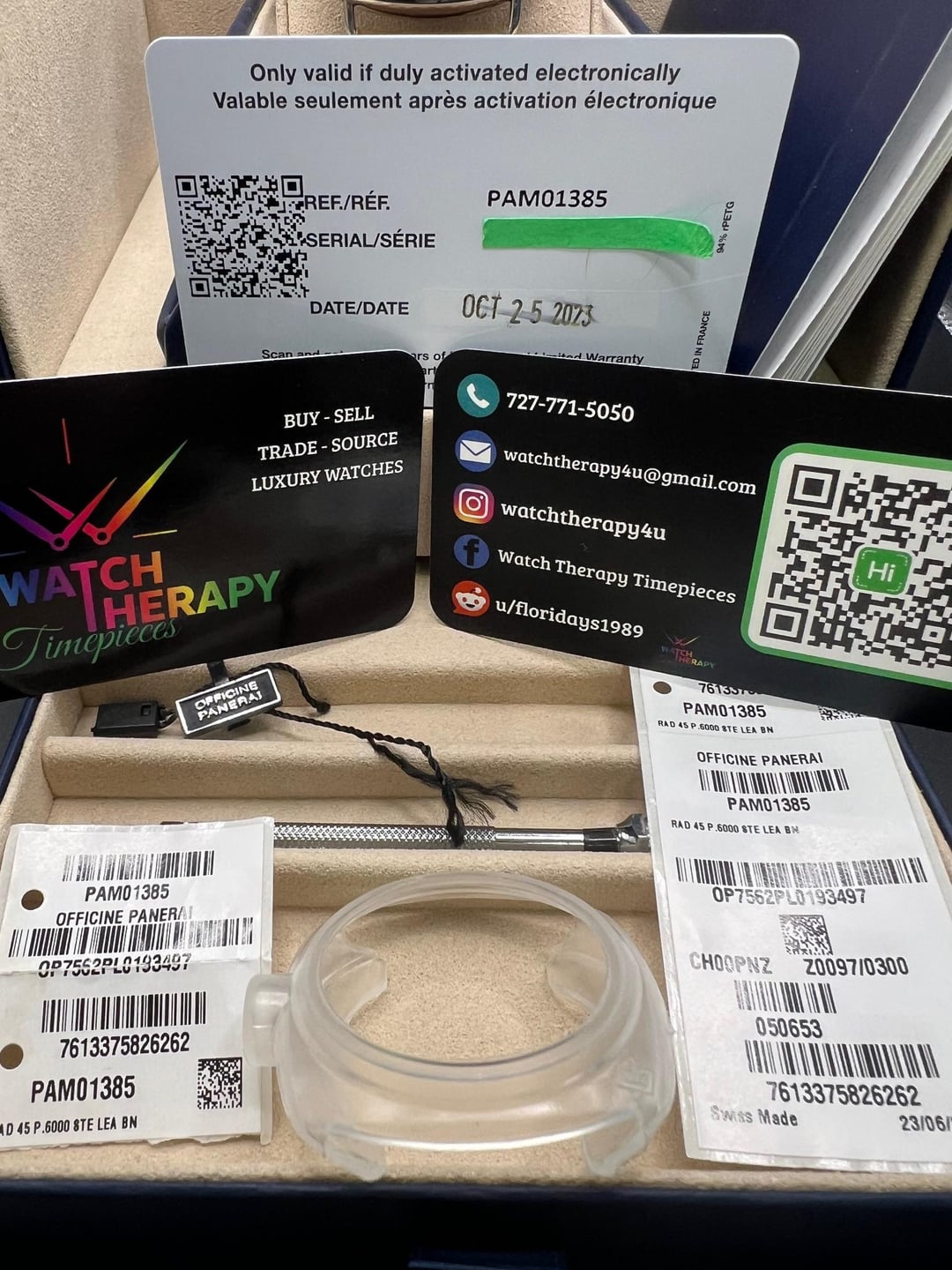 **F/S: Panerai Luminor Officine Brown Dial B&P PAM01385/PAM 1385 45mm** **Limited Boutique Edition 1 of 300, warranty through 2031!** **Specs:** \* Beautiful Matte beige dial- Sapphire crystal \* Manual-winding \* 45mm SS case \* 100M Water Resistance \* 72-hour power reserve \* P.6000 movement with small second’s display **Includes**: Warranty card 11/2023, all boxes, stickers, hang tag, screw driver, booklets/manual. **Condition:** Great pre-owned condition- there are a few superficial hairlines on the polished areas. Crystal is clean. **Price: $4199.00+ Insured shipping to your local FedEx for pick-up in Con US.** I am also open to a face-to-face public transaction in or around the Tampa Florida Region, within reason. I have many strong and viable references within Reddit and from Buy/Sell/Trade Watch Facebook groups. Always willing to jump on a call or meeting link to show you the watch. Thank you and please reach out if you have any questions or concerns. Florida residents may be subject to sales tax w/o a valid reseller cert. ***No Trades, TY*** **Location**: Tampa Florida **Payment:** Zelle or Wire Timestamp: [https://imgur.com/a/JmzaIxj](https://imgur.com/a/JmzaIxj) FB: Watch Therapy Timepieces IG: [watchtherapy4u](https://www.reddit.com/u/watchtherapy4u/)