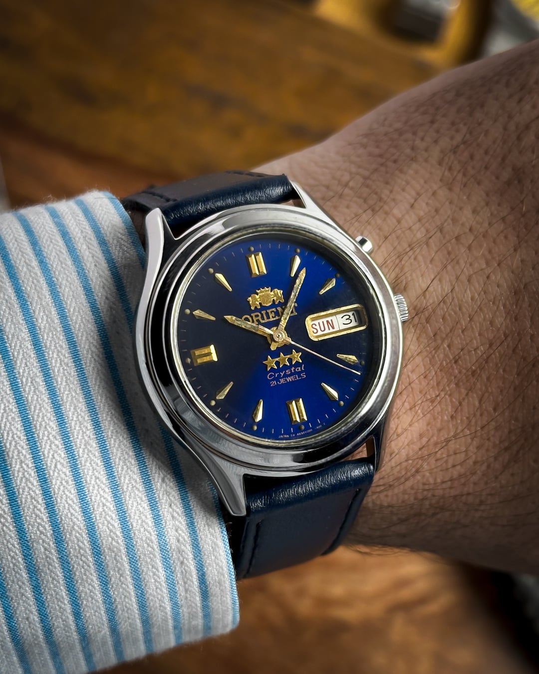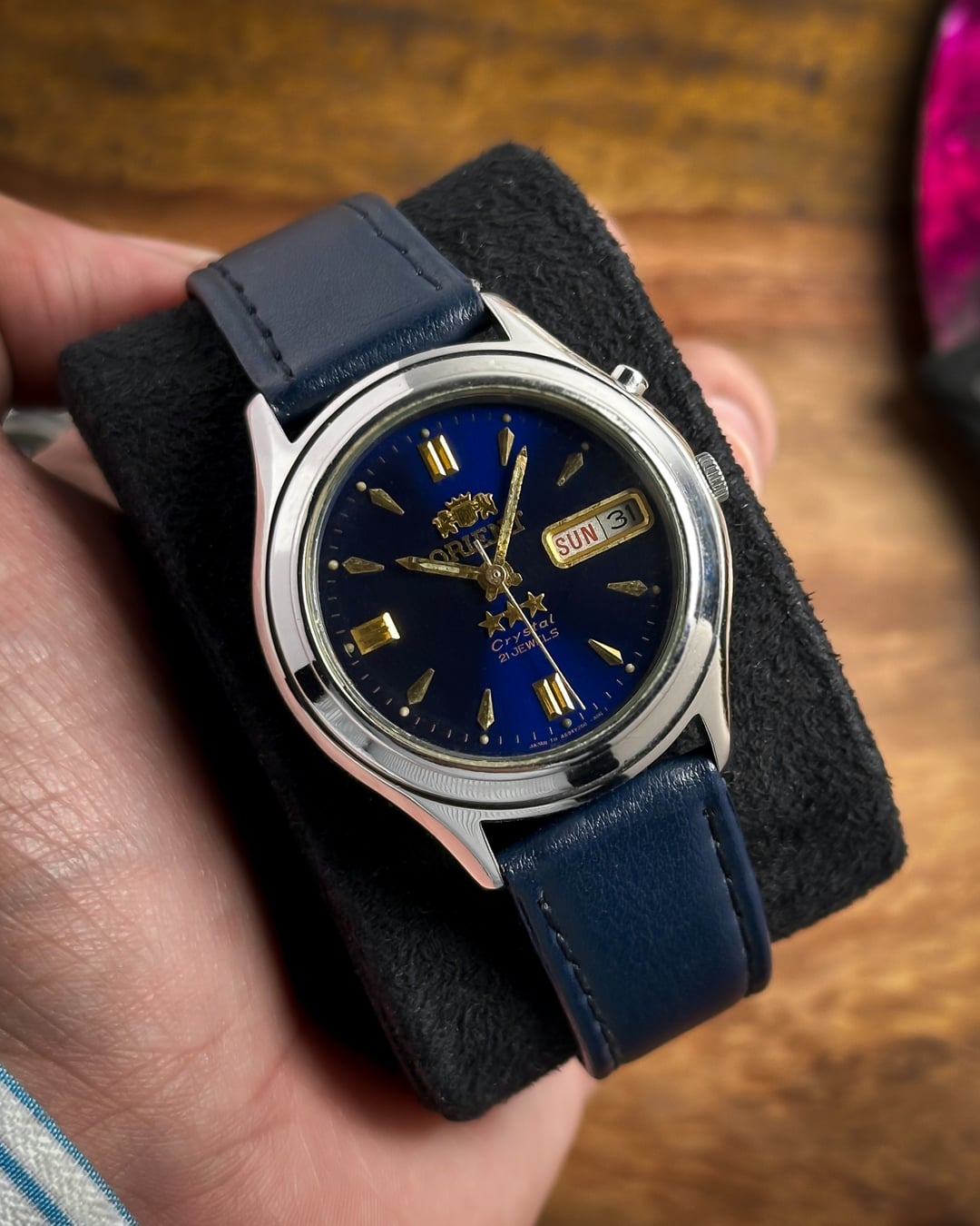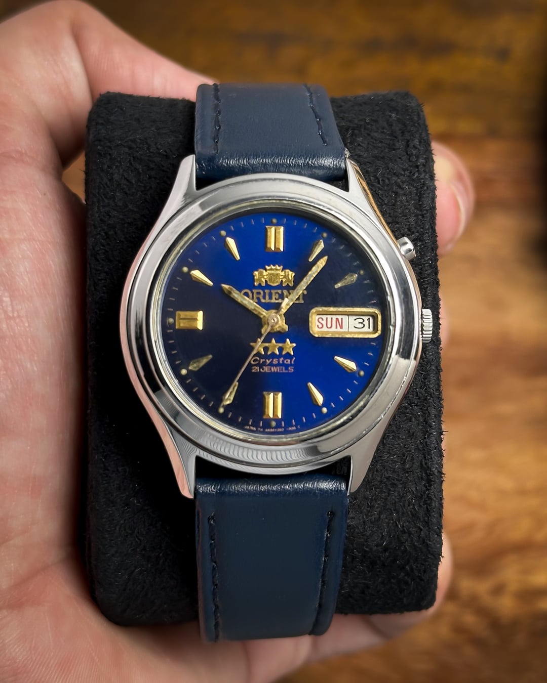 [Timestamp](https://drive.google.com/file/d/1fXen8iwvENUUbq3vq7xFApIt3bOJdf52/view?usp=sharing) Hey Watchexchange! Today I’m offering a stunning piece of 90s Japanese watchmaking: the **Orient Tri Star "Crystal."** While Seikos are often utilitarian, this Orient leans into a more regal, luxurious aesthetic with a dial that truly steals the show. The **Sunburst Royal Blue dial** is incredibly dynamic, shifting from a deep navy to a brilliant azure as it catches the light. It features a sophisticated layout with **gold-tone dagger indices** and **double-baton markers** at the 12, 6, and 9 positions. The classic **gold pencil hands** and the iconic applied **three stars** and Orient crest give this watch a rich, high-end presence. The case is a **perfectly round, polished** design with elegant, flowing lugs that hug the wrist comfortably. True to the classic Tri Star movement, you have the standard **crown at 3 o'clock** and the signature **quick-set date pusher at 2 o'clock**, adding a tactile, vintage feel to the operation. I have paired this with a **new plain blue leather strap** that matches the dial perfectly, creating a unified, bold look that works as well with a suit as it does with a crisp white shirt. **🔹 Key Dimensions** * **Case Diameter:** 37mm * **Lug-to-Lug:** 43mm * **Thickness:** 11mm * **Lug Width:** 18mm 💵 **Price: $135 shipped!** 📦 **Payment: PayPal F&F** or G&S (**+4.5% fee by buyer**) or **bank wire (US banks accepted)** 📩 **DM me for more photos or a custom timestamp.** If you're looking for a vibrant blue dial with a bit more "soul" and flair than a standard Seiko, **The Royal Regency** is a fantastic choice. Follow my [**Instagram**](https://www.instagram.com/everistwatches/) and **Reddit profile** for more **vintage drops**.