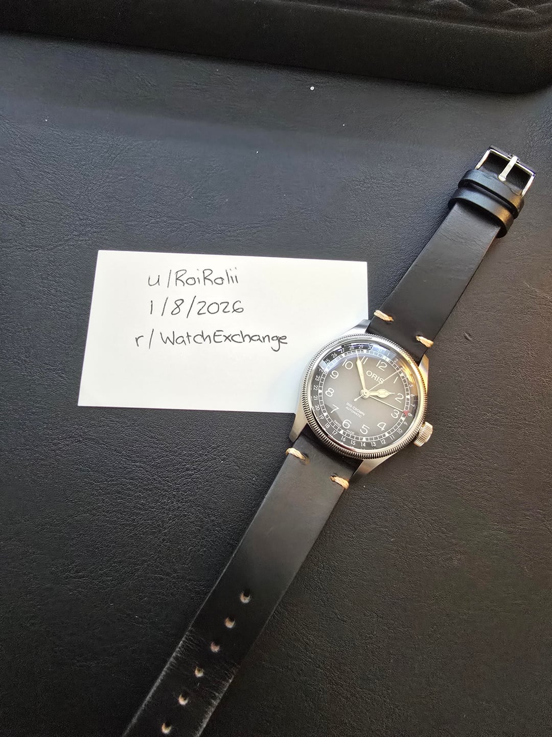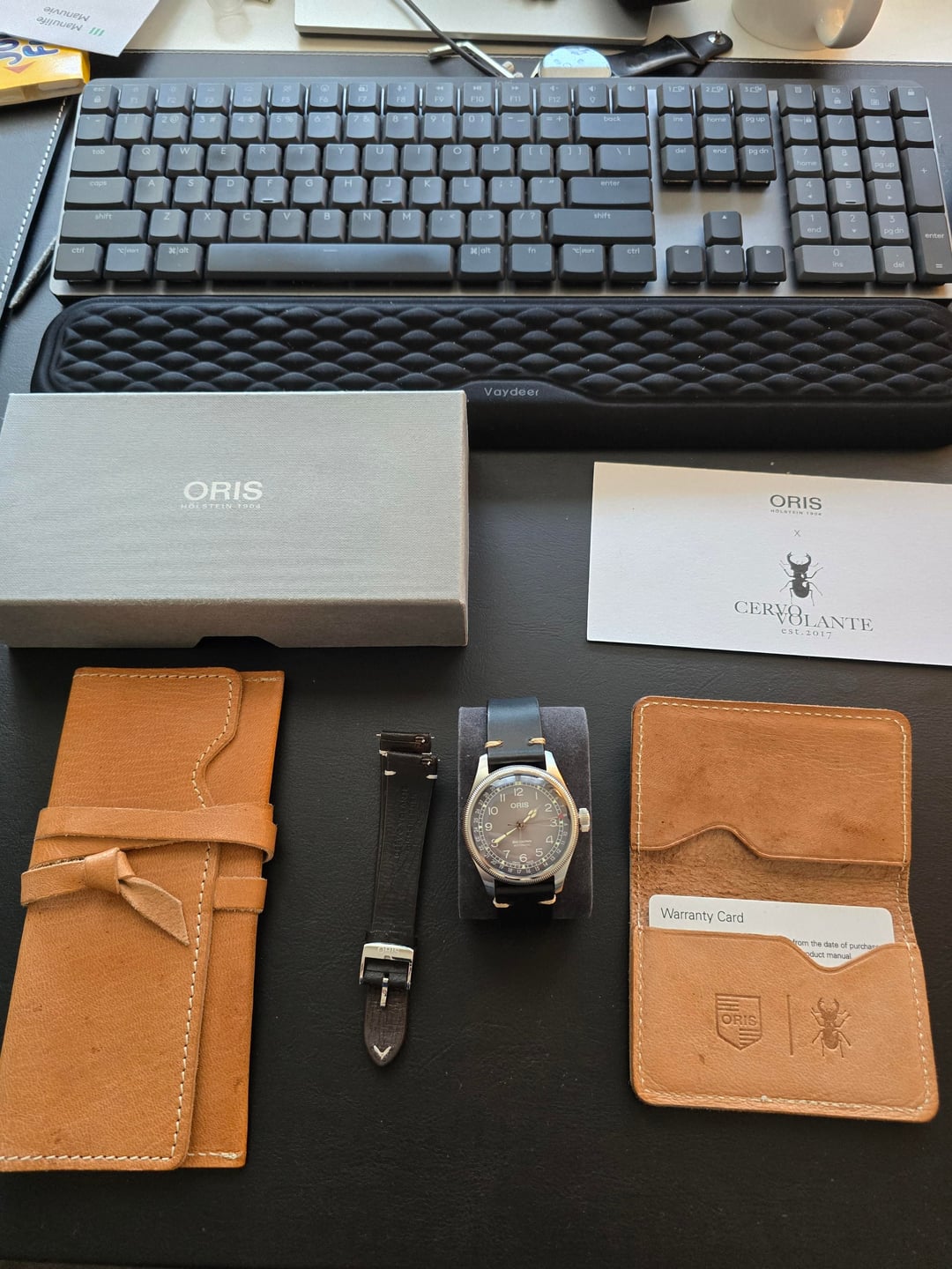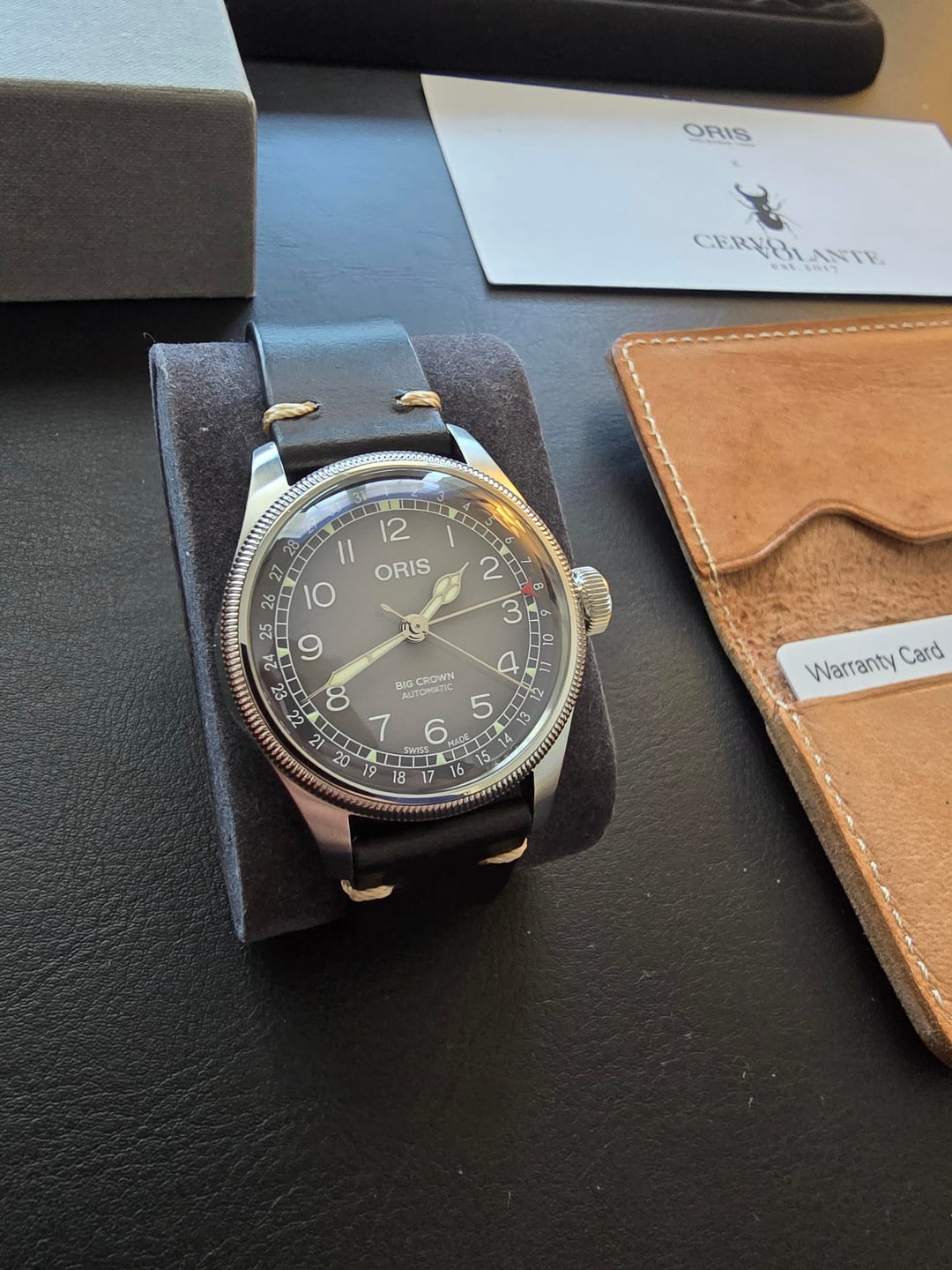 Selling an excellent / near-mint condition Oris Big Crown Pointer Date x Cervo Volante (38mm) in the highly sought-after grey dial configuration. This watch has been barely worn, functions perfectly, and presents beautifully. I’m only letting it go because an opportunity came up to purchase my grail and I need to free up funds. Condition Mint / excellent overall No issues whatsoever Crystal, case, and dial are clean Runs great. What’s Included Full box & papers Warranty card dated July 2024 Factory OEM Cervo Volante strap & buckle Black Horween leather strap (19mm) Warranty valid until July 2027 Specs Reference: 01 754 7779 4063 Case size: 38mm Thickness: ~12.5mm (including domed sapphire “bubble” crystal) Lug-to-lug: ~45mm Lug width: 19mm Movement: Oris Calibre 754 (automatic) Crown: Screw-down Water resistance: 50m Price: $1,425 USD Location: Canada/US Payment: Venmo, Zelle, PayPal G&S (buyer covers fees) / e-transfer (Canadian buyers) Shipping: Happy to ship within Canada & CONUS - I can drive across the border and ship to avoid import fees and duties (dare I say tarrifs?) Wearability Extremely comfortable on wrist with classic Big Crown proportions. The domed sapphire and pointer date complication give it tons of character while remaining very versatile. More product details can be found on the website: https://www.oris.ch/en-CA/product/watch/big-crown/big-crown-pointer-date/01-754-7779-4063-Set