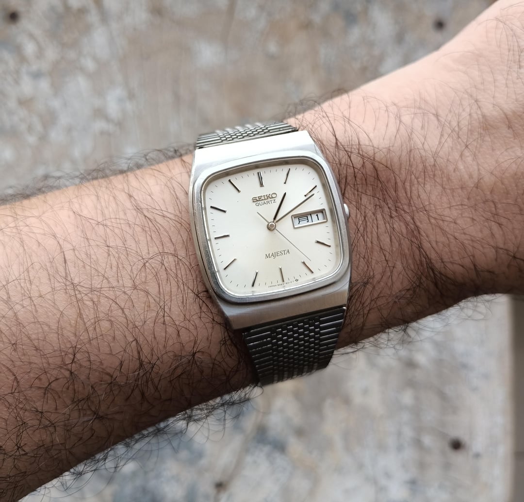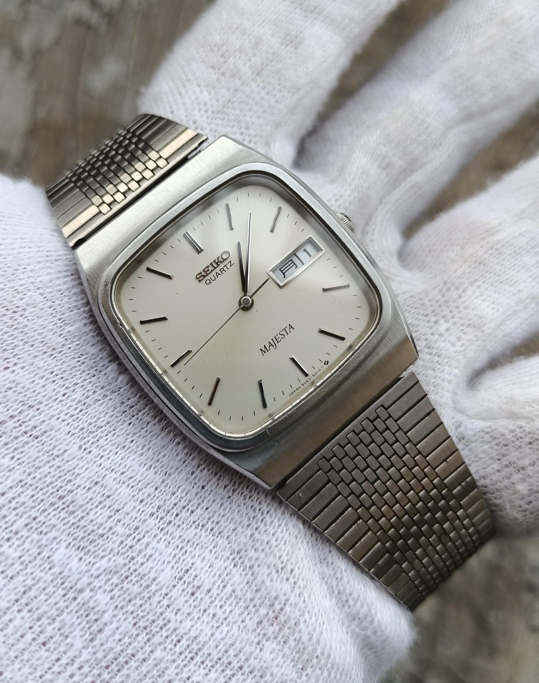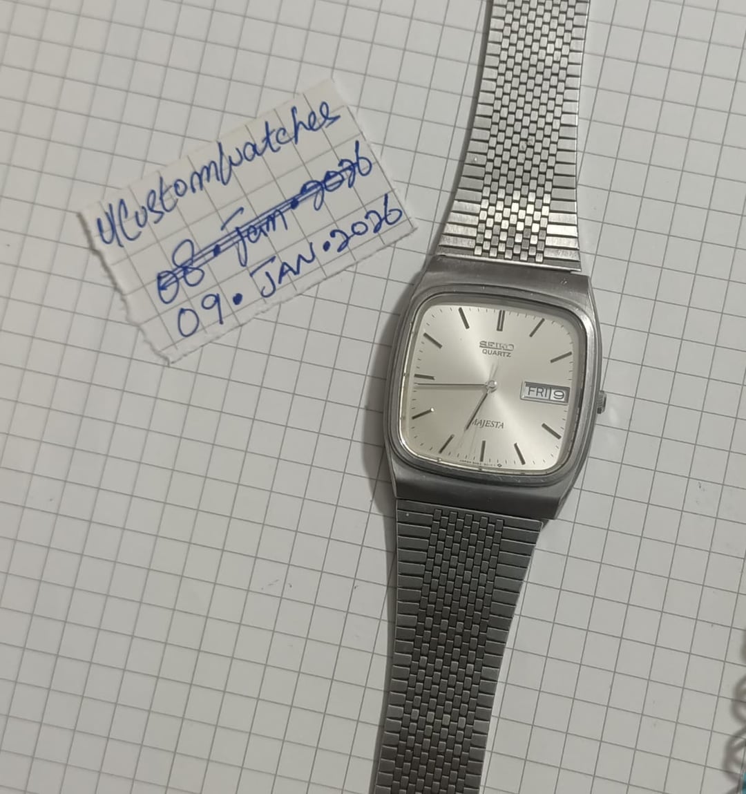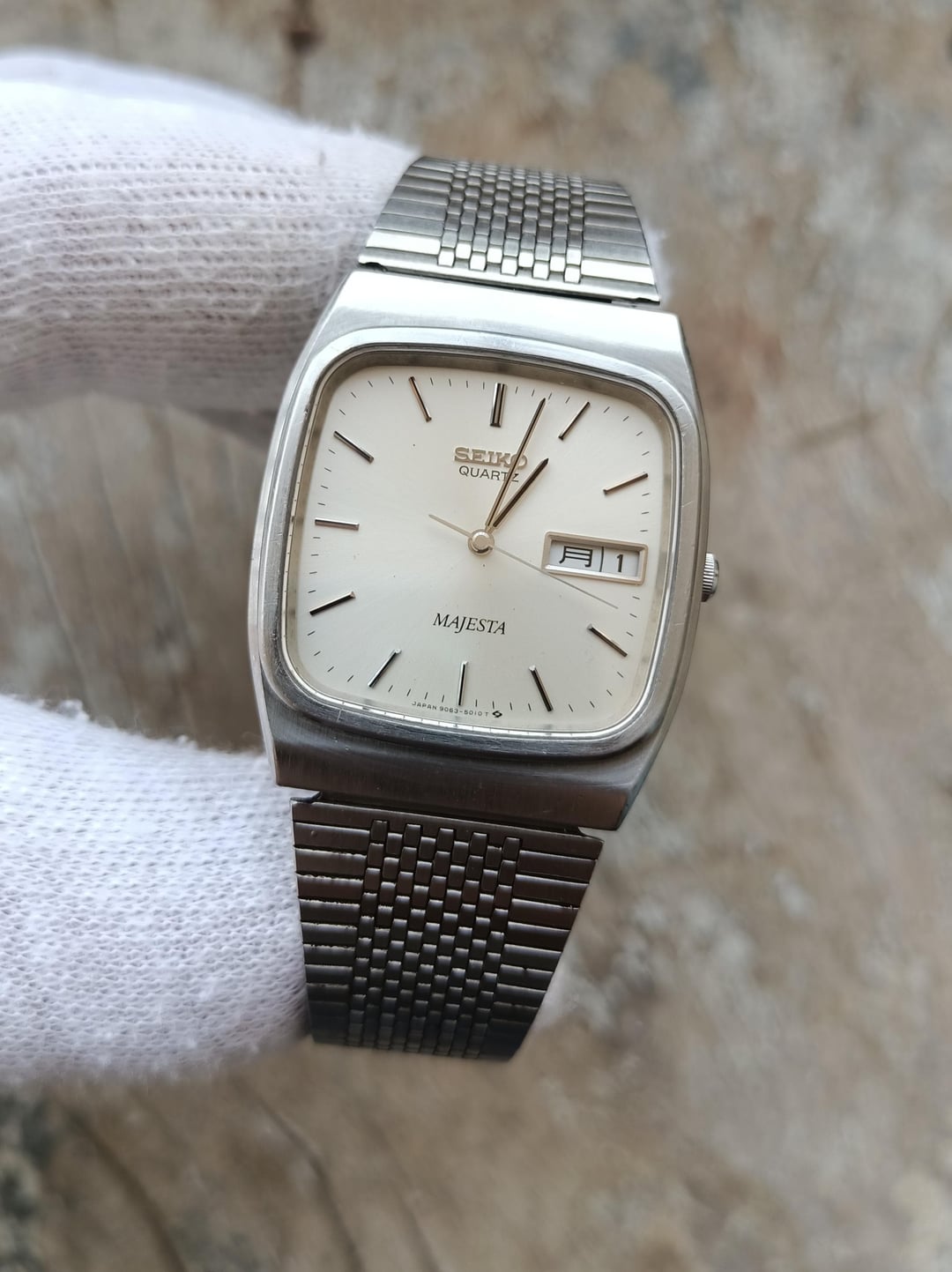 Seiko Majesta Analog Quartz Watch. Ref-9063-5010 AO. Year period 1983. Description and Features: Overall this is in good Working condition. Vintage SEIKO MAJESTA analogue, made in 1980's, all functions operate correctly, keeping good time considering age. Caliber: Seiko 9063A Twin Mode Quartz. Crystal: Mineral Crystal. Movement: Japan Made. Indices: Stick-style markers. Day Display: Bilingual—English and Japanese Kanji. Case Material: Stainless steel. Bracelet After Market. Please see the pictures carefully. SPECIFICATIONS: Movement: Quartz, Case Diameter, 35 mm, Thickness 7 mm, Lug Width 20 mm, Lug to Lug 39 mm, Watch only. Please comment before messaging. Batteries are not allowed to be sent with the watches as per shipping policy. Payment Method: PayPal F&F, Crypto, & Payoneer Only. Shipping Via UPS. Price $230 Shipped. After payment confirmation the scheduled shipping time will be 2-3 working days.