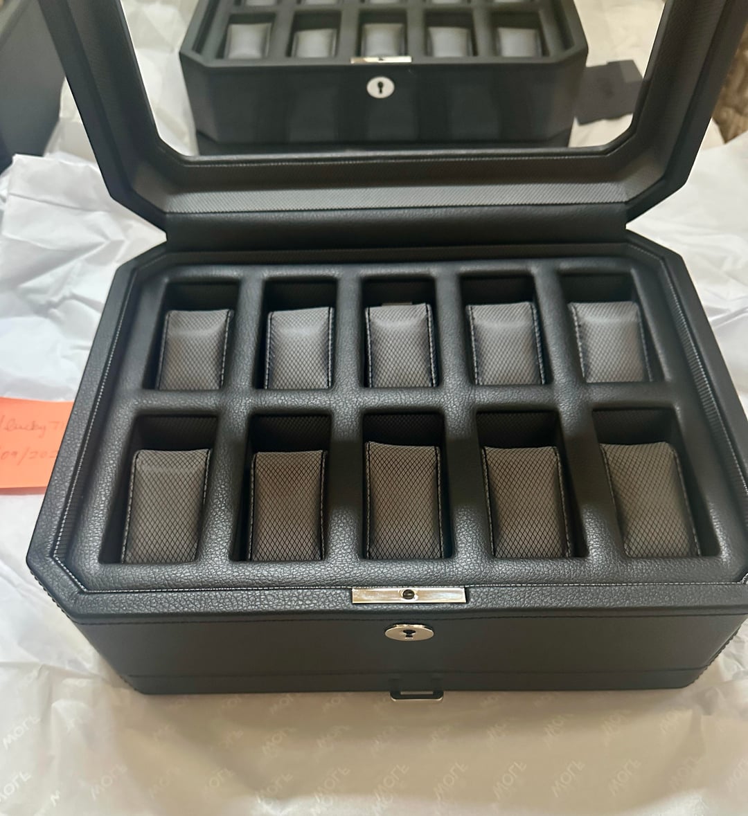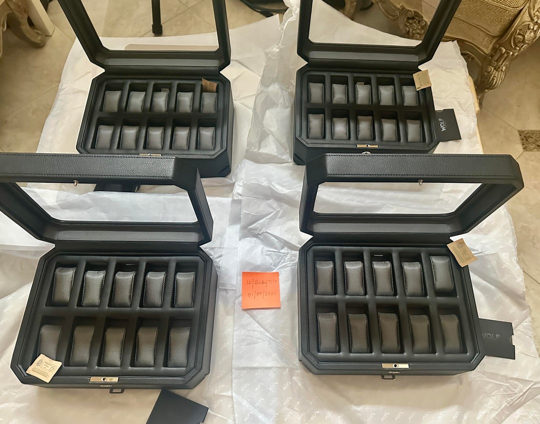 WOLF Windsor 10 pc box with drawer. Features chrome finished hardware, locking glass cover, smooth vegan leather and 10 pc watch and jewelry storage. Color - Black/Grey Condition - BNIB, with original packaging [Product Link](https://www.wolf1834.com/us/windsor-10-piece-watch-box-with-drawer) $195 each, shipped CONUS Zelle (preferred), PayPal FF