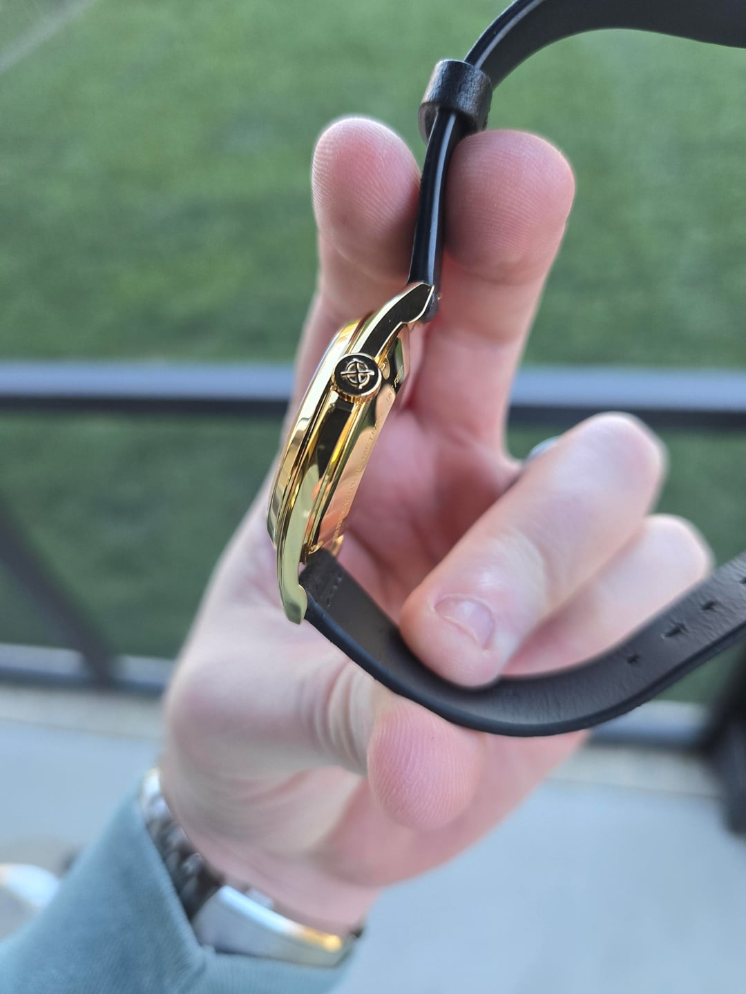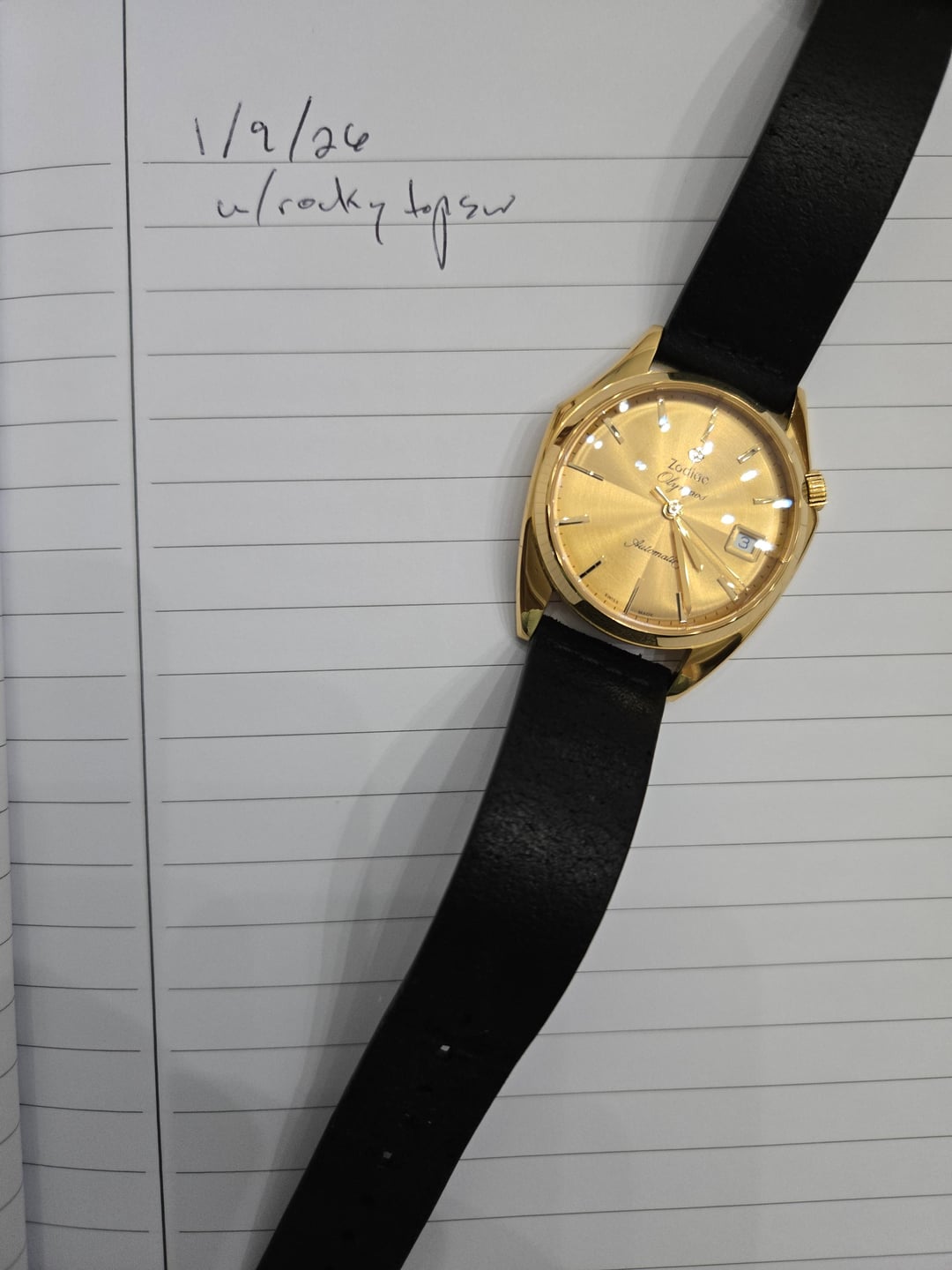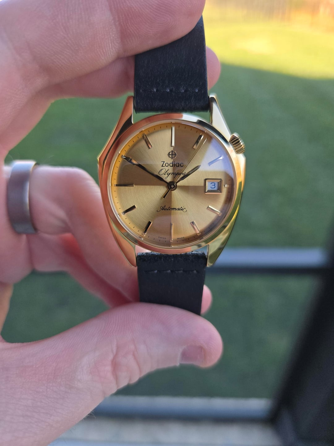 Hi all, I am selling a lightly worn Zodiac Olympos in gold. This watch is beautiful in person and plays really nicely in the light. The combination of the unique case shape with the variable brushing on the dial dividing it into quadrants is very nice. The watch is in excellent shape and comes on the original strap. No major imperfections. I purchased the watch directly from Zodiac in July 2024, so the watch comes with full kit and remaining warranty to July 2026. Asking 400$ shipped to the CONUS. Case size – 37.5mm (wears a little larger d/t the case shape) Lug width – 19mm Sapphire crystal WR – 5atm Movement – STP3-13 Here is a brief review of the watch: [https://www.ablogtowatch.com/zodiac-olympos-watch/](https://www.ablogtowatch.com/zodiac-olympos-watch/) Let me know if you have any questions!