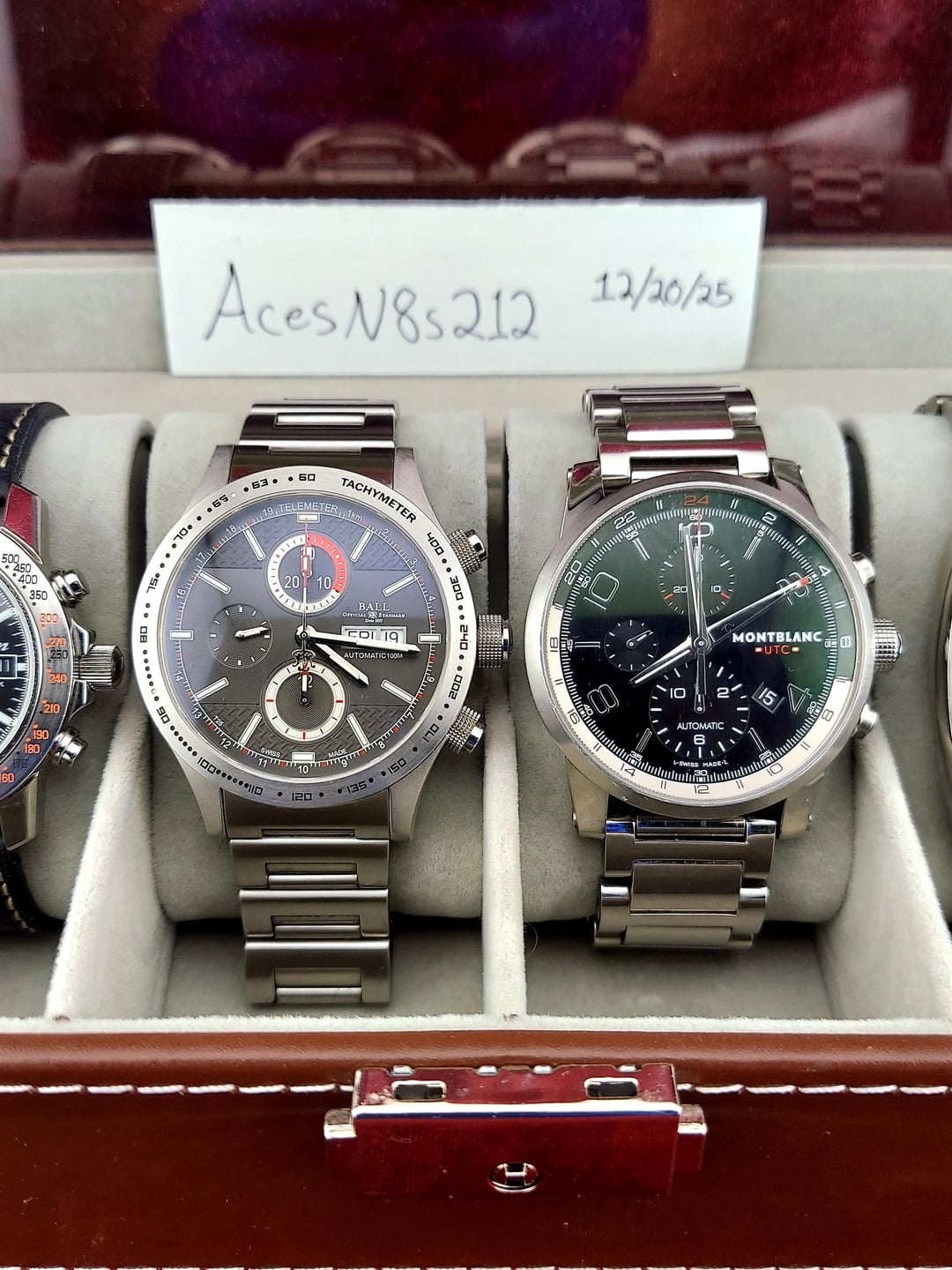Sorry for any formatting issues - I'm reposting the watch details here and in another post as they appear to have been deleted. Watch: Sinn 303 Autobahn Chronograph – More Photos: [https://imgur.com/a/OFqwUIw](https://imgur.com/a/OFqwUIw) * Reference Number: 303.1041 * Condition: The watch needs a new crown as the current one’s crown-stem interface is stripped. The watch is otherwise in good mechanical condition and keeps time within 1 minute per day, with all chronograph functions working correctly. - Cosmetically, the watch is in good preowned condition with light scuffs/hairlines visible in certain light – 8.5/10 * Wrist Size: Up to 20cm (7.8 inches) * Case Size: 40mm (42mm with crown guards) * Notes/Extras: None * Price: $999 OBO Montblanc TimeWalker UTC Chronograph - More Photos: [https://imgur.com/a/ovqZUxN](https://imgur.com/a/ovqZUxN) * Reference Number: 7263 * Condition: Preowned – 8.5/10 * Wrist Size: 18 cm (7 inches) * Case Size: 43mm * Notes/Extras: Currently on a non-OEM bracelet. Can be switched for brand new leather Montblanc strap & buckle on request. In some of the linked pics there are some fingerprints on the crystal that make the glass, hands, or dial look scratched. This is just an illusion as they are actually in perfect condition. * Price: $1199 OBO Ball Fireman Stormchaser Chronograph - More Photos: [https://imgur.com/a/kXBMvH8](https://imgur.com/a/kXBMvH8) * Reference Number: CM2092C * Condition: Preowned – 9.5/10 Excellent * Wrist Size: Up to 20cm (7.8 inches) * Case Size: 43 mm * Notes/Extras: None * Price: $899 OBO * SOLD!