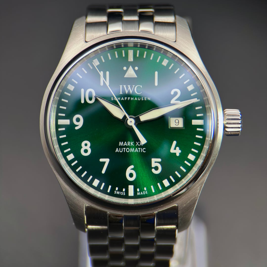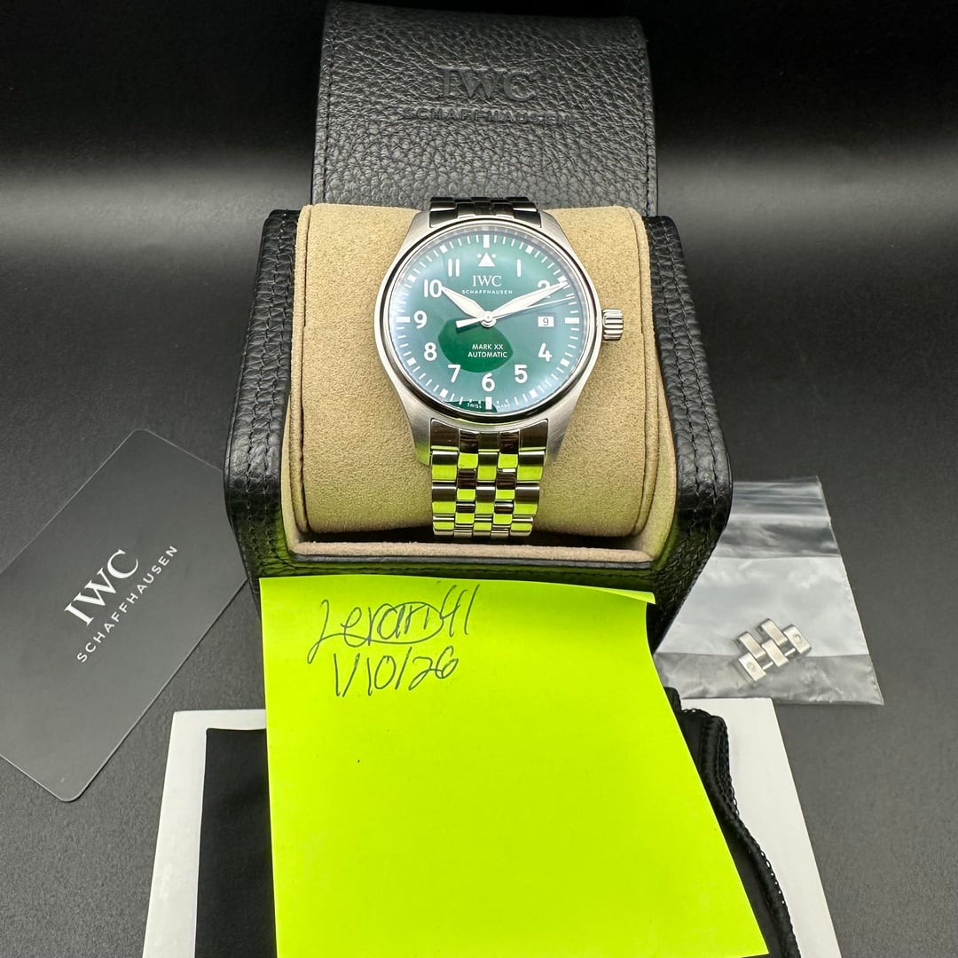 IWC Pilot’s Watch Mark XX – Green Dial Reference: IW328206 A modern evolution of IWC’s legendary pilot watch, the Pilot’s Watch Mark XX delivers exceptional legibility, robust engineering, and timeless aviation design. Building on the heritage of the iconic Mark series, this model refines proportions and performance for contemporary everyday wear. The 40mm stainless steel case is paired with a striking green dial, offering a fresh yet understated take on the classic pilot aesthetic. Bold white numerals and hands ensure outstanding readability, while the anti-reflective sapphire crystal provides clarity in all lighting conditions. Powered by the IWC-manufactured Caliber 32111, the Mark XX offers an impressive 120-hour (5-day) power reserve, enhanced durability, and modern reliability. Finished on a stainless steel bracelet with IWC’s quick-change system, this watch is a versatile tool watch that transitions effortlessly from casual to professional wear. Key Details & Specifications * Brand: IWC Schaffhausen * Model: Pilot’s Watch Mark XX * Reference: IW328206 * Case Size: 40mm * Case Material: Stainless Steel * Dial: Green * Movement: IWC Manufacture Caliber 32111 (Automatic) * Power Reserve: Approximately 120 hours * Crystal: Sapphire crystal, anti-reflective on both sides * Water Resistance: 100 meters * Bracelet: Stainless steel with quick-change system Fear Not this particular piece has an international warranty until 2031 MSRP: 6,800.00 Asking $5,549.00 Shipped Fully Insured Overnight Includes: Box, Travel Case, Links, Cloth, Booklet, 2023 warranty Card Condition & Authenticity The watch presents in excellent condition, with light signs of wear consistent with careful ownership. Please reference the photos for the most accurate representation of condition. All watches are 100% authentic and thoroughly inspected prior to listing. Seller Confidence Buy with confidence from a trusted, vetted watch dealer with extensive transaction history and 100% 5-star feedback across platforms. I pride myself on smooth, transparent transactions and exceptional customer service. A buy-back program is available on all pieces.