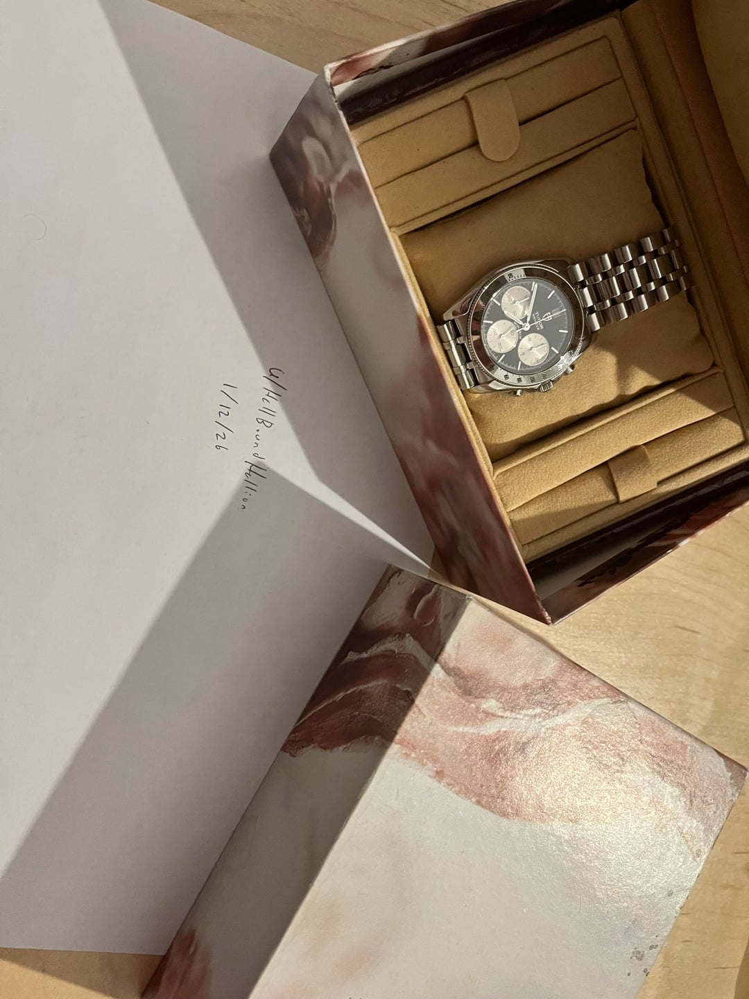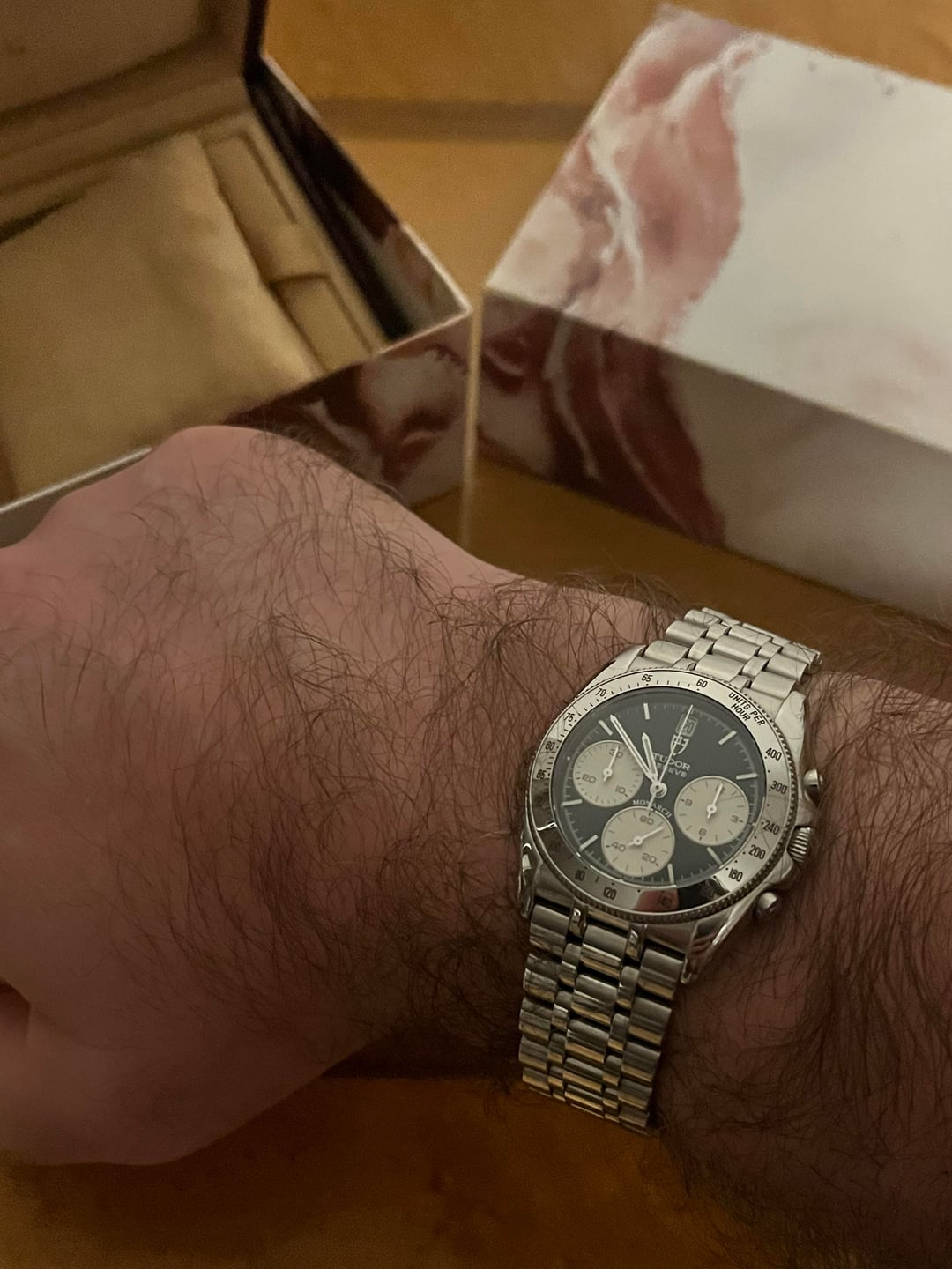 Hi r/watchexchange! Selling a Tudor Monarch 15900 chronograph with boxes, papers, manuals, red Tudor “wax seal” hang tag. The watch has gorgeous champagne subdials, and some minor scratches throughout, as pictured. Can be polished out easily if need be. Perfect fit at 37mm-38mm wide, 20mm wide bracelet, 10mm thick. Papers date the watch to 2002. Nice smooth chrono seconds sweep from the mecha quartz, ticking seconds at 6pm subdial. Watch shown on an 8-1/4” wrist. I have another original Tudor bracelet for the watch as well, that I had sourced to purchase more links that I will include with this sale. Feel free to reach out with any questions or requests. Asking $2,599 for the full kit shipped insured in the USA, OBO! Trades welcome. Thanks for looking!