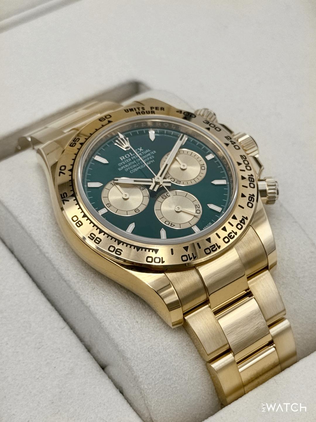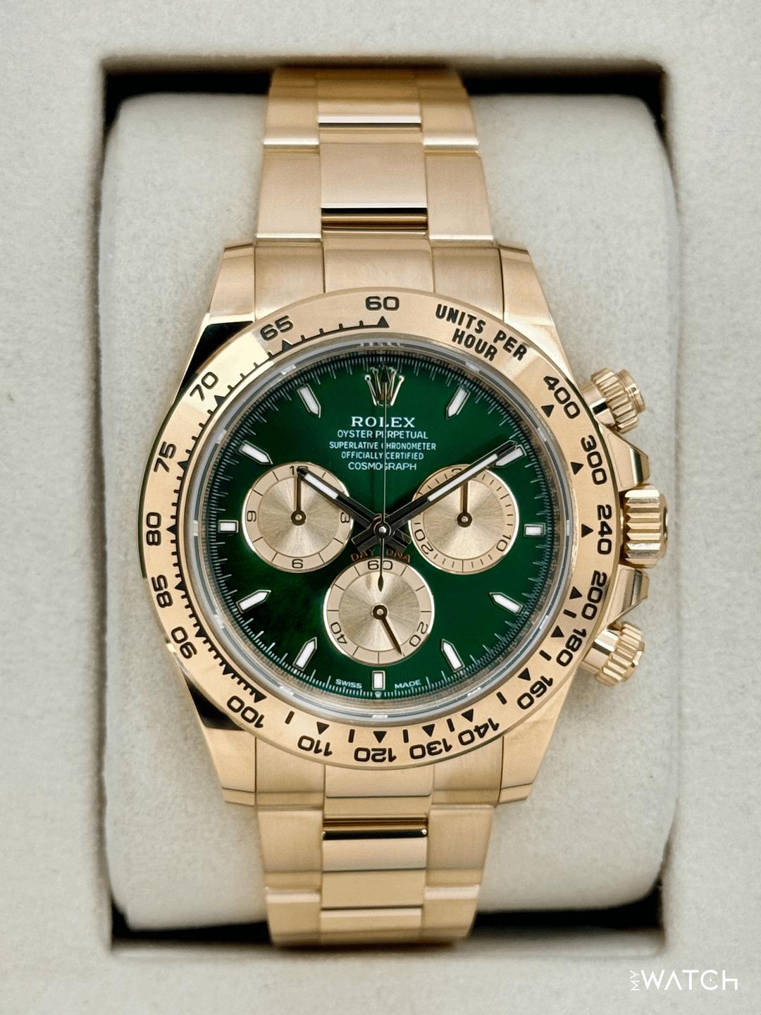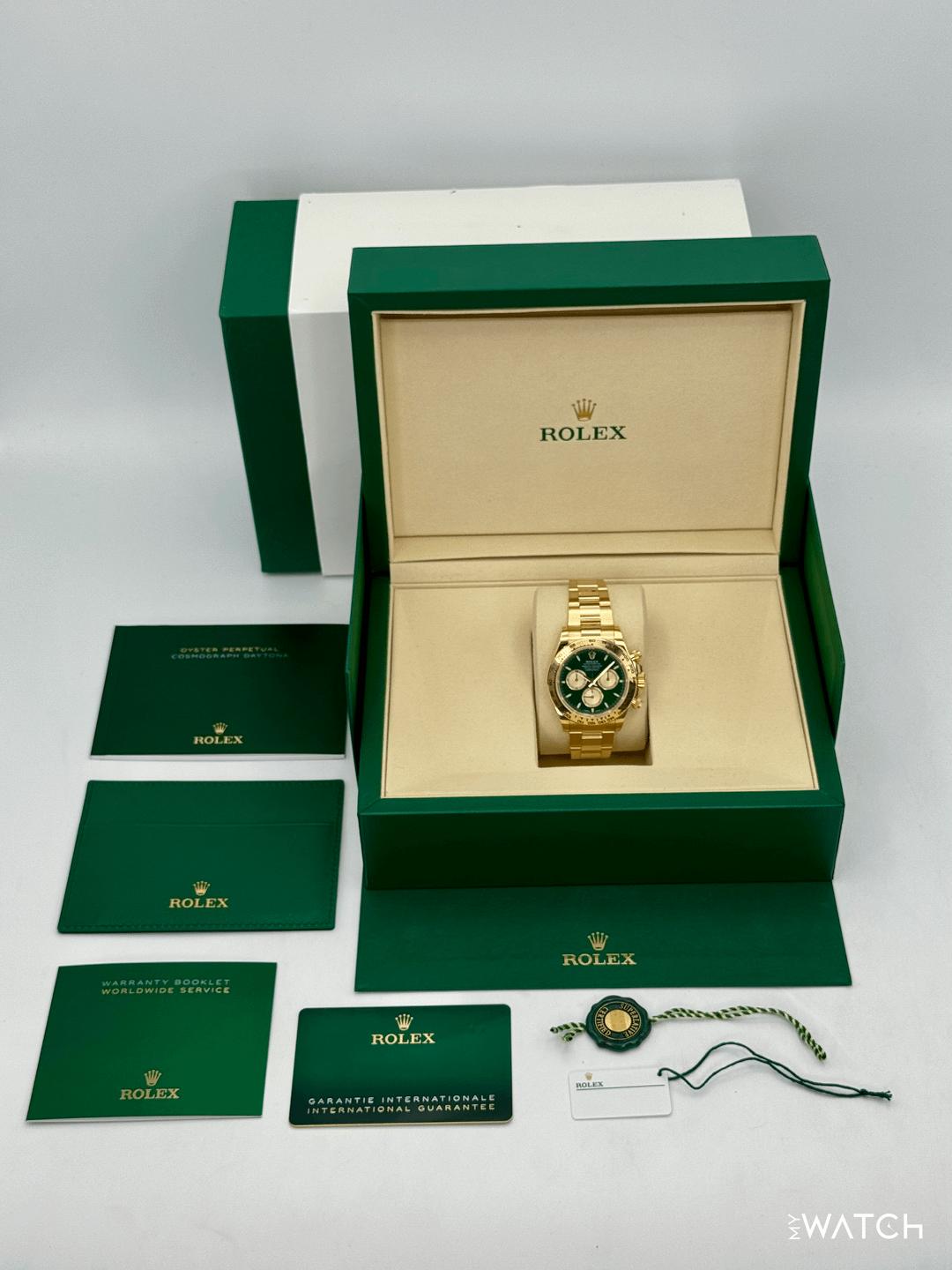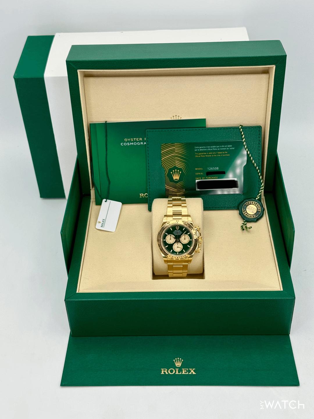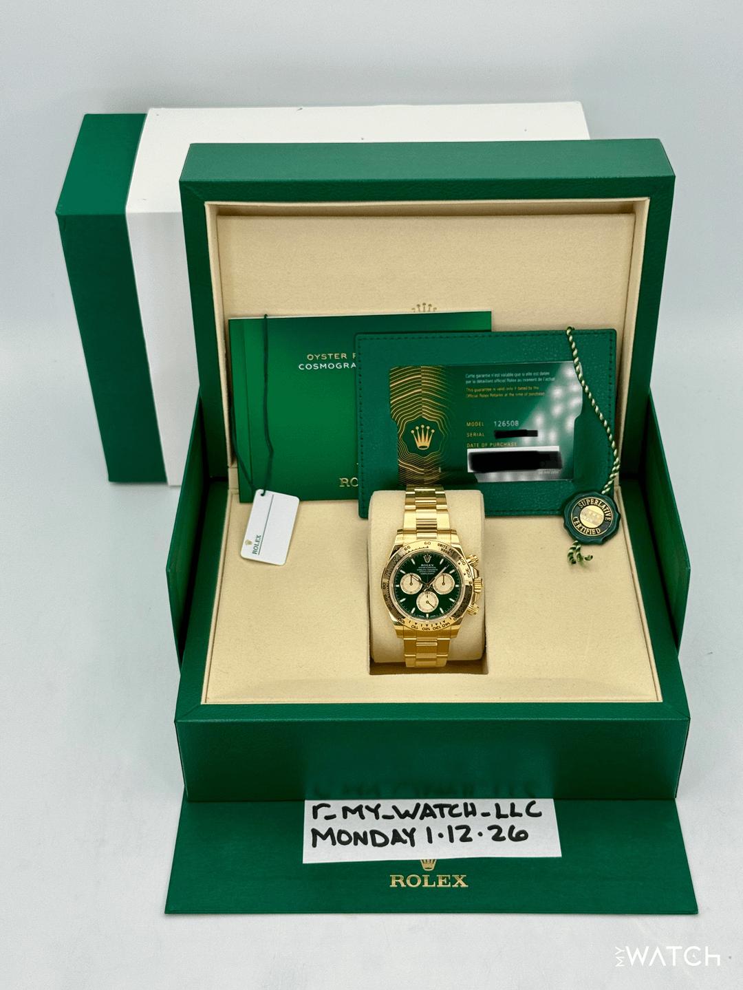 🔵**2025 Rolex Cosmograph Daytona "John Mayer" 40mm 126508 18kt Yellow Gold Oyster Bracelet Bright Green and Golden Dial** 🔵**TRADE or SELL us your luxury watch, all brands considered. Message me details.** **Includes the following:** **✔️BRAND NEW 2025 UPDATED ROLEX BOX (DOUBLE BOXED)** **✔️NEW RELEASE Q2 2025 - "JOHN MAYER 2.0"** **✔️Box and Papers - Yes** **✔️Warranty card dated October 2025** **✔️5 year manufacturer warranty** **✔️Manual and Warranty booklets** **✔️Green and White Hang Tags Included** **✔️Material: 18K Yellow Gold** **✔️Size: 8.0inch wrist (Full Links)** **✔️Watch is in excellent overall condition. Please see photos for details.** **✔️**[**Trades**](https://mywatchllc.com/pages/sell-rolex-watch) **welcome** Business Name: **My Watch LLC** LOCATION: Oak Park, Michigan ✔️[MyWatchLLC.com](http://mywatchllc.com/) for current inventory ✔️Google Business Listing [https://g.co/kgs/Cmd6FPW](https://g.co/kgs/Cmd6FPW) ✔️Business Hours M-F 9-6 ✔️Facetime/Video chat/calls welcome to view the watch interested. ✔️Contact: 248-422-0909 via text or call for quickest response. 🟢TERMS: Visit [MyWatchLLC.Com](http://mywatchllc.com/) for payments accepted 🟢REFERENCES/REVIEWS: We are well reviewed on all platforms from google, trust pilot, rolexforums, additionally we have 300+ reference in multiple FaceBook watch groups, reference checks welcome. 🟢SHIPPING: If you are not local, we offer Fully Insured FedEx overnight shipping in the USA for a fee. International shipping available. [https://mywatchllc.com/products/2025-rolex-daytona-john-mayer-40mm-126508-yellow-gold-green-dial](https://mywatchllc.com/products/2025-rolex-daytona-john-mayer-40mm-126508-yellow-gold-green-dial)