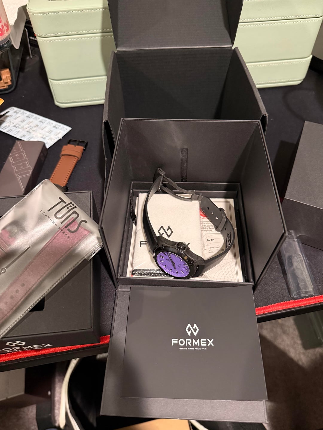 Price is $1,649 + shipping obro. (MSRP $1995) First owner. Shipping to US via USPS or UPS. NY based. Zelle preferred with PayPal F&F, PayPal G&S+3.5% and Venmo with References as an option. Watch to be shipped within next 1-2 business days after payment. Case Size: 43mm Movement: selita COSC Case Back: exhibition Crystal: Sapphire crystal Band: quick change rubber with carbon microadjust clasp Water Resistant: 100m Lume: Yes Lug width: 22mm curved Fits true to size. Super cool cnc dial. Case has a suspension mechanism, Reliable movement. Will throw in the extra purple tuns strap. First owner! LNIB, super rare summer splash colorway and size! 36 month Warranty intact until late 2028! Comes with Inner and outer Box, strap, manual, warranty