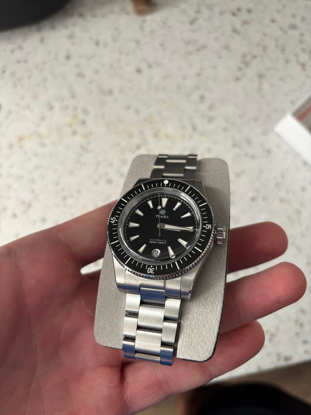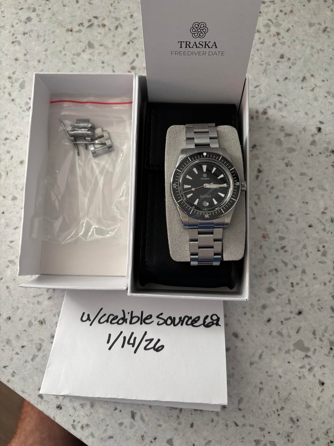 For sale is a Traska Freediver V7 Date in Carbon Black. I bought it a couple months ago and just haven’t worn it as much as I intended to. Mostly worn on strap so bracelet has virtually no wear. Case has no wear or scratches either. I think this partly due to their coating that is applied. Awesome watch that deserves more wrist time. Full box, papers and links. $525 shipped!
