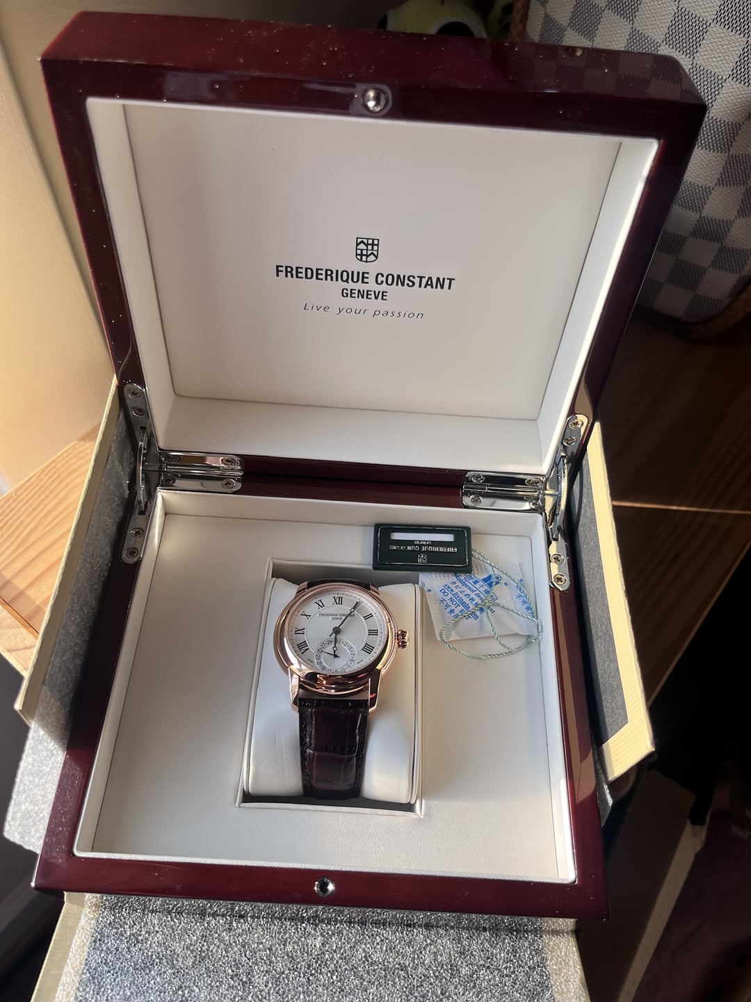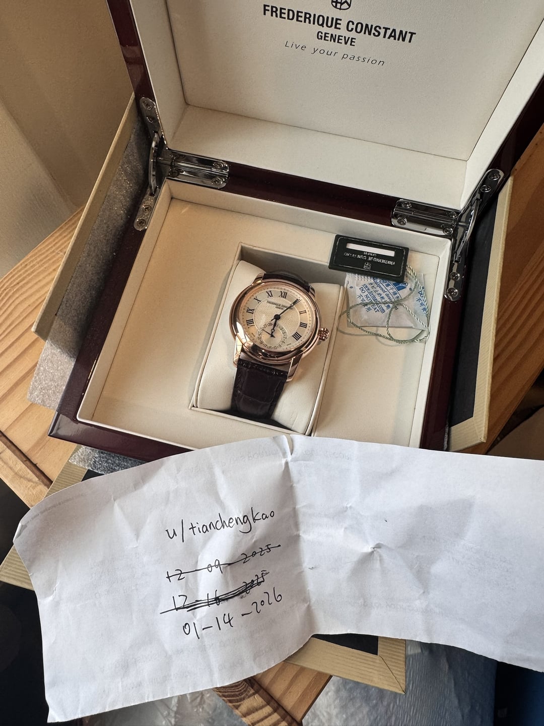 Up for sale is a Frederique Constant Manufacture Classic (Ref. FC-710MC4H4), an elegant and sophisticated timepiece powered by the brand’s in-house automatic movement (Caliber FC-710). A fantastic value in the world of Swiss horology, offering true manufacture pedigree at an accessible price point. This watch selling I am the first and only owner. Purchased while I travel to CA long time ago as a personal gift. And then it’s in the safe and I am diving into other hobbies and only wear Rolex oyster. So this watch is too beautiful for me and I don’t really have the occasion to wear it. My photo including original purchased price. on the original invoice and original receipt of payment. of $2983.75 Watch is full sets with all accessories come with it. Watch condition is near mint. No any visible damage or scratches. From the buckle and back glass. There is still transparent film on it never removed This is my first sell at watch exchange. But I have over 300 trade transaction at r/knife_swap. More than 150 transaction were loged and get reviewed from buyer. Value are well above $50000 of total worth. And you can check recent sold couple knives within 45 days. I have good experience on handle those trade business and will have best package and shipping experience to make sure your watch is safe during the transaction. and fully insured. So this can be your Christmas gift and wear on your Christmas family party. And you will be shine. Watch will be shipping from VA. USA Specs & Features: Exquisite Swiss Made Automatic Movement. Caliber FC-710. 26 Jewels. 28,800bph. Power Reserve of 38 Hours. Day Counter at 6 O'clock. 42mm x 11.6mm Rose Gold Plated Stainless Steel Case. Sapphire Crystal with Exhibition Caseback. Silver Guillochè Dial. Printed Roman Numeral Indexes. Black Stainless Steel Hands. Brown Calfskin Leather Strap with Rose Gold Plated Stainless Steel Deployment Buckle. Water Resistant to 50 Meters 5 ATM - Swiss Made This Watch is Brand New and comes with all the Correct Papers and Box Price: $1850 Shipped – priced to sell (will fully insured and mail with UPS 2 DAY air) CONUS shipping, fully insured. Zelle or Venmo FF. Pics & timestamp in the listing. This is a great watch for the money, especially with an in-house movement Then feel free to chat with questions.
